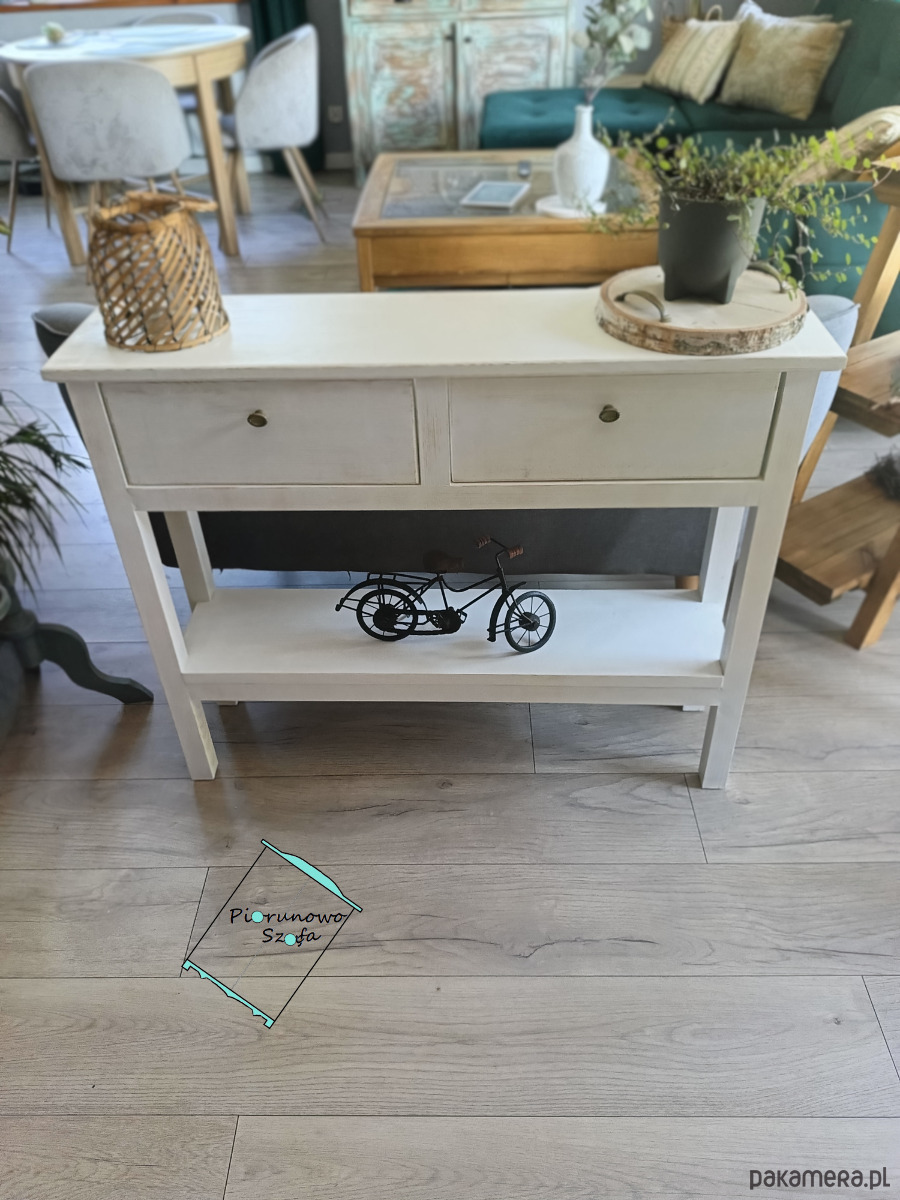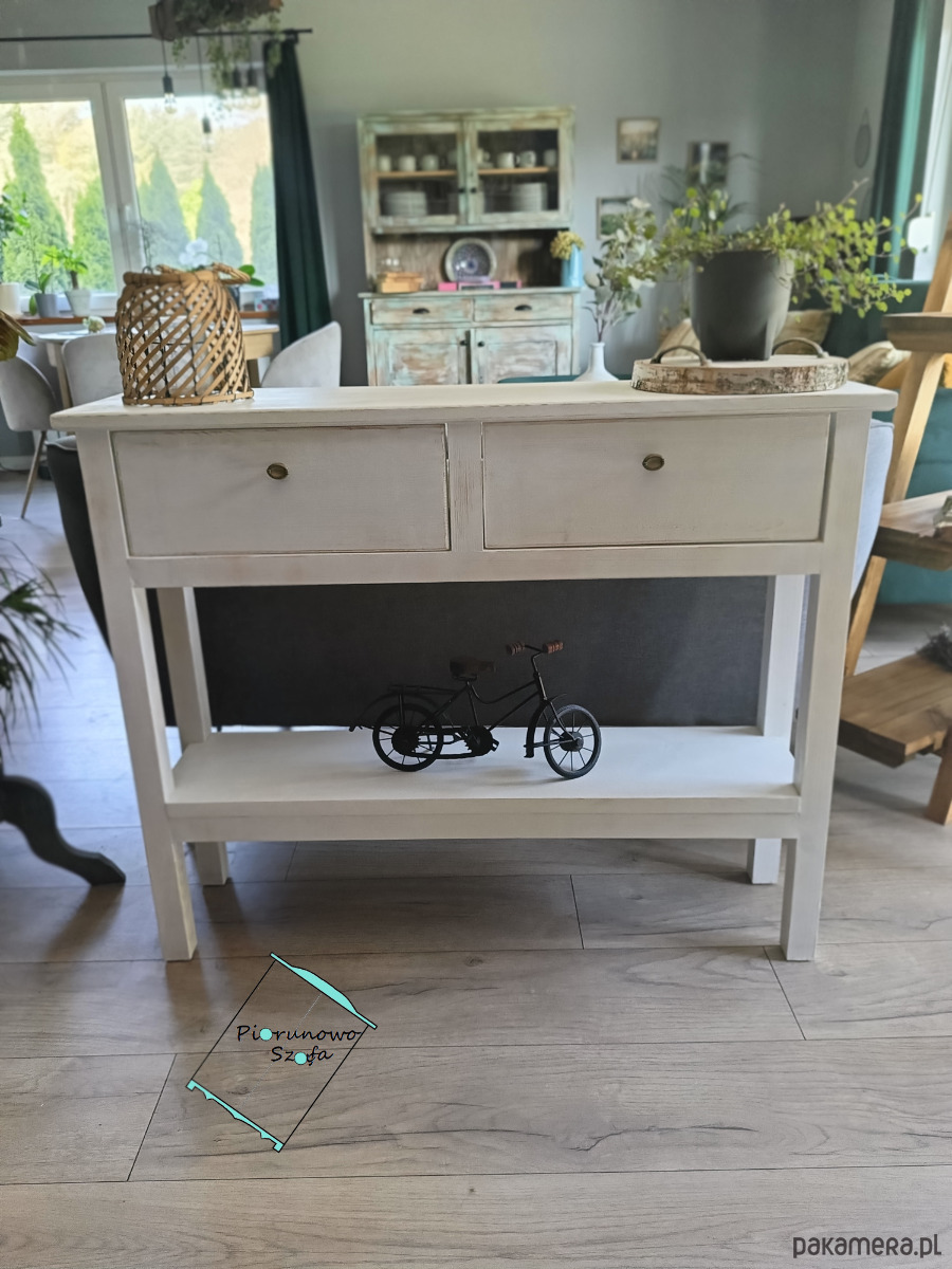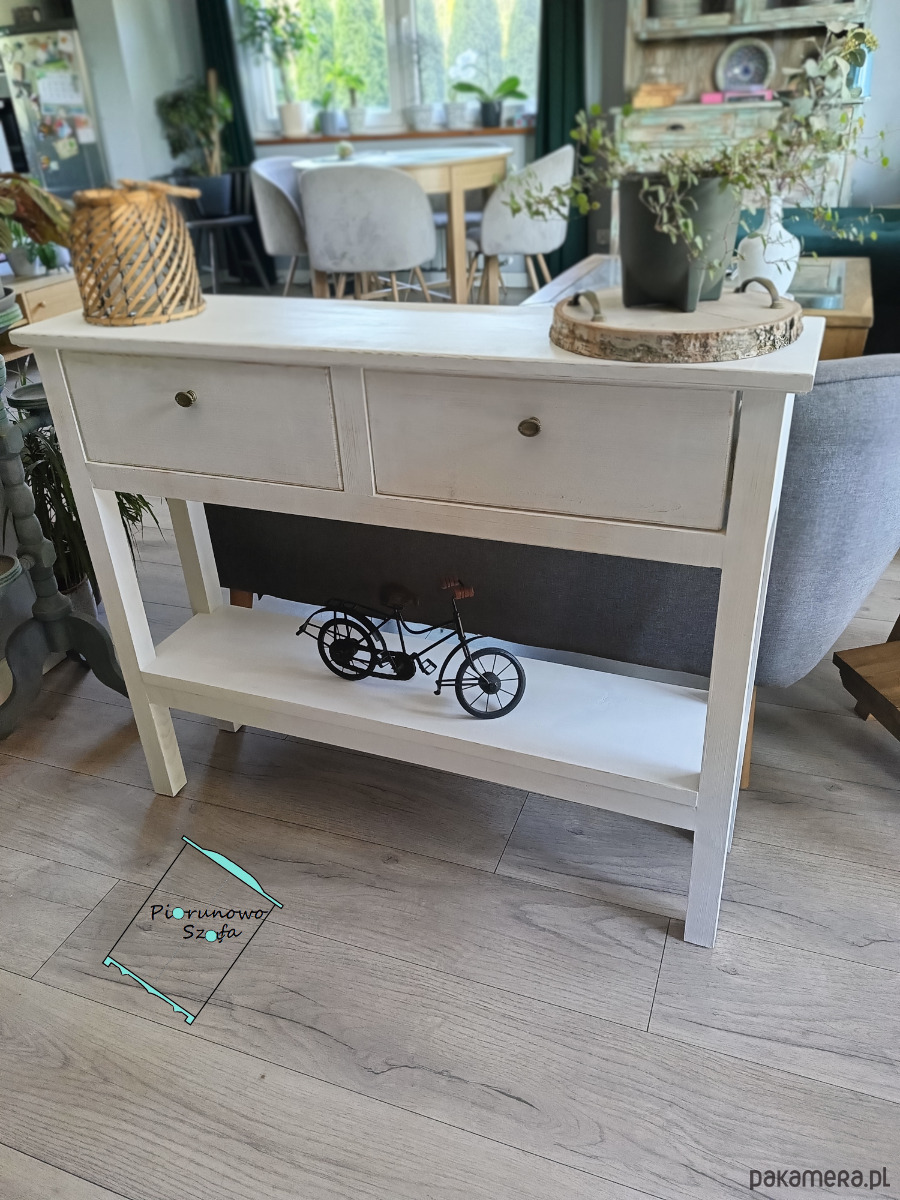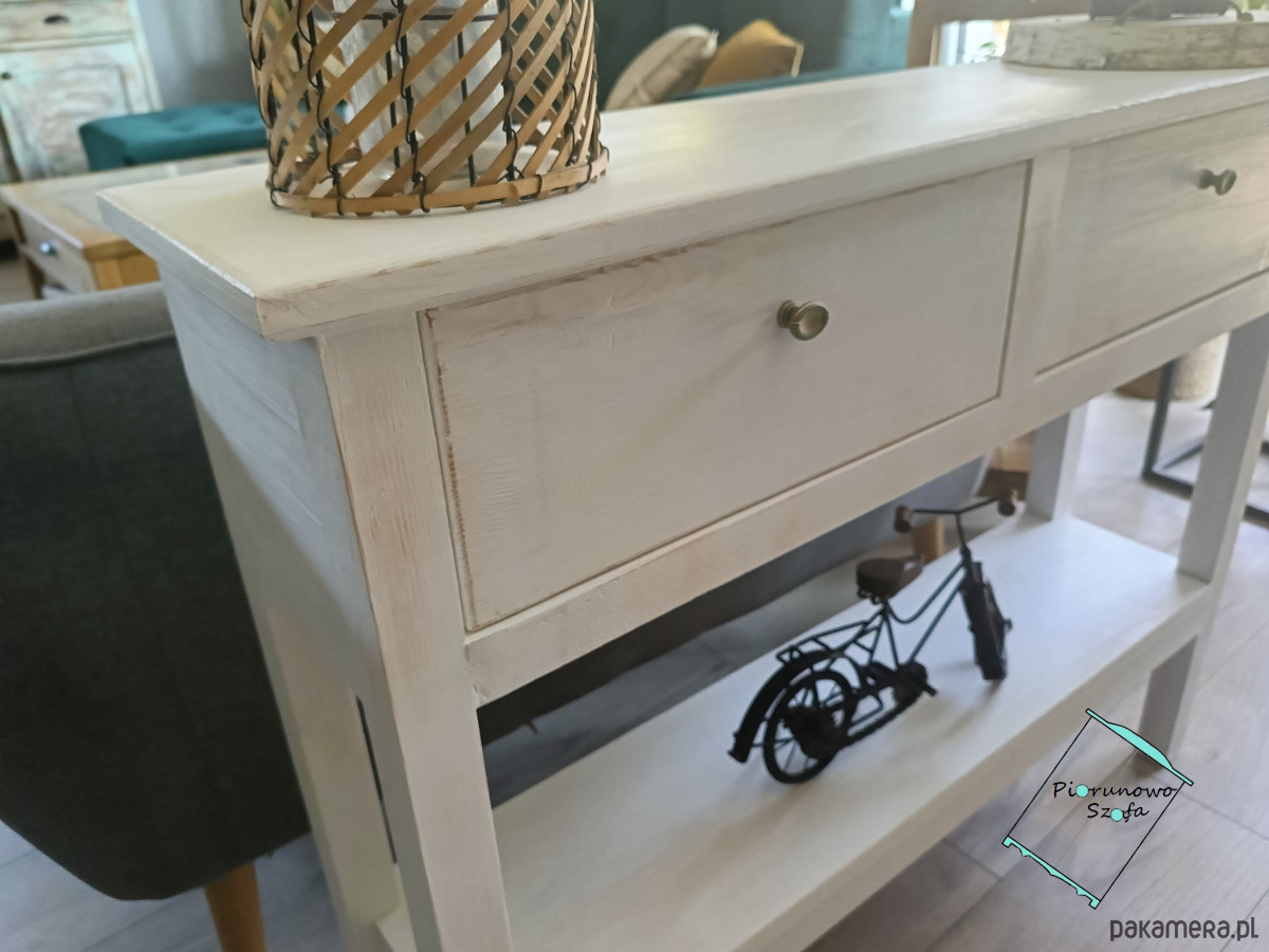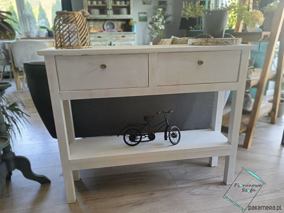 Chcieli byśmy Państwu przedstawić Komodę, konsolę regał półkę drewnianą z 2 szufladami w stylu vintage koloru biały matowy przecierany