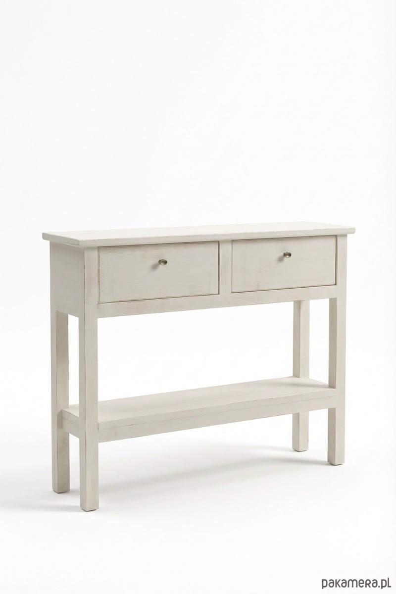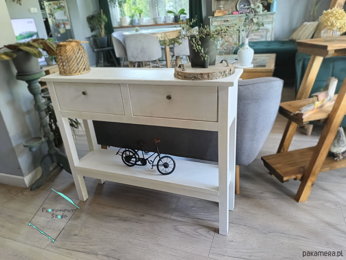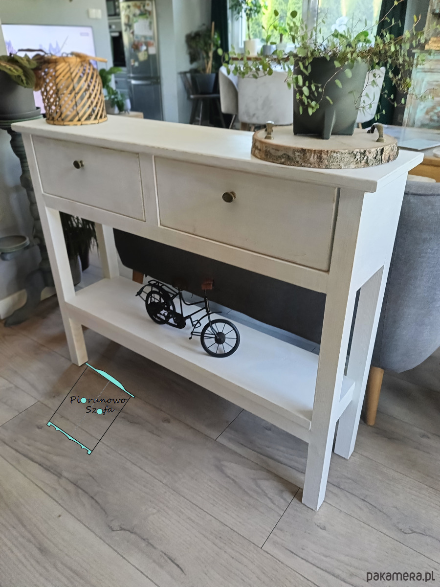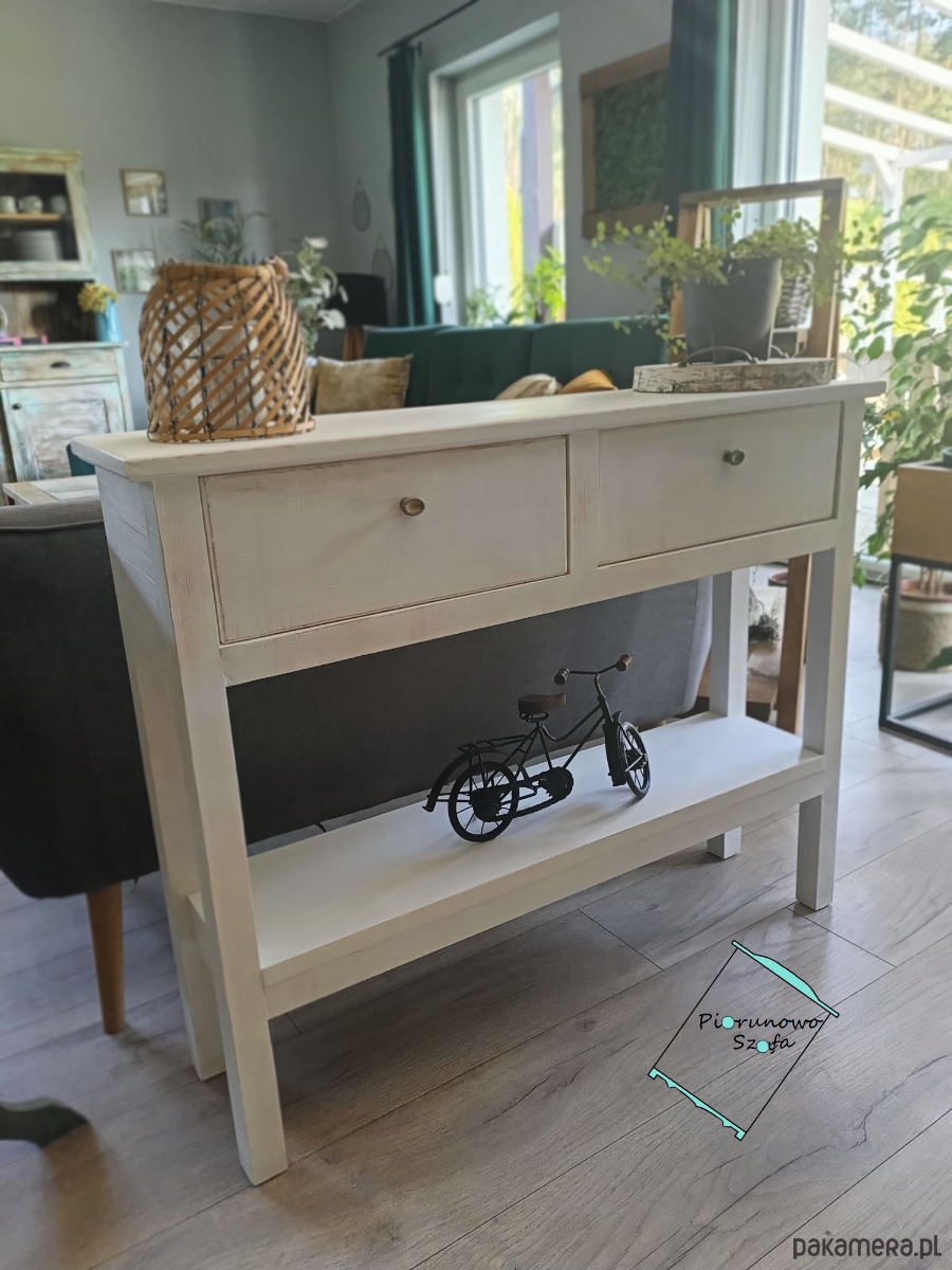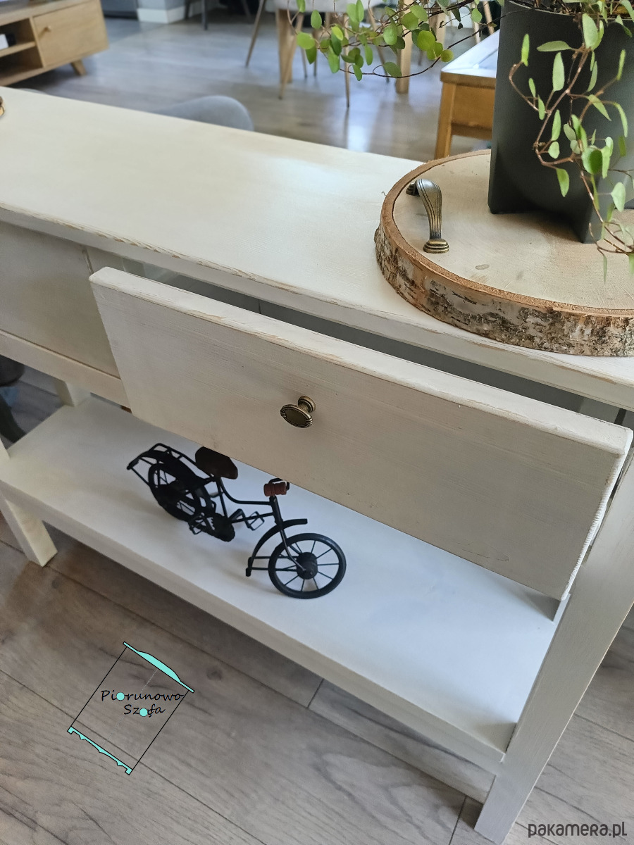 Chcieli byśmy Państwu przedstawić Komodę, konsolę regał półkę drewnianą z 2 szufladami w stylu vintage koloru biały matowy przecierany