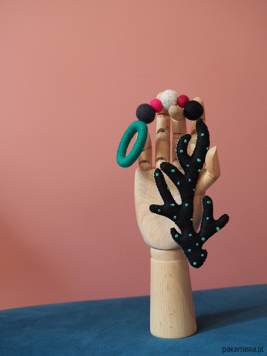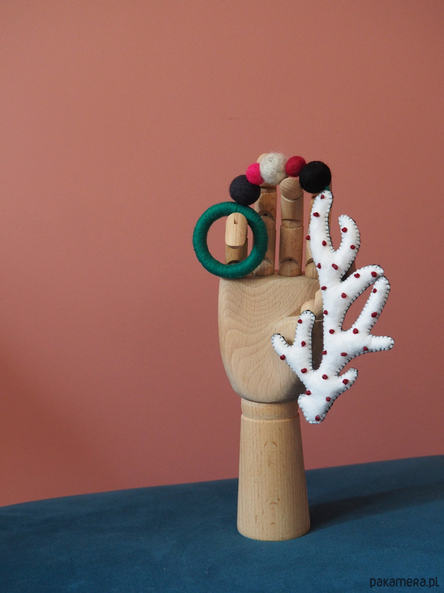 -zawieszka wykonana z wełnianych kulek oraz drewnianego gryzaka obleczonego bawełnianą nicią