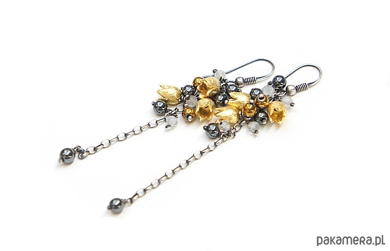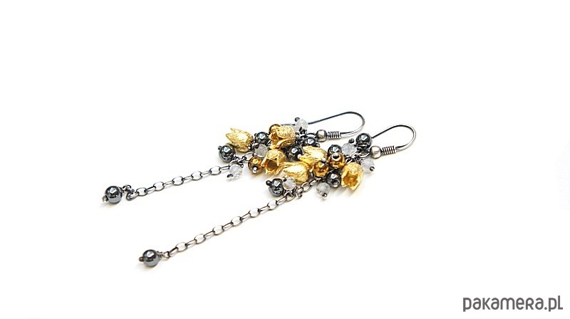 Kolczyki wykonane ze srebra i srebra pokrytego 24k złotem [pr. 925] w połączeniu z miniaturkami dzwoneczków [7mm], fasetowanymi kuleczkami topazów [3mm] oraz hematytami [ 4mm]. Srebro częściowo oksydowane i przetarte. Całkowita długość kolczyków 7,8cm. Biżuteria ozdobnie zapakowana.