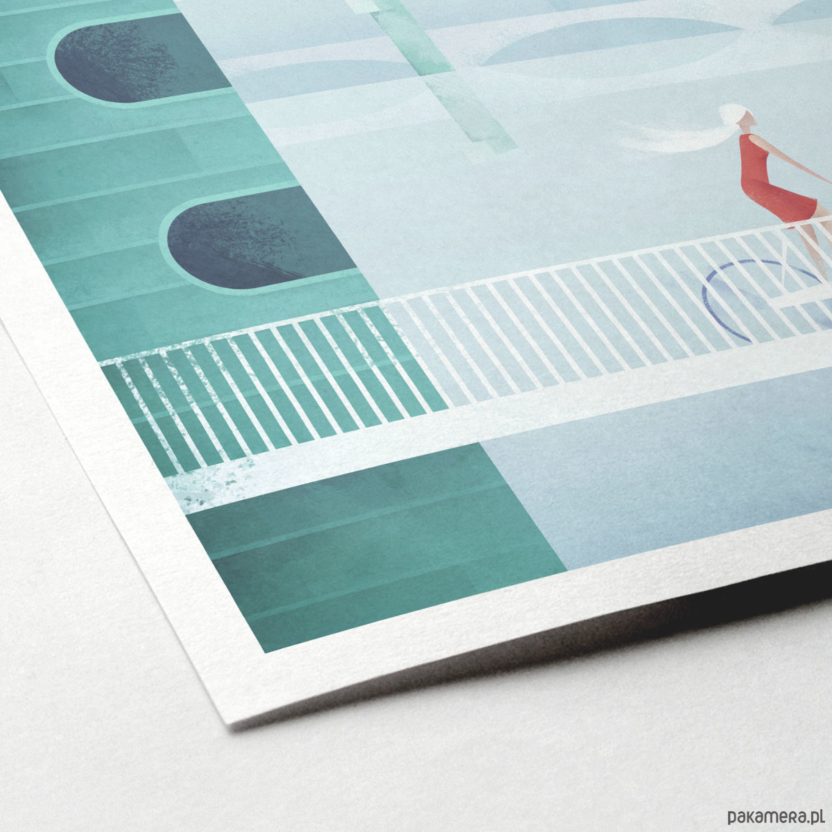 Plakat w stylu vintage przedstawiający rowerzystkę przejeżdżającą przez most Knippelsbro. W tle widoczna jest panorama Kopenhagi z nowoczesną biblioteką Black Diamond oraz barokowym Kościołem Najświętszego Zbawiciela z jego charakterystyczną spiralną wieżą.