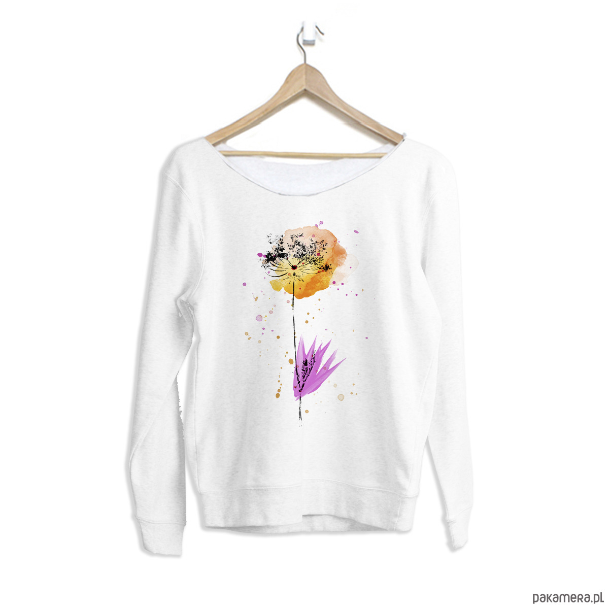 Nadruk cyfrowy. Szeroki dekolt odkrywający ramię. Cięte wykończenie dekoltu, rękawy i dół bluzy ze ściągaczami.