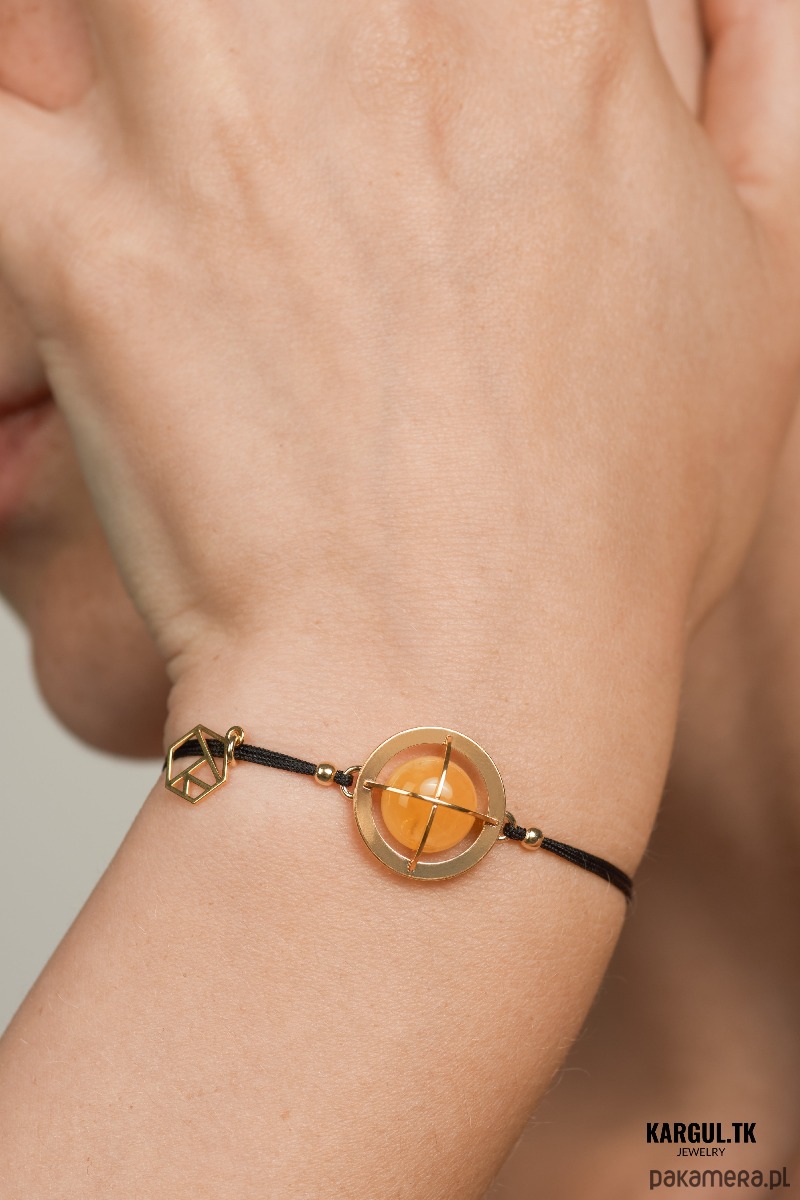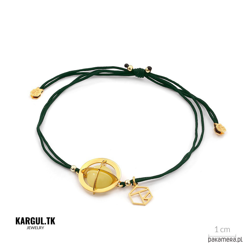 Bransoletka wykonana jest ze srebra próby 925, pokrytego warstwą złota, sznurek wykończony został pozłacanymi kuleczkami oraz logo KARGUL.TK.