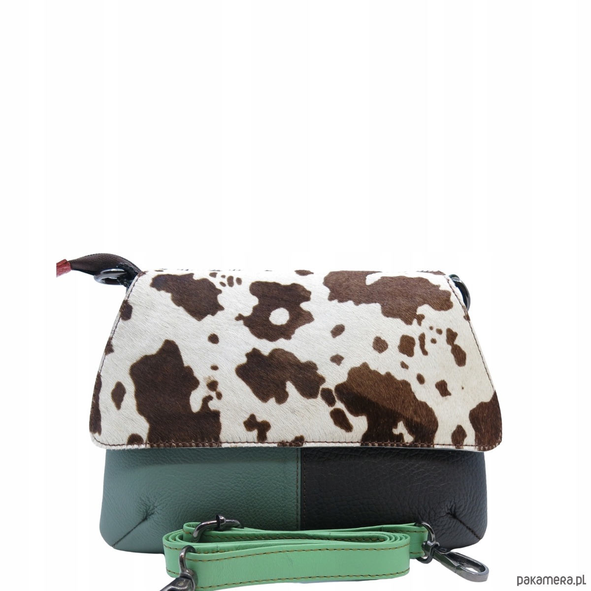 jedna strona klapki wykonana z naturalnej skóry, druga zaś ze skóry z naturalnym włosiem z nadrukiem
