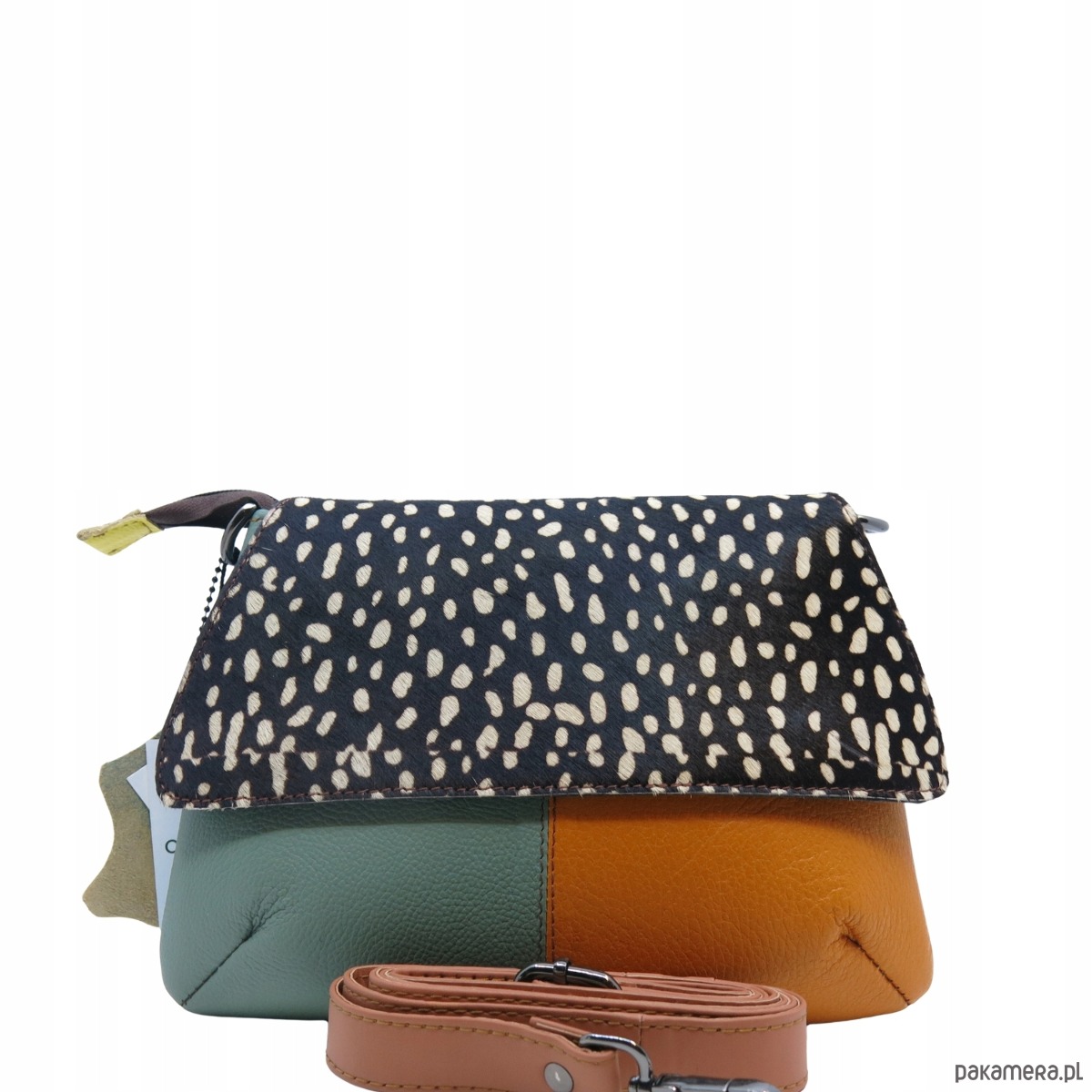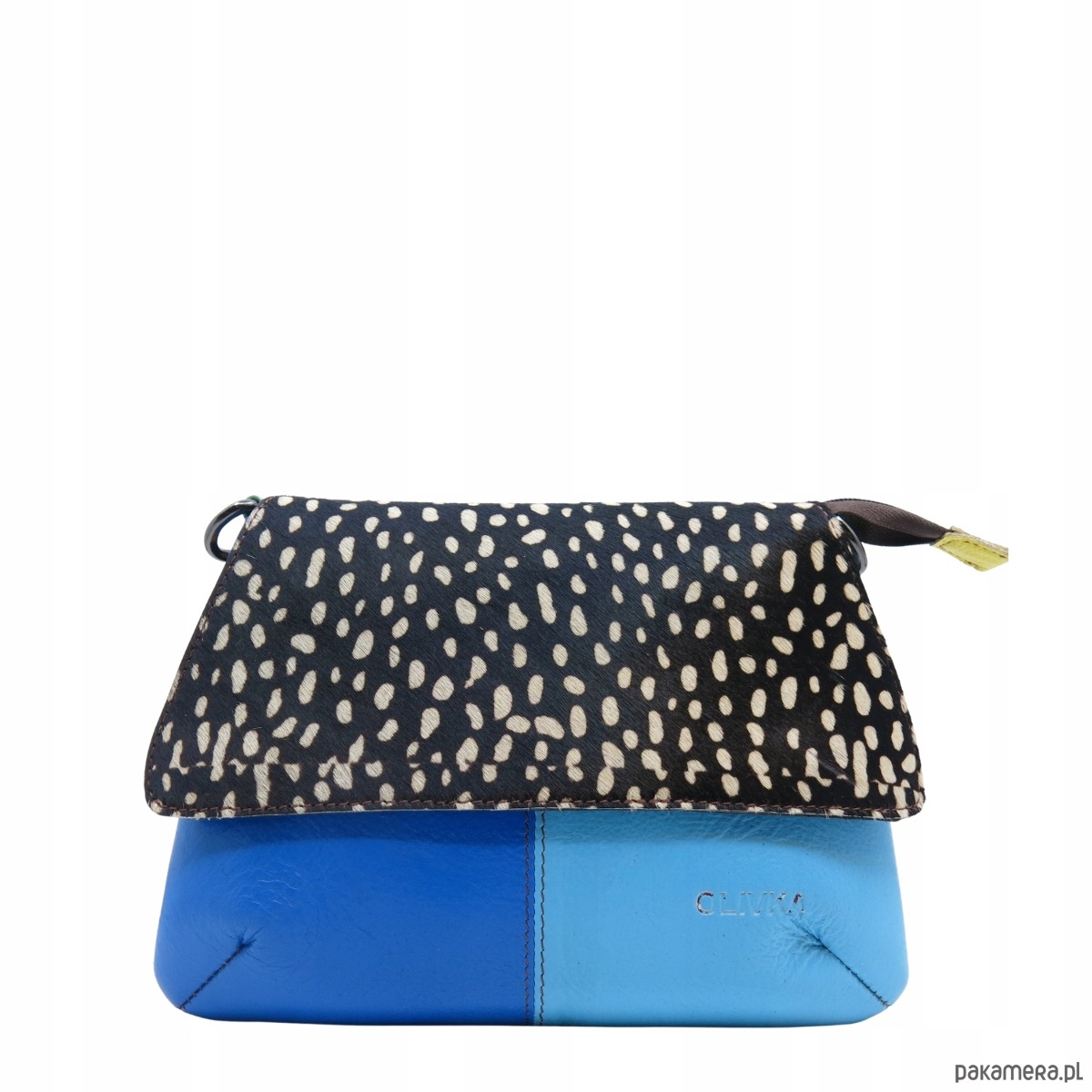 jedna strona klapki wykonana z naturalnej skóry, druga zaś ze skóry z naturalnym włosiem z nadrukiem