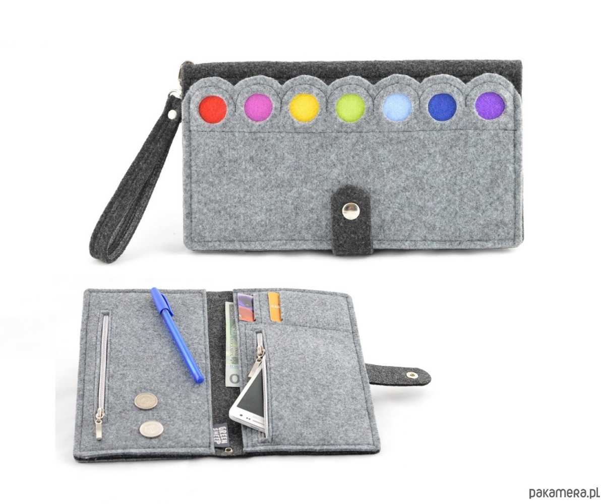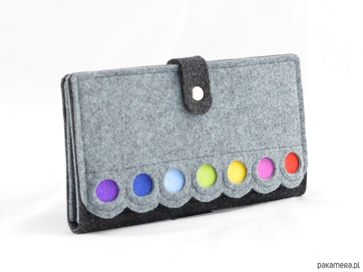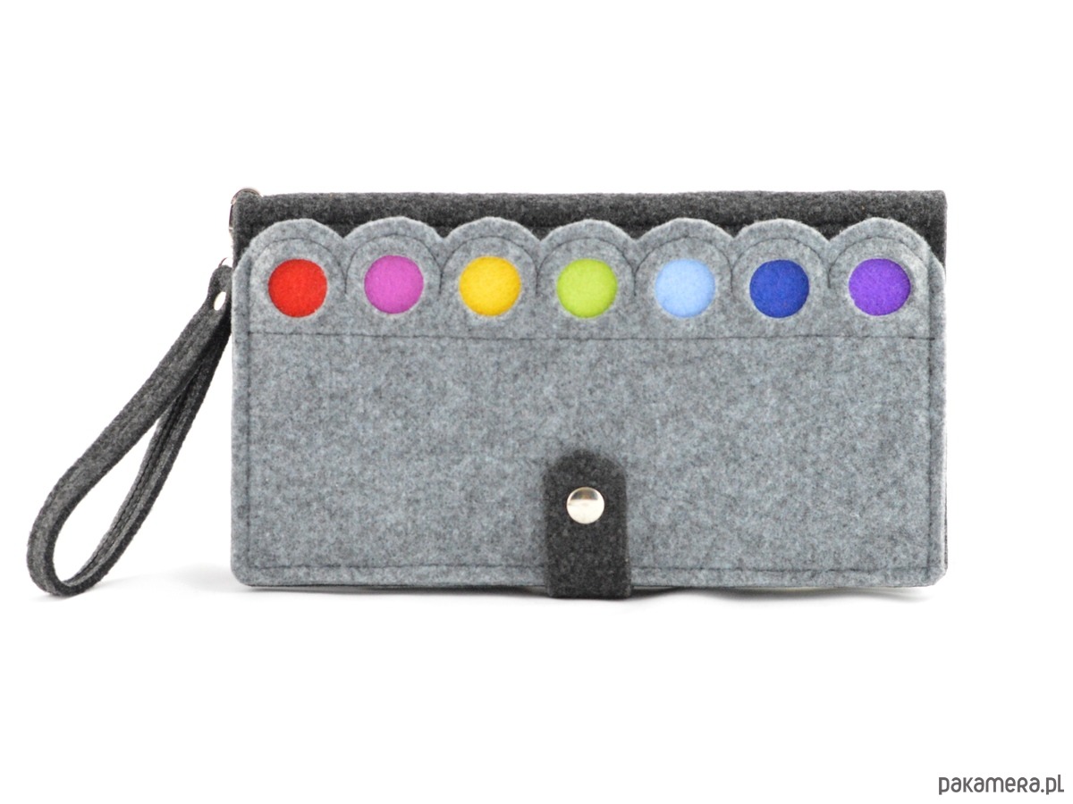 Urocza i praktyczna kopertówka zdobiona kolorowymi kropkami. Przedmiot jest czymś pomiędzy portfelem, a kopertówką. Został wykonany z wytrzymałego, impregnowanego filcu.