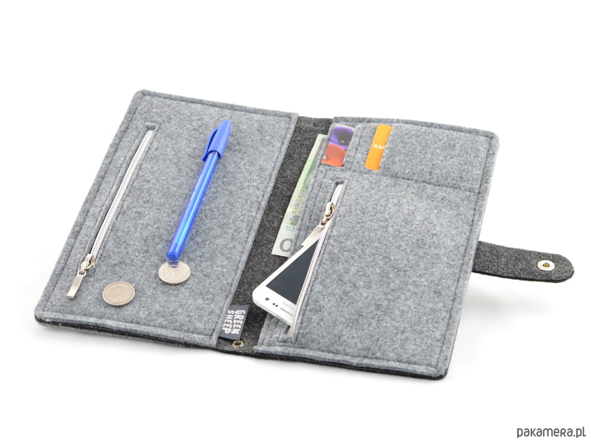 Wewnątrz znajdują się: 2 kieszenie zapinane na suwak (jedna może być na telefon, druga na monety, chusteczki), 2 przegródki na karty i przegródka na banknoty.