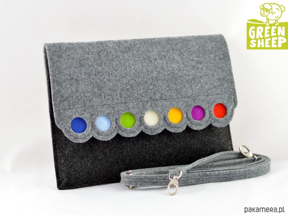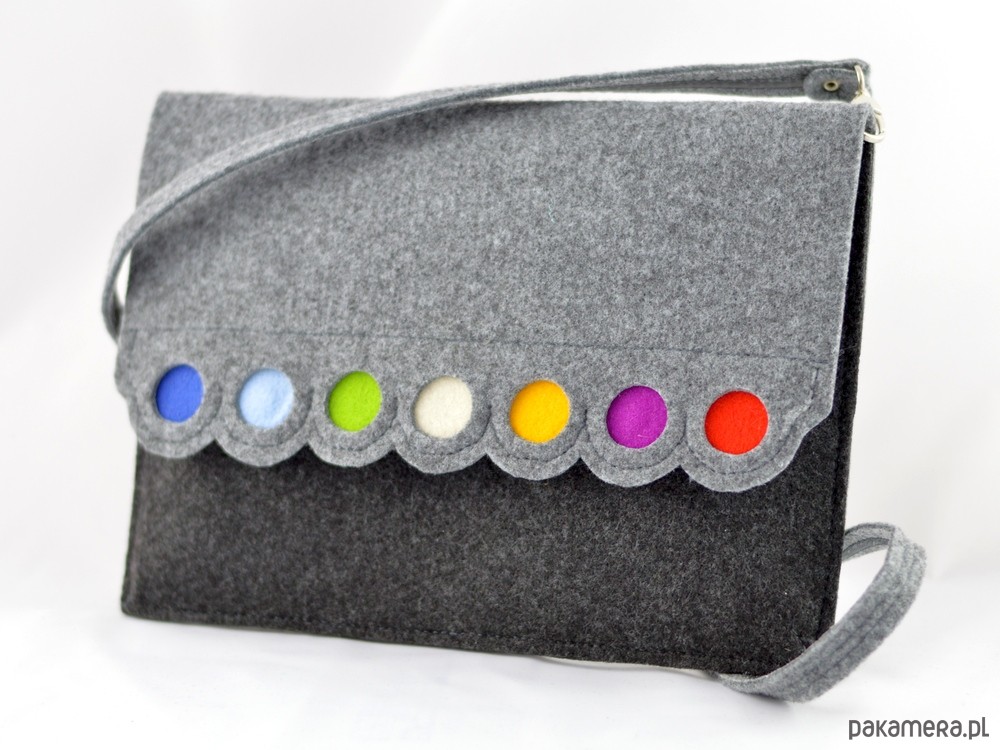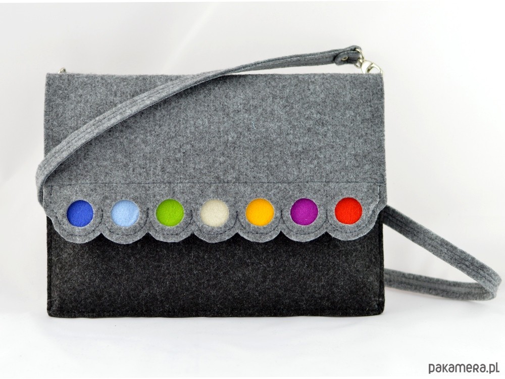 Torebka została wykonana z grubego, mocnego filcu. Klapa i tył torebki jest w kolorze szarym, natomiast przód torebki jest w kolorze grafitowym. Prosta forma, ciekawie zdobiona. Bardzo energetyczna i kolorowa! Długość torebki - około 28 cm, wysokość około 20 cm. Kopertówka ostała wykonana z dbałością o każdy szczegół - klapa zapinana jest na 2 magnesy, w środku znajduje się kieszonka, np. na telefon. Pod klapą znajduje się kieszonka zapinana na suwak. Do torebki dołączony jest odpinany, wzmocniony, filcowy pasek z regulacją długości. Kopertówkę można wykorzystać jako etui na tablet. Torebka mieści format A5 - mały zeszyt. W mojej galerii dostępna jest również taka kopertówka w znacznie większym formacie - na teczkę A4. Kopertówka ma zaszewki na dole - nie jest to zwykła płaska kopertówka - można pomieścić w niej trochę więcej rzeczy, a kształt dalej będzie ładny :) Gorąco polecam! Wzór jest własnością Green Sheep i jest chroniony prawem autorskim. Nie zgadzam się na jego kopiowanie.