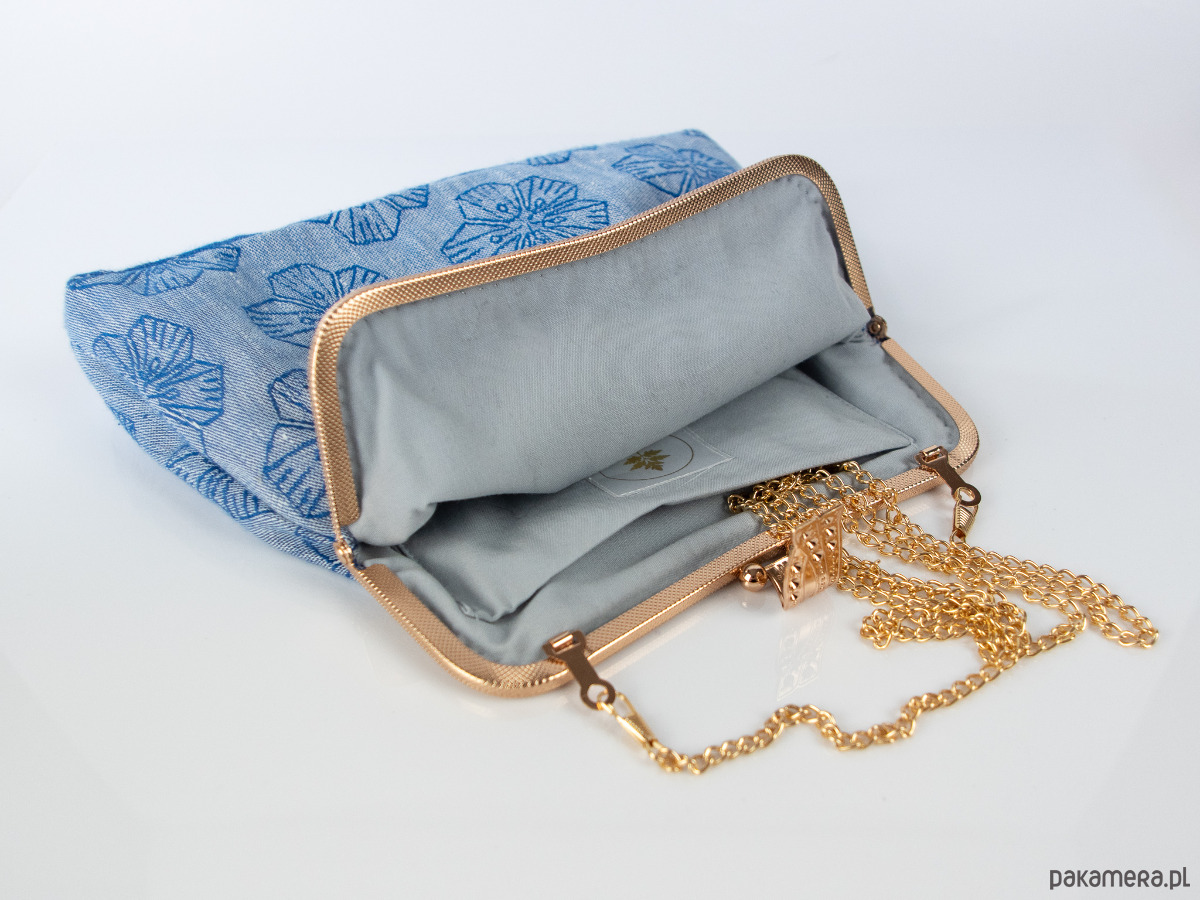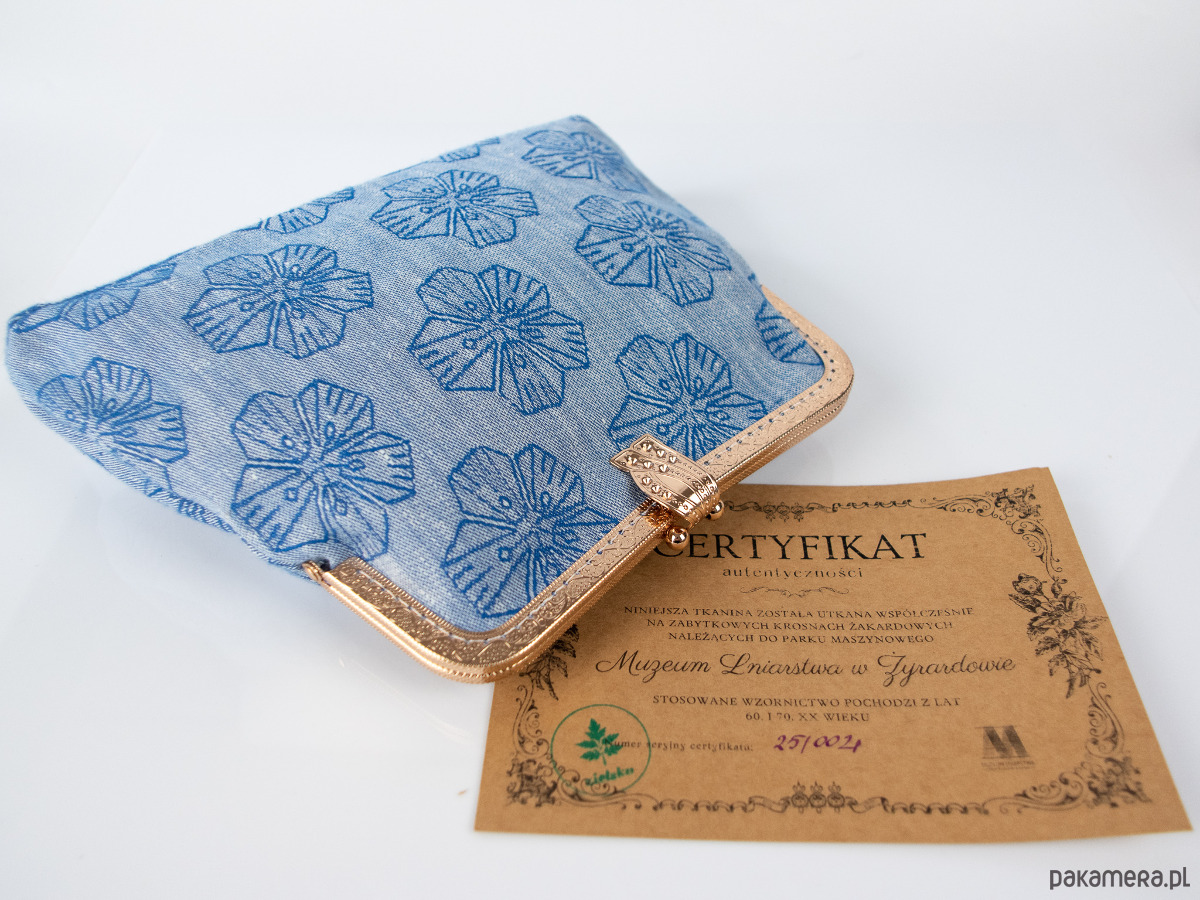 Tkanina żakardowa powstała na zabytkowych krosnach w Muzeum Lniarstwa w Żyrardowie — to prawdziwy rarytas dla miłośników polskiego rzemiosła i tradycji. Wzór inspirowany kwiatami lnu, w odcieniach błękitu, sprawia, że każda torebka jest inna.