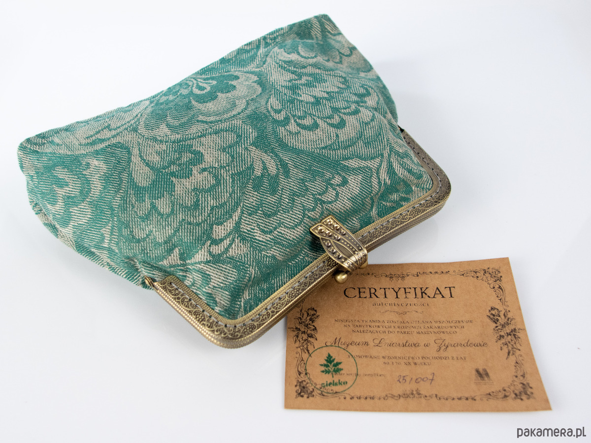 Tkanina żakardowa powstała na zabytkowych krosnach w Muzeum Lniarstwa w Żyrardowie — to prawdziwy rarytas dla miłośników polskiego rzemiosła i tradycji. Wzór z lat 70-80 XX wieku, w odcieniach zieleni, sprawia, że każda torebka jest inna.