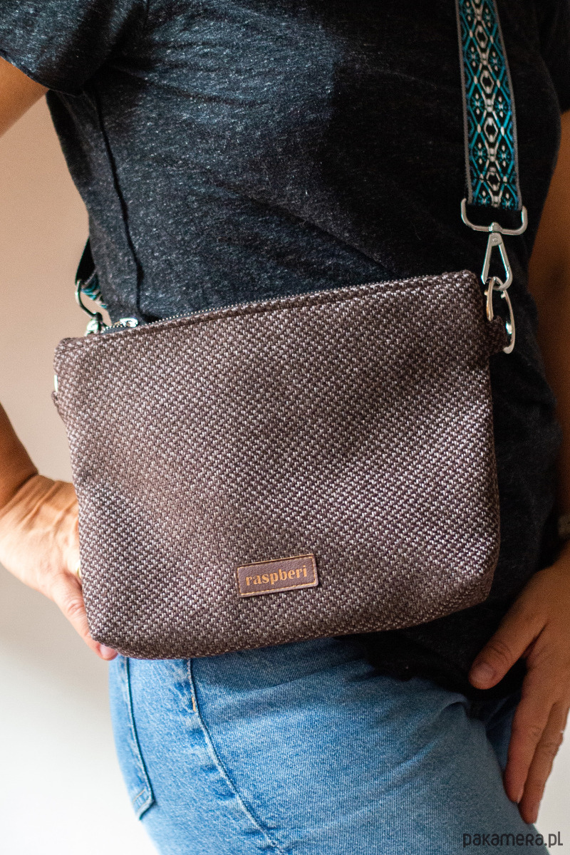 Kopertówka z brązowej plecionki na kolorowym pasku