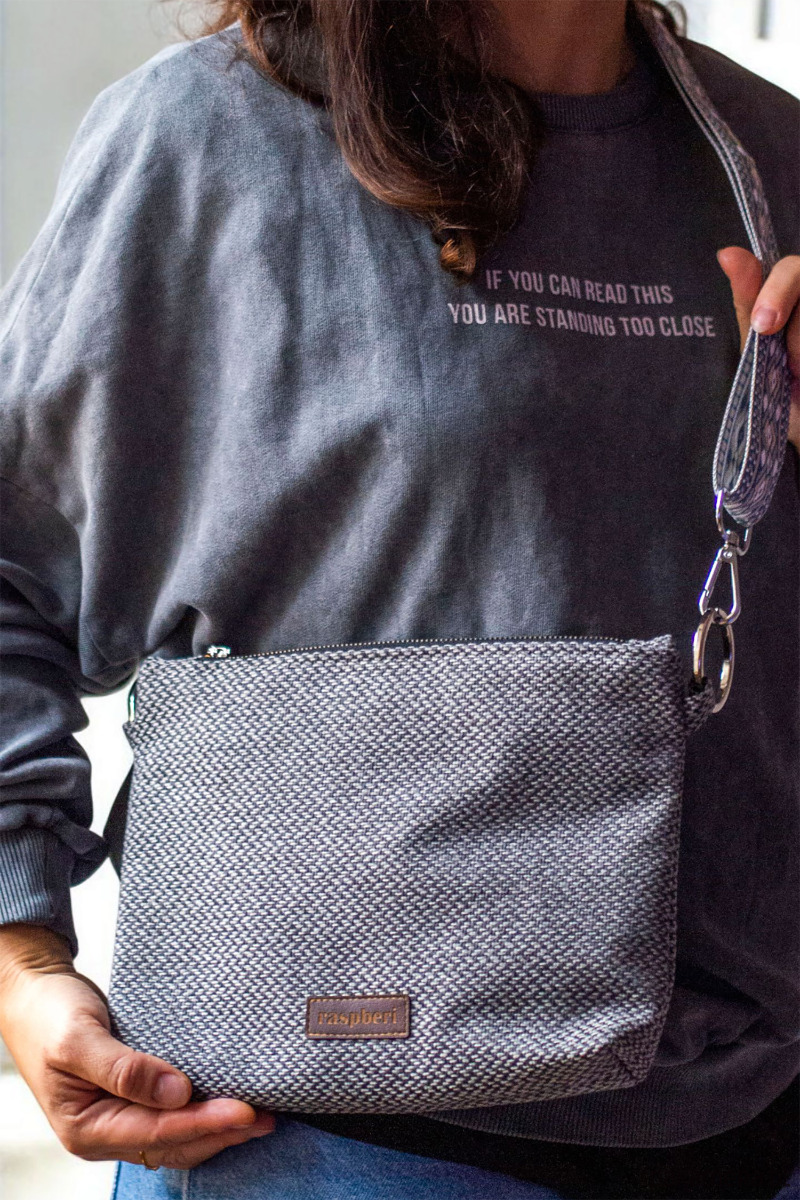 Prosta torebka, kopertówka w średnim rozmiarze wykonana z szarej plecionki. Zapinana na suwak.