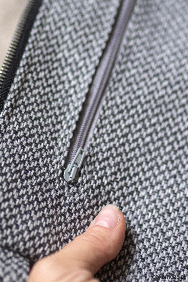 Małe zaszewki na dnie. Z tyłu oraz w środku torebki kieszonki zapinane na suwak. Środek wykończony bawełnianą podszewką.