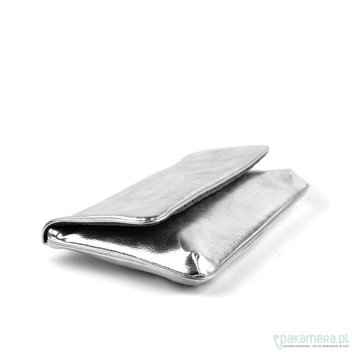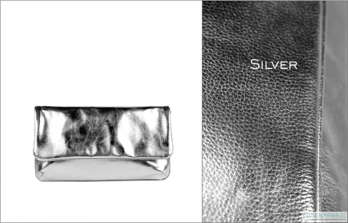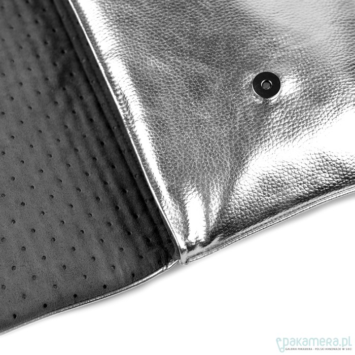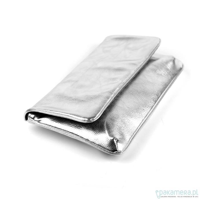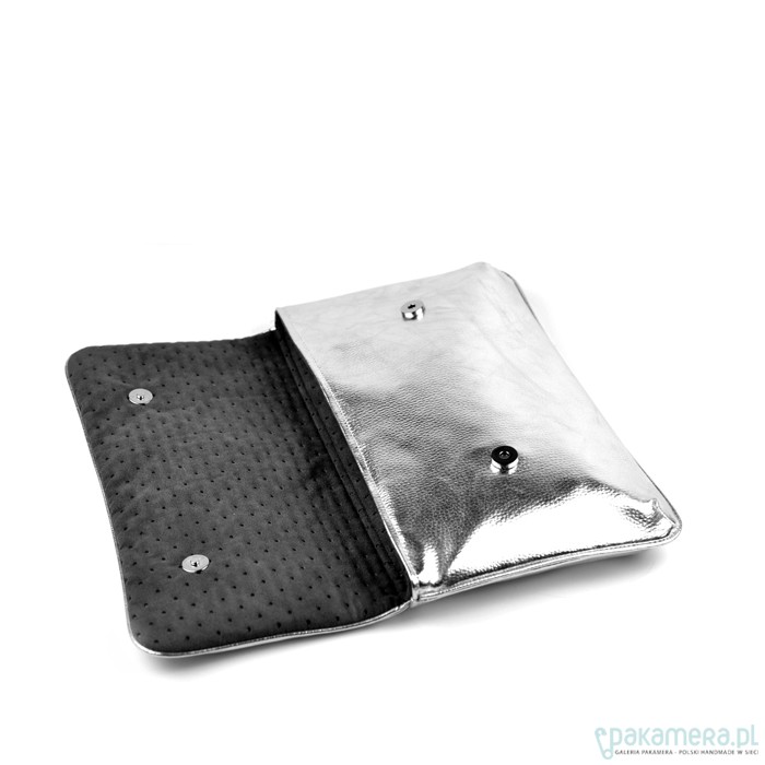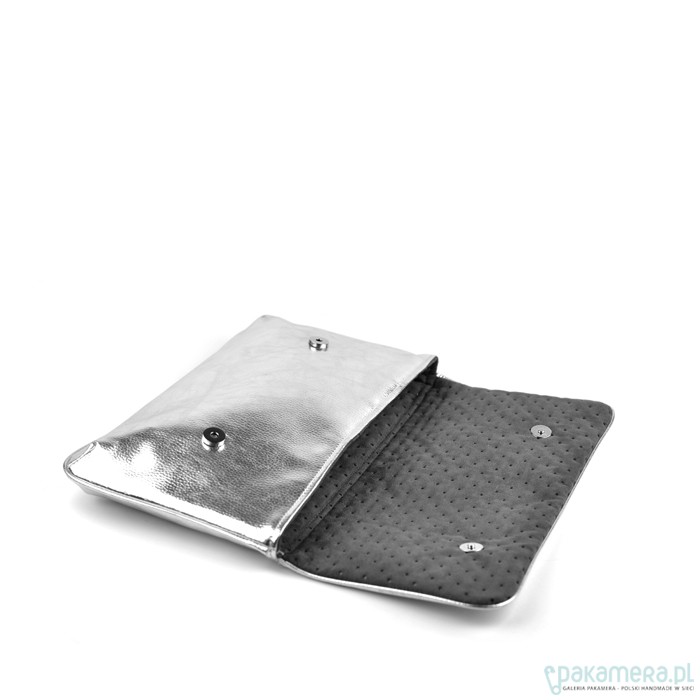 - model: Silver, - kolekcja: clutchMe, - kształt: prostokąt, - zapięcie: dwa magnetyczne zatrzaski, - kolor/rodzaj wykończenia: srebro/pół- mat, - wymiary: 34 cm x 22 cm, - materiał: miękka, włoska, skóra ekologiczna - wnętrze: pikowana imitująca zamsz podszewka.