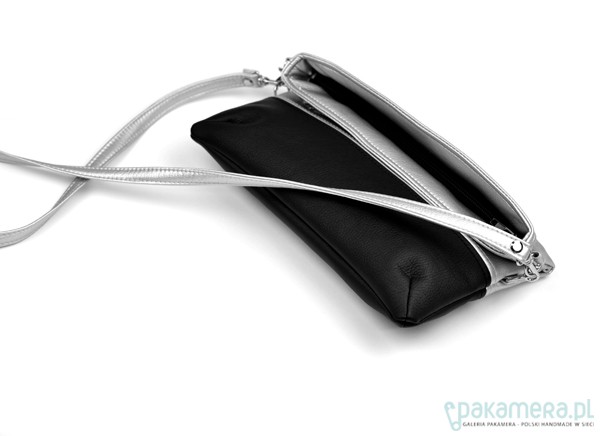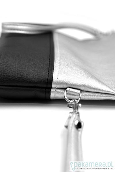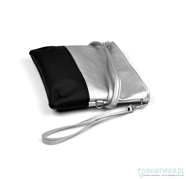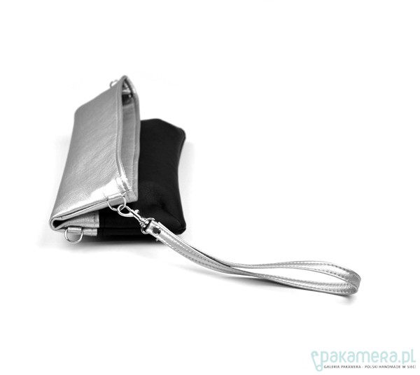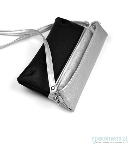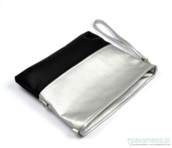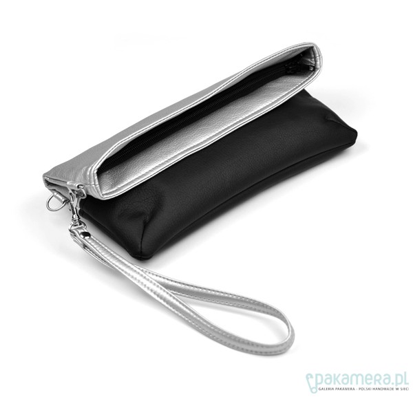 kopertówka z nowej wiosenno/letniej kolekcji. materiał: skóra ekologiczna najwyzszej jakości w kolorze srebrnym i czarnym. zapięcie: czarny zamek błyskawiczny, dodatkowo dopinany pasek na nadgarstek (25cm.) i długi pasek (120cm.). wewnątrz wyłożona podszewką. wymiary: 27cm./23cm. (pomieści wiele kobiecych drobiazgów)