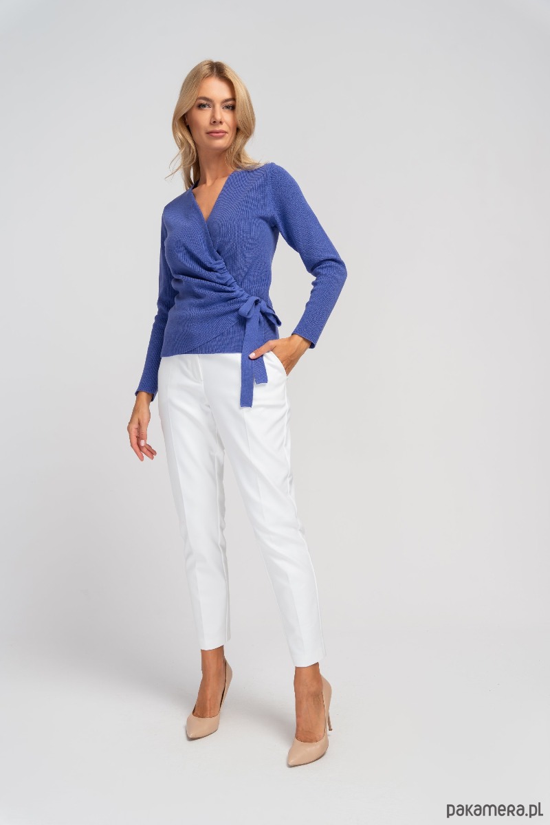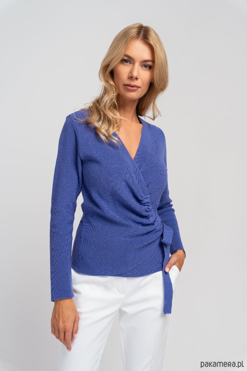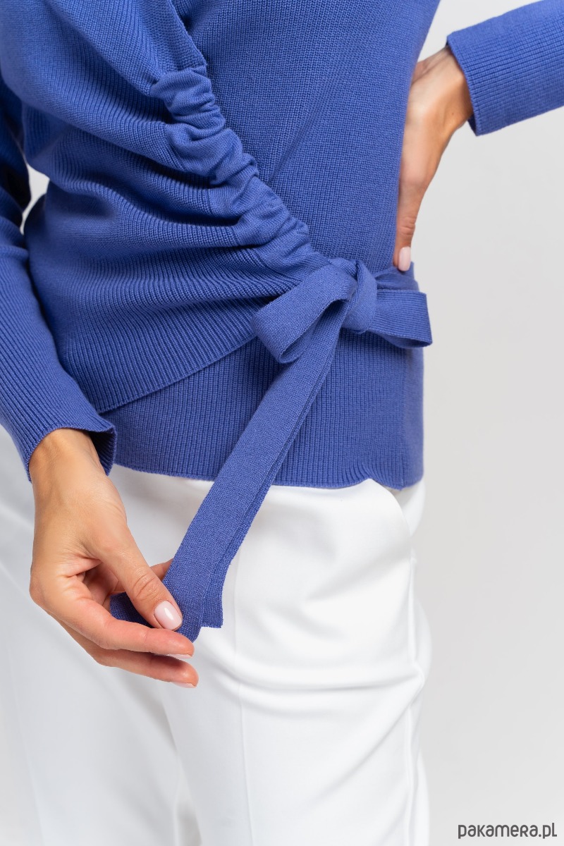 Lekki sweter w kolorze fioletowym. Kopertowy krój, wiązany wokół talii długimi paskami. Na boku ozdobne marszczenie. Dopasowany fason w połączeniu z kopertowym dekoltem ładnie podkreśla sylwetkę. Dzianina z bawełny i akrylu jest miękka i przyjemna w dotyku.