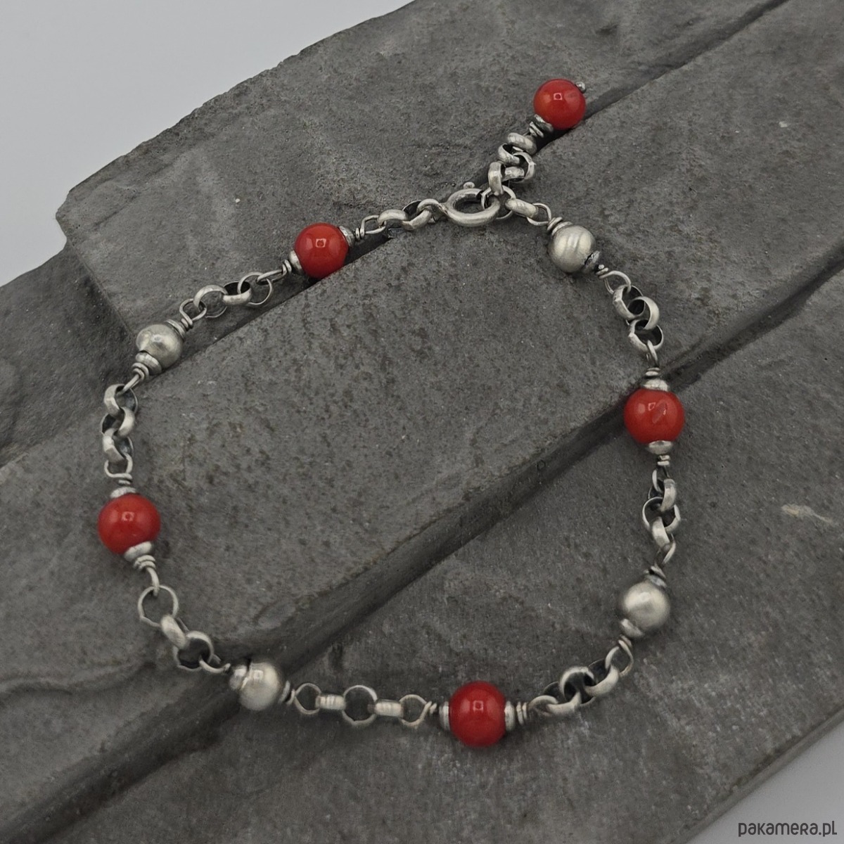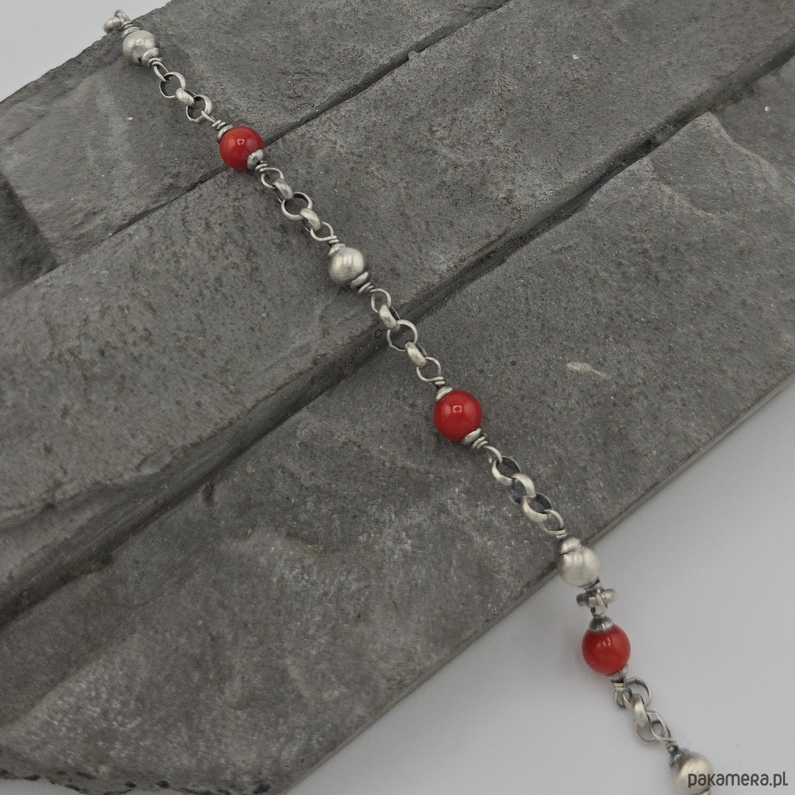 Kobieca i minimalistyczna bransoletka na co dzień i nie tylko. Wykonana w całości z oksydowanego srebra próby 925 oraz gładkich kulek czerwonego korala wielkości ok. 6 mm. Całkowita długość bransoletki regulowana od 18,5 cm do 20 cm. W mojej galerii jest dostępny naszyjnik do kompletu. Ozdobnie zapakowana.