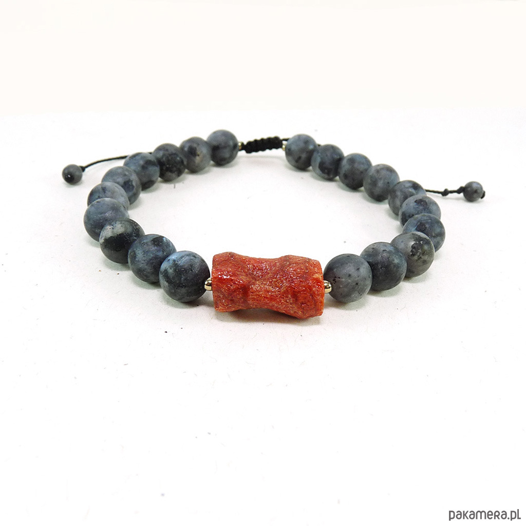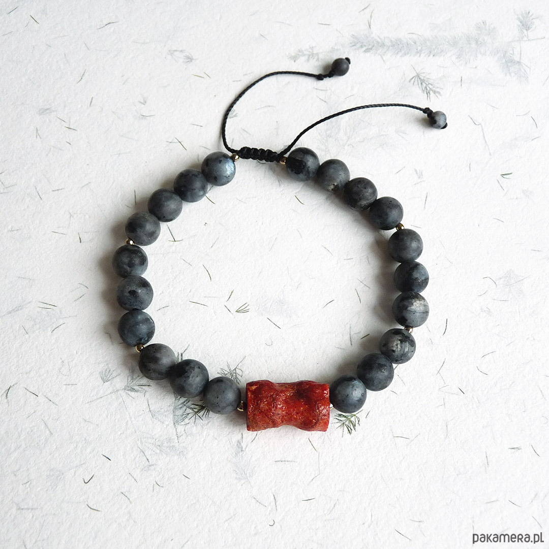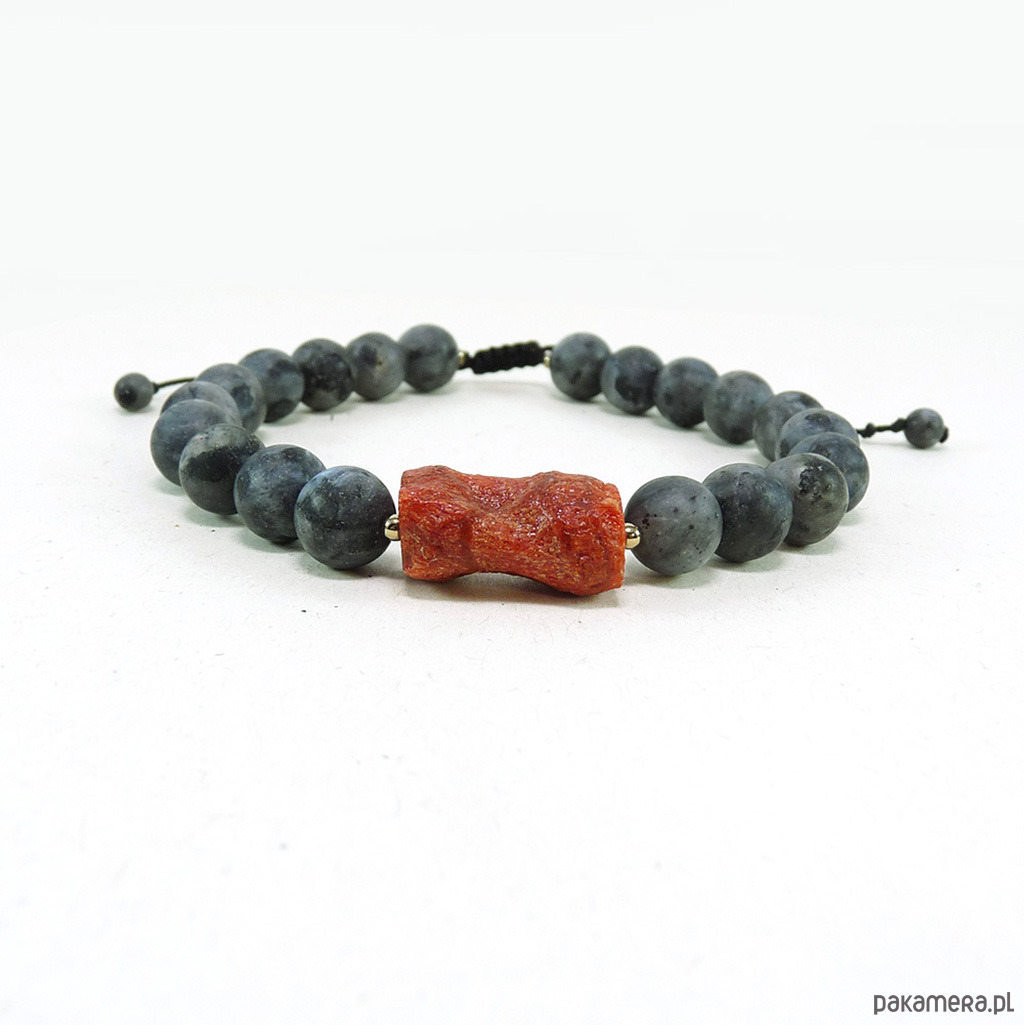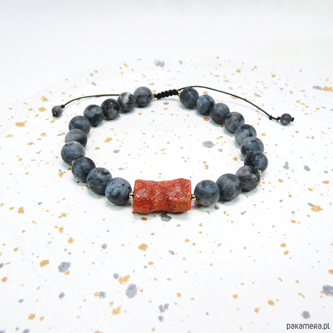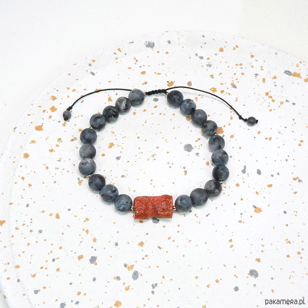 koral filipiński impregnowany 18x10 mm, norweski kamień księżycowy larvikit 8 mm, przekładka hematyt, solidny czarny sznurek