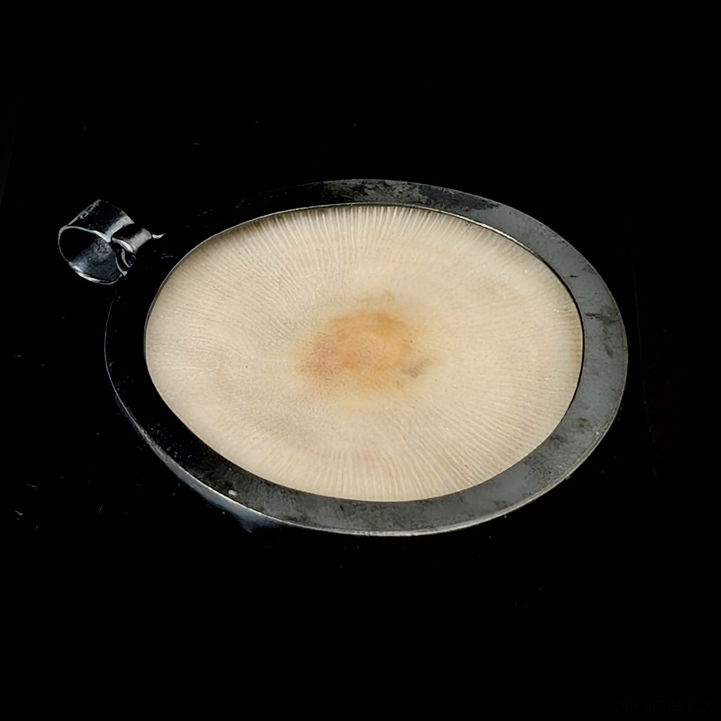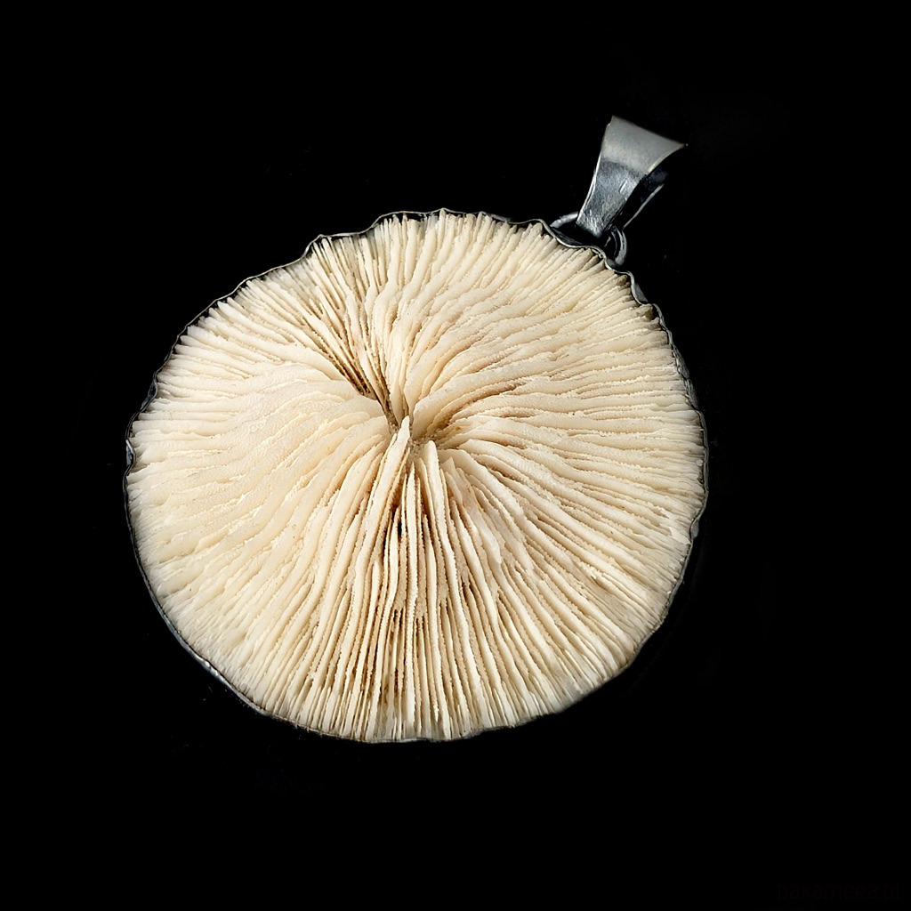Wisior z oprawionym w oksydowane srebro próby 925 pięknie wykształconym skamieniałym koralem grzybowym, zwanym też grzybowieńcem. Zjawiskowy okaz. Wymiary oprawy koralu 46 x 45 mm. długość z krawatką 59 mm. Waga 17g. Wisior zapakowany w ozdobne pudełeczko.