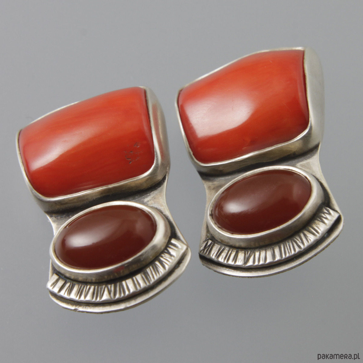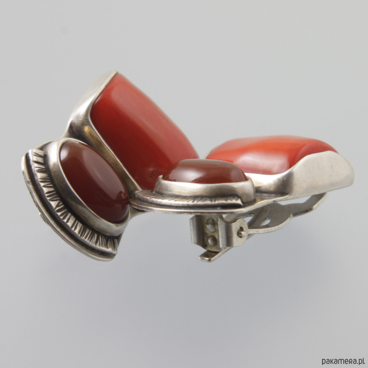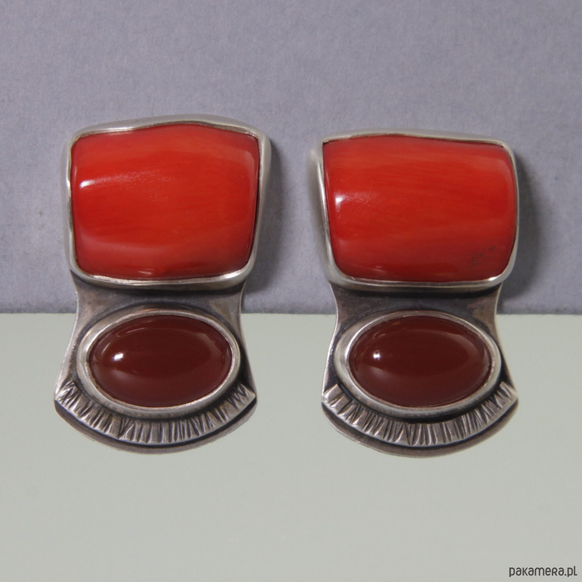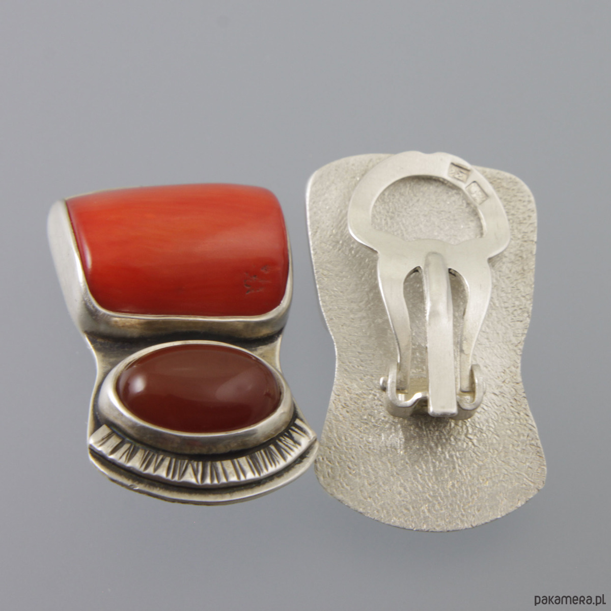 Ręcznie wykonane srebrne klipsy z koralem i karneolem. Srebro próby 925 - próba wybita na harfie. Wymiary klipsów: 2,7 cm x 1,7 cm. Waga klipsów: 13,2 g.