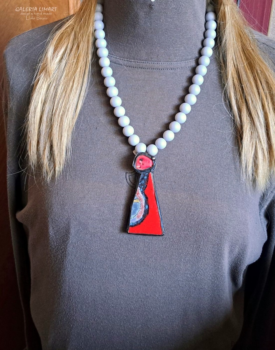 Autorski nieco surrealistyczny, unikalny naszyjnik-wisior stworzony z pięknej i jedynej takiej ręcznie malowanej ceramik ozdobionej dodatkowo bryłką prawdziwego starego korala. Całość oprawiona w technice Tiffany. Wisior (ok 9 cm) został zawieszony na wyrazistym naszyjniku ze szklanych korali w w jasno szarym kolorze (59 cm) doskonale dopasowanym do wisiora (GRATIS!).