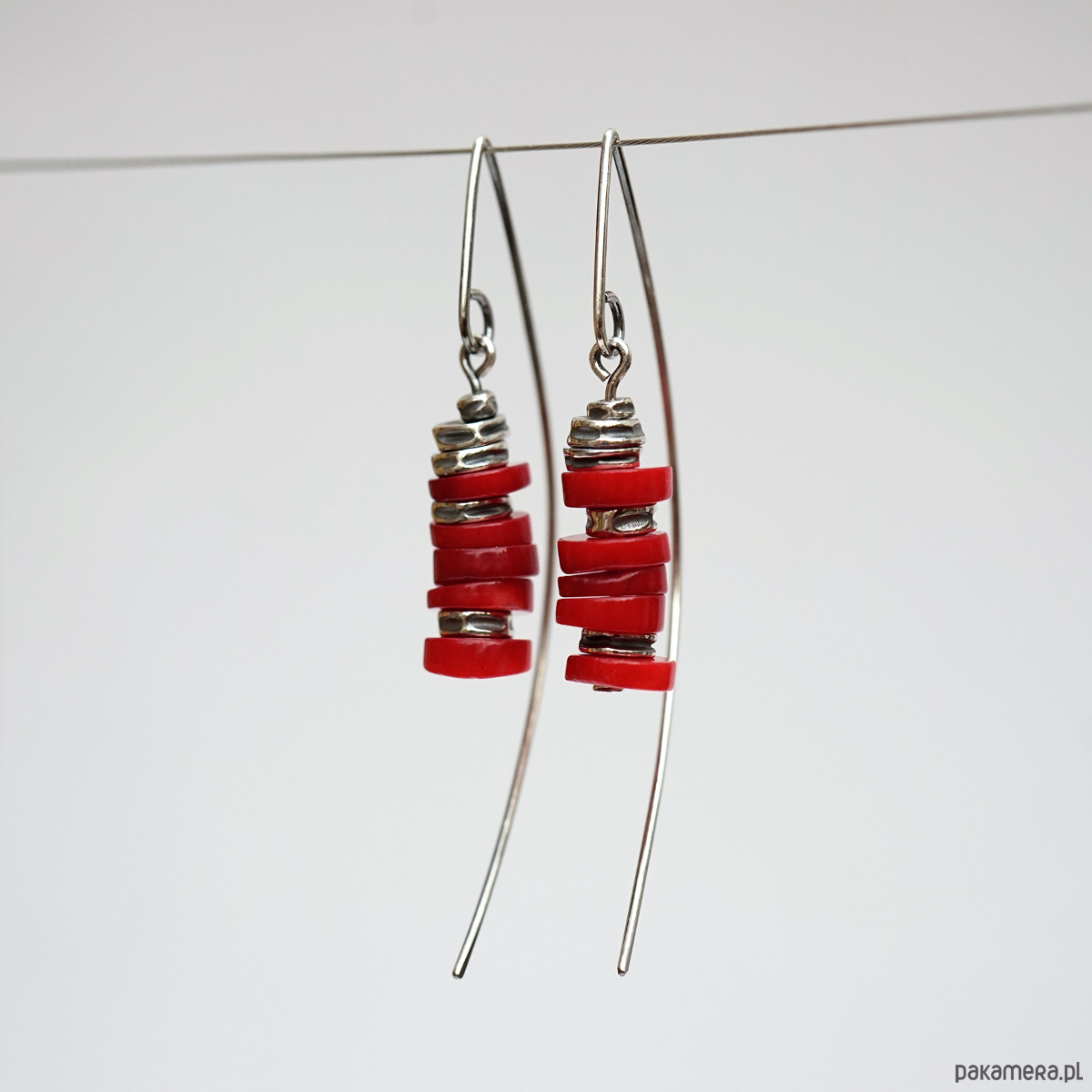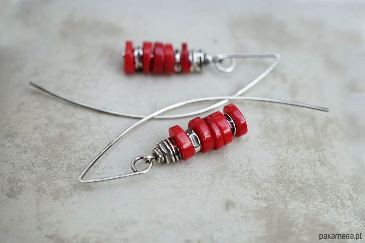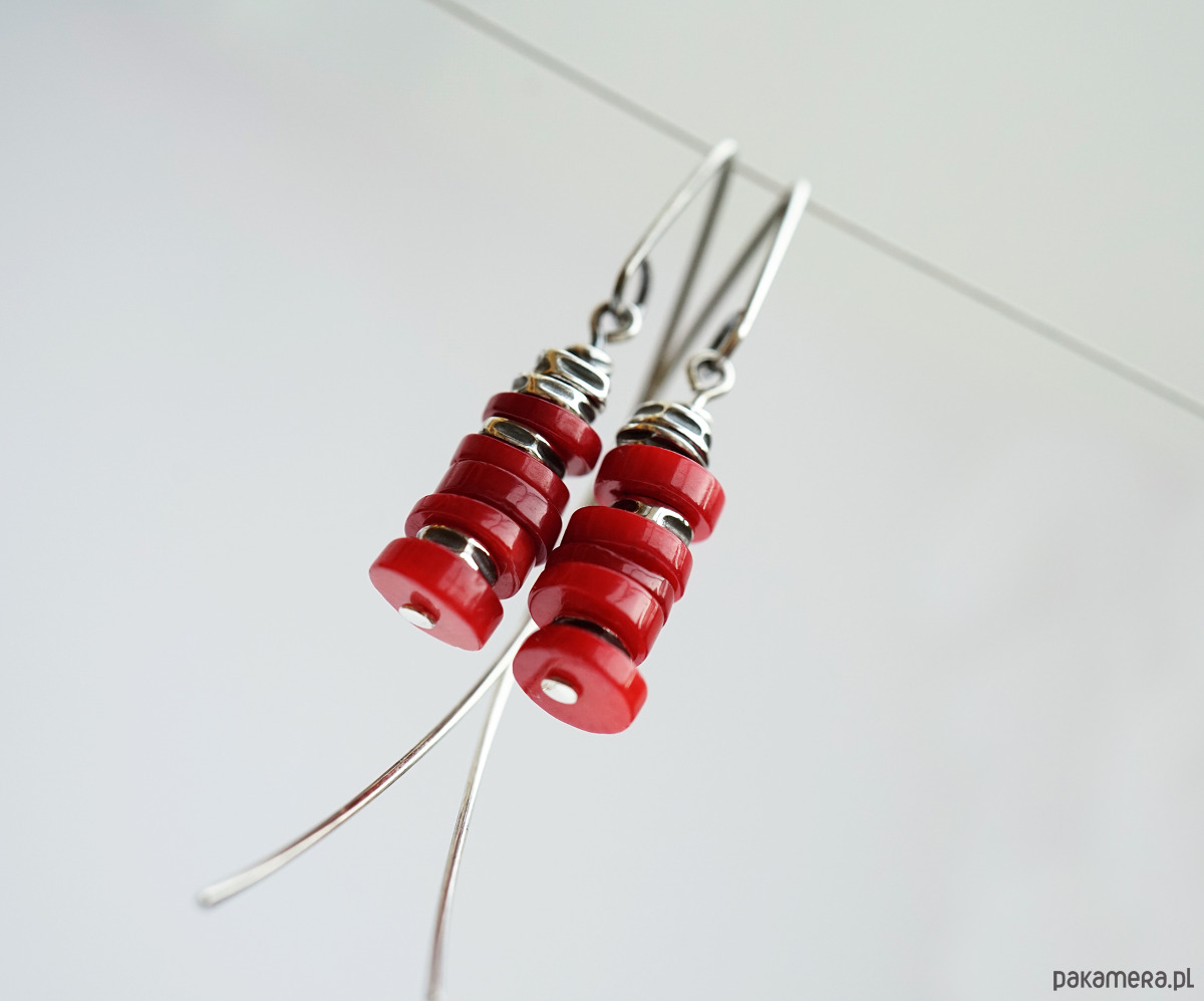 Srebrne kolczyki z koralem. Srebro oksydowane i polerowane.