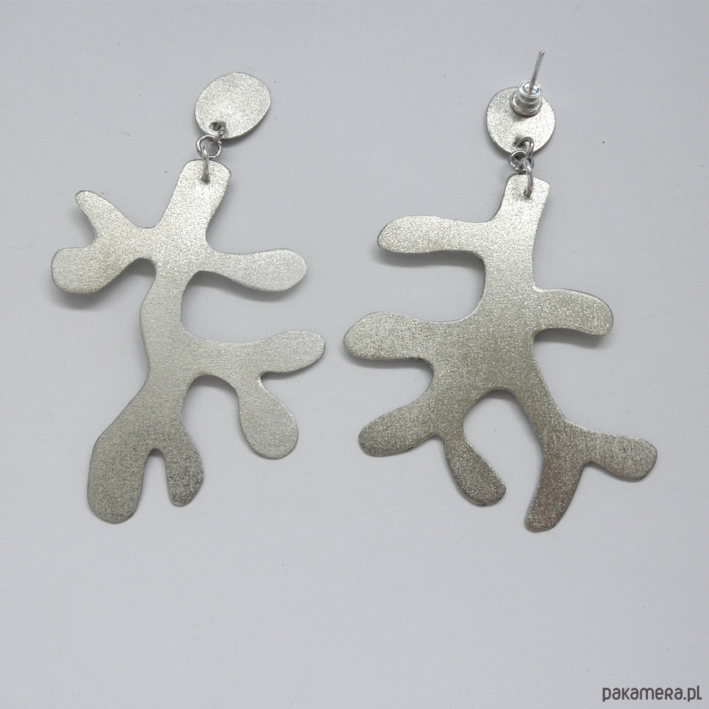 KORAL - zabawny dodatek. Ciekawy dodatek przykuwają uwagę i zaskakuje wzornictwem. Takie kolczyki sprawią, że każda stylizacja nabierze niepowtarzalnego, fantazyjnego charakteru. Kolczyki na sztyftach wykonane są z : alpaka, srebro. Alpaka - zmatowiona. Długość - ok.8 cm. Szerokość ok. 4,5 cm.