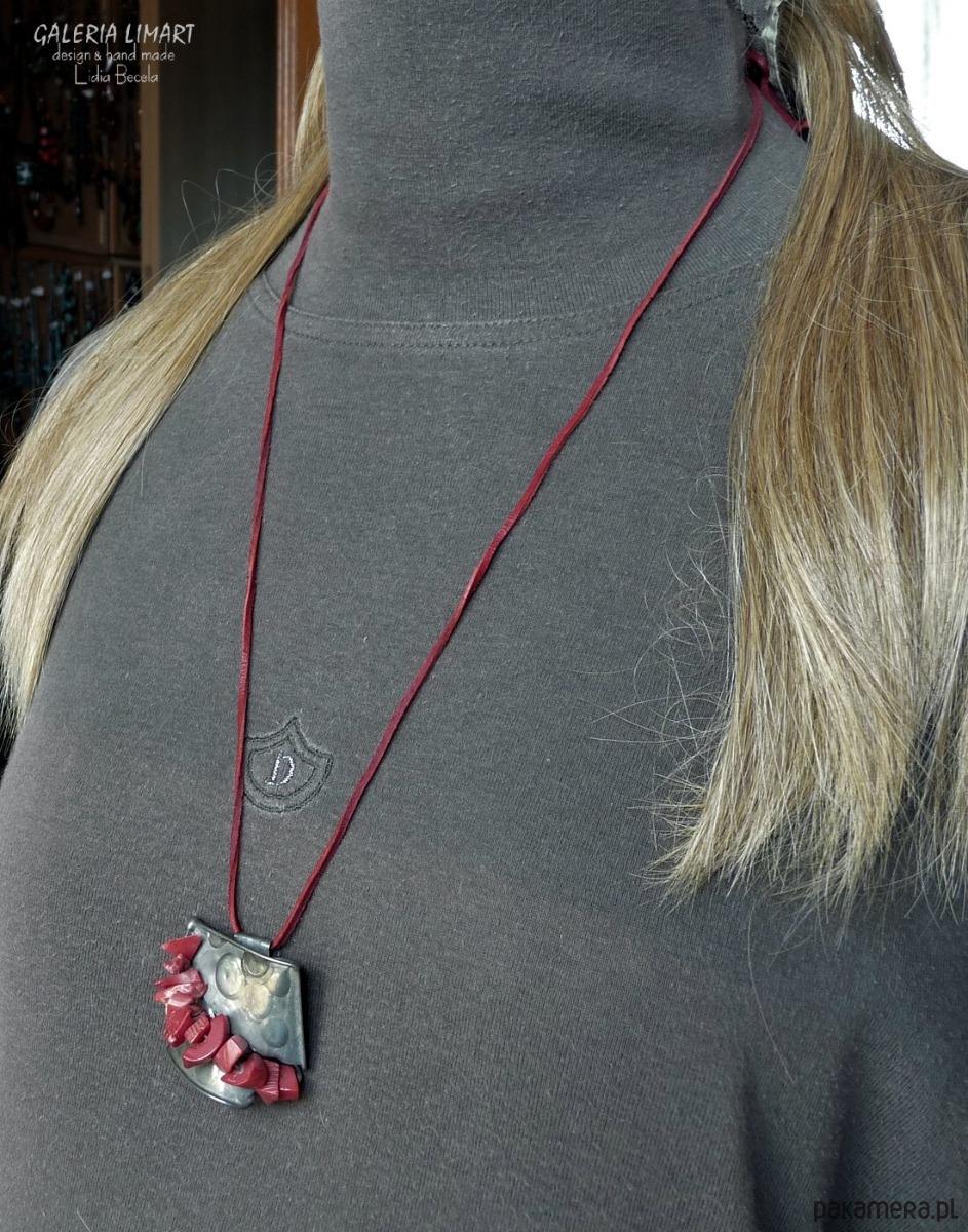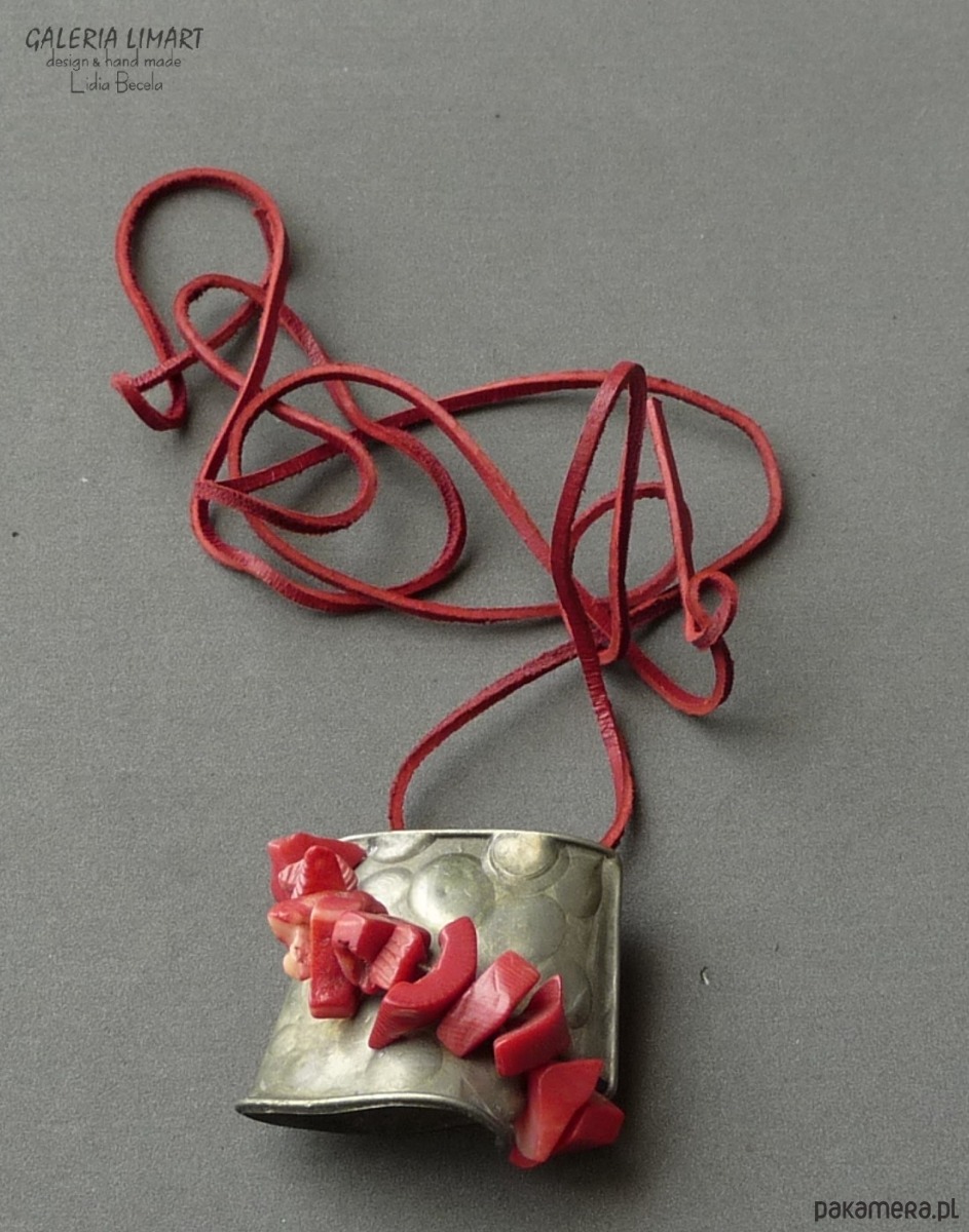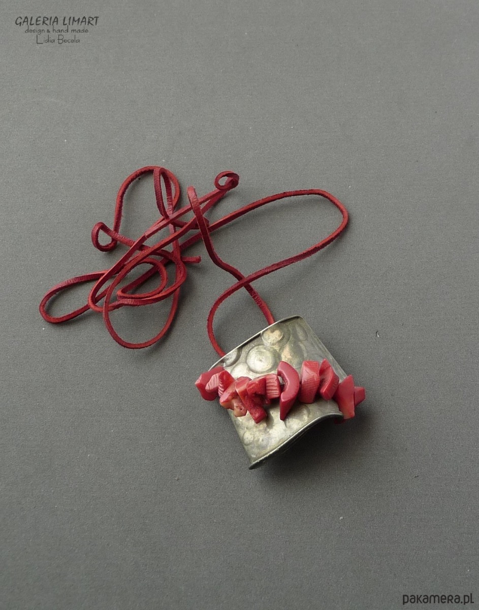Zawieszony na surowym czerwonym rzemyku z regulacją długości (gratis).