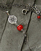 Subtelny, kobiecy i oryginalny naszyjnik na co dzień i nie tylko. Wykonany w całości z oksydowanego srebra próby 925 oraz kulki czerwonego korala wielkości 0,8 cm . Całkowita długość wisiorka to ok. 7,4 cm, a długość łańcuszka to 49 cm plus regulacja 5 cm. W mojej galerii kolczyki i bransoletka do kompletu. Ozdobnie zapakowany.