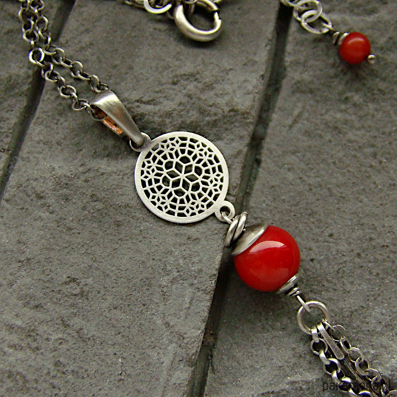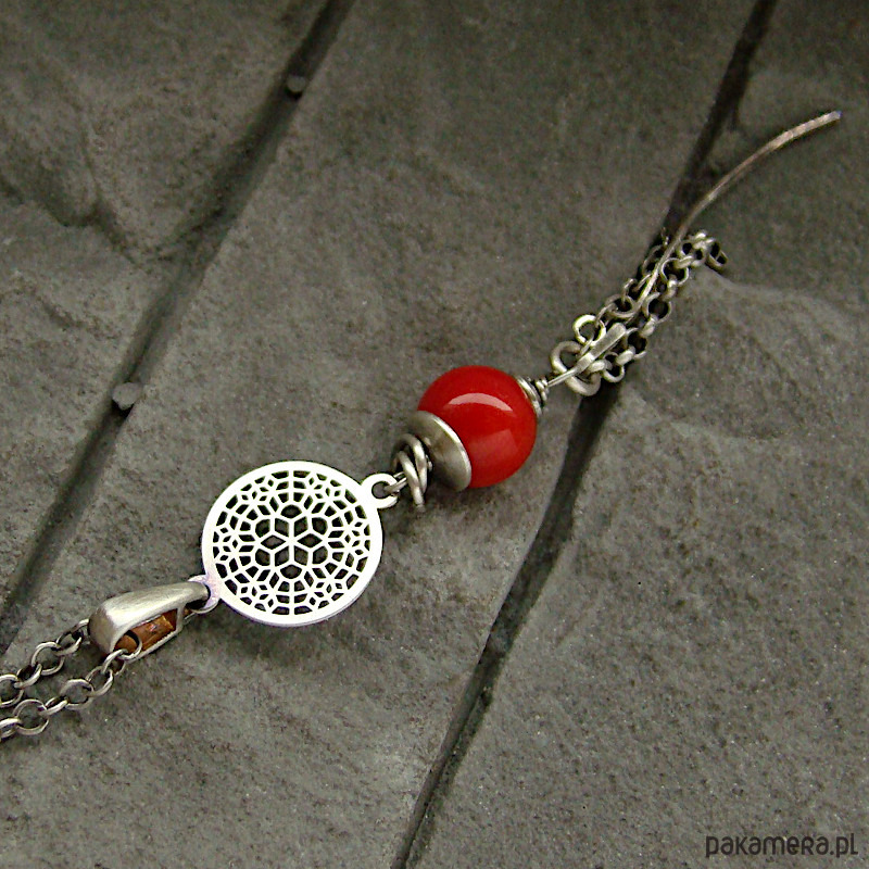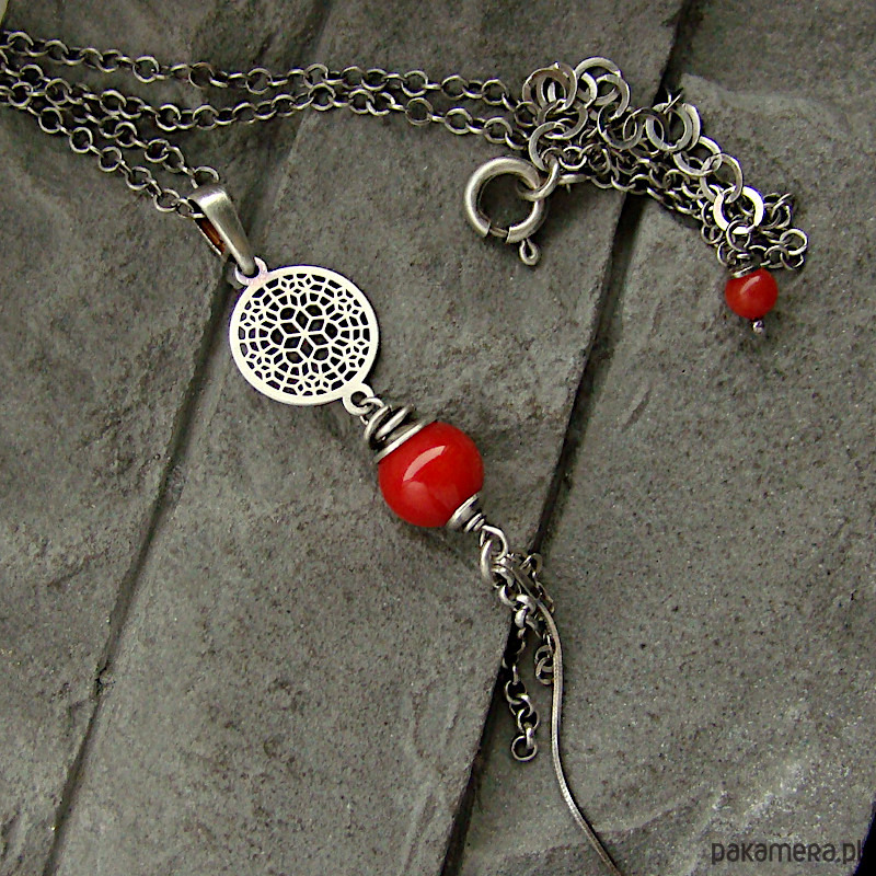 Subtelny, kobiecy i oryginalny naszyjnik na co dzień i nie tylko. Wykonany w całości z oksydowanego srebra próby 925 oraz kulki czerwonego korala wielkości 0,8 cm . Całkowita długość wisiorka to ok. 7,4 cm, a długość łańcuszka to 49 cm plus regulacja 5 cm. W mojej galerii kolczyki i bransoletka do kompletu. Ozdobnie zapakowany.