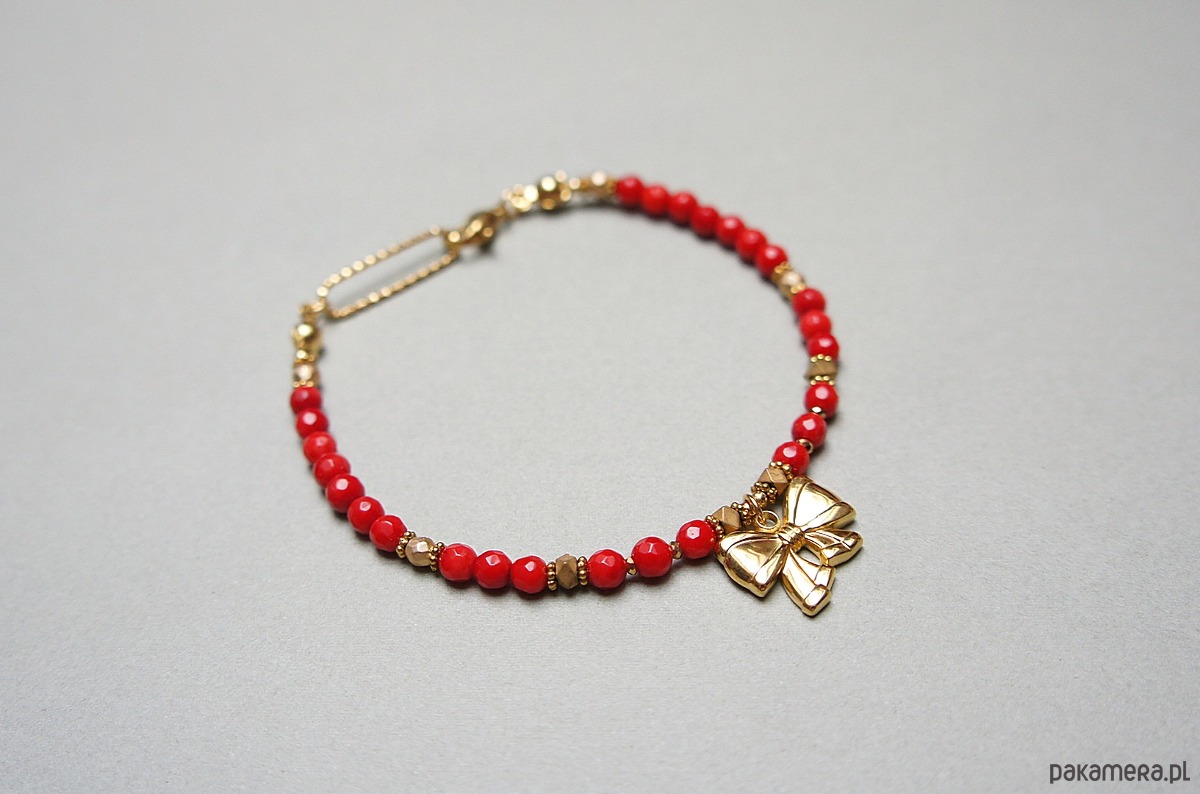 Bransoletka wykonana w całości z pozłacanej stali szlachetnej oraz naturalnych, szlachetnych kamieni - koral naturalny [3mm], hematyt fasetowany, platerowany [3mm], przekładek z hematytu [1mm, 3 x 2mm]. Bransoletka o długości ok. 19,5cm. Biżuteria ozdobnie zapakowana.