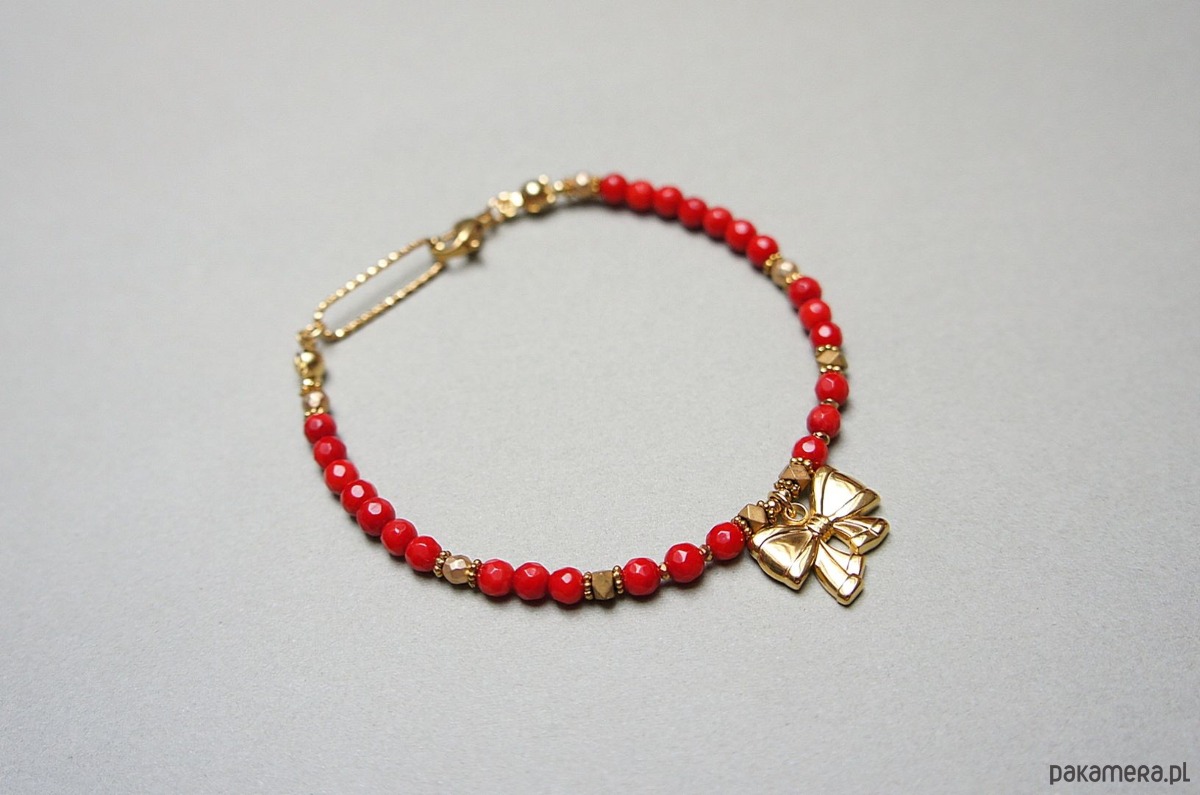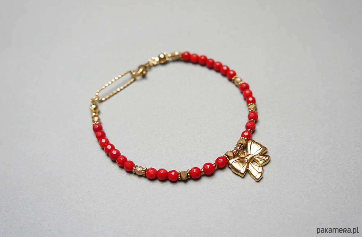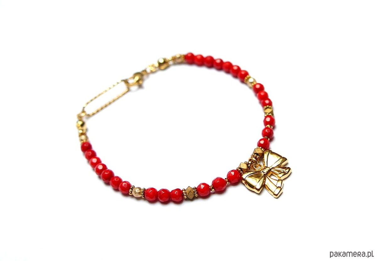 Bransoletka wykonana w całości z pozłacanej stali szlachetnej oraz naturalnych, szlachetnych kamieni - koral naturalny [3mm], hematyt fasetowany, platerowany [3mm], przekładek z hematytu [1mm, 3 x 2mm]. Bransoletka o długości ok. 19,5cm. Biżuteria ozdobnie zapakowana.