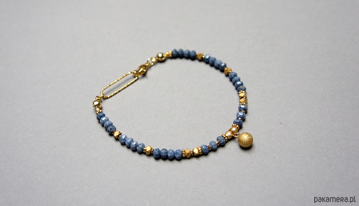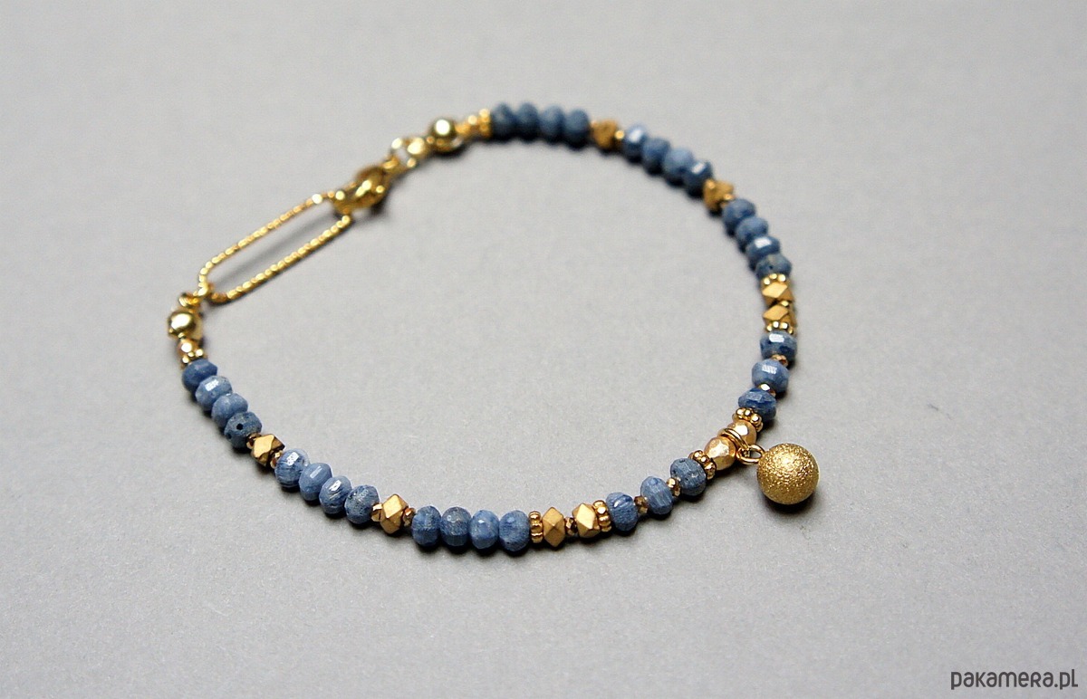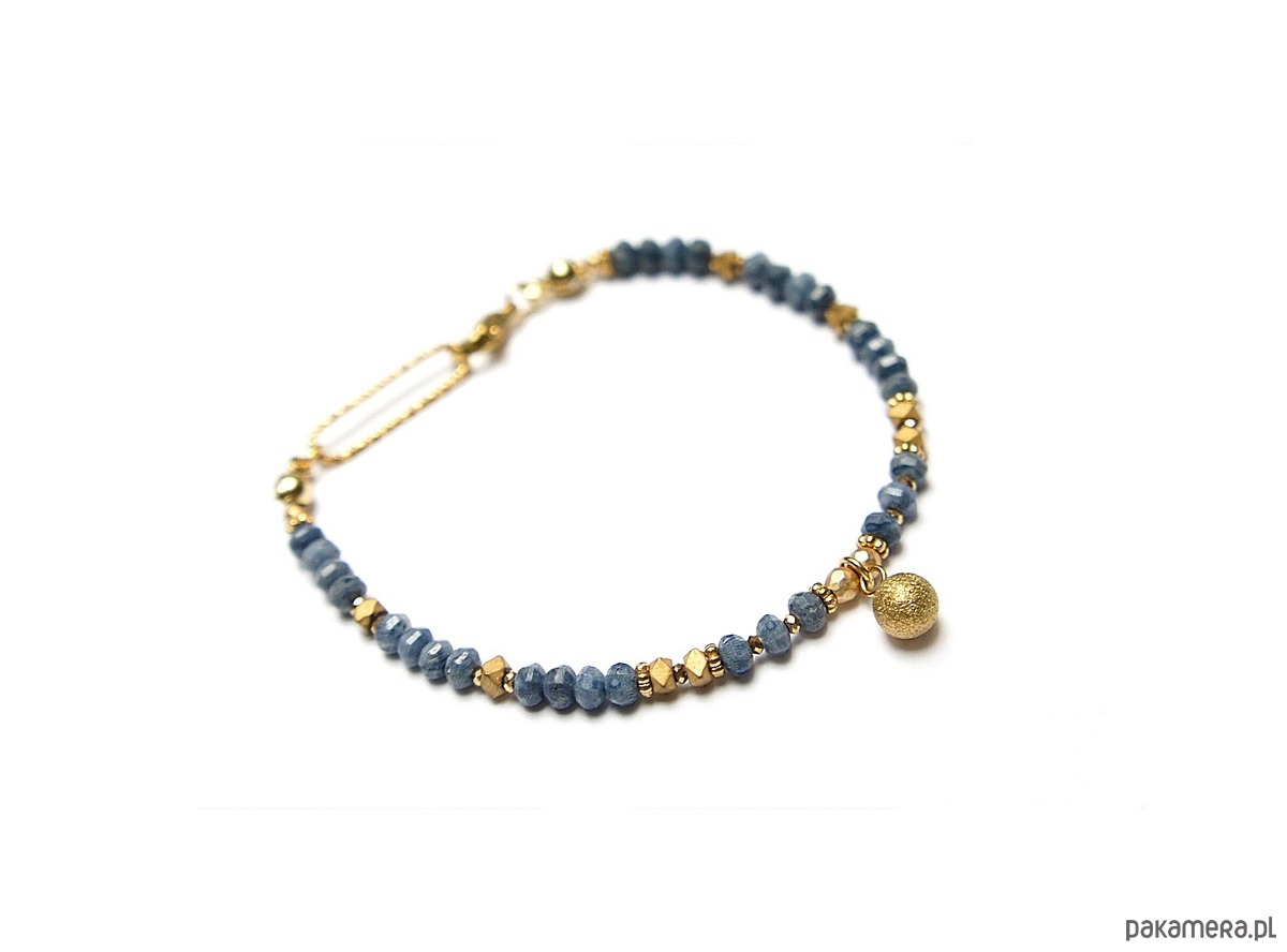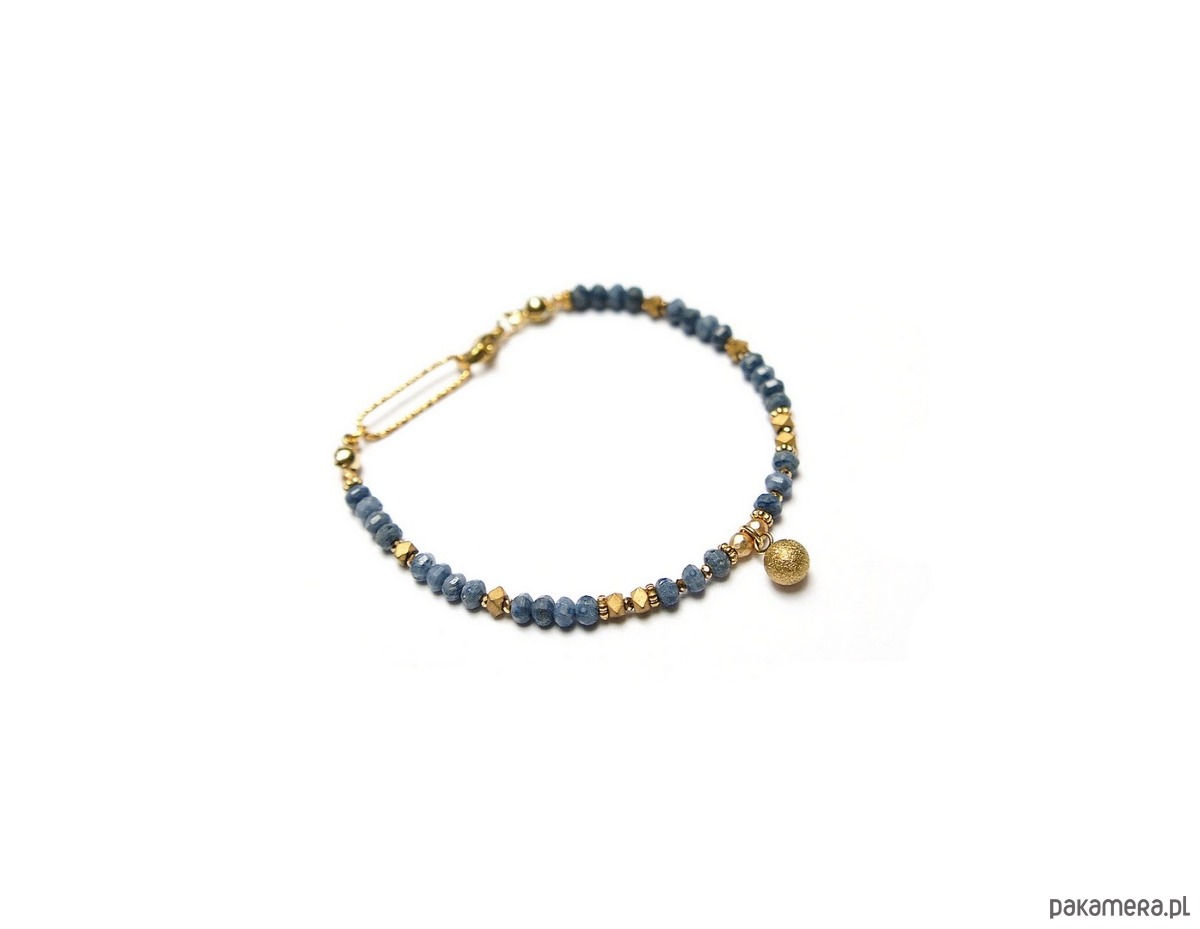 Bransoletka wykonana w całości z pozłacanej stali szlachetnej oraz naturalnych kamieni - fasetowane oponki niebieskiego korala [ok. 2,5 x 4mm], talarków hematytu matowego [3 x 2mm], przekładek z hematytu [1mm]. Bransoletka pasuje na nadgarstek 15 - 16cm.