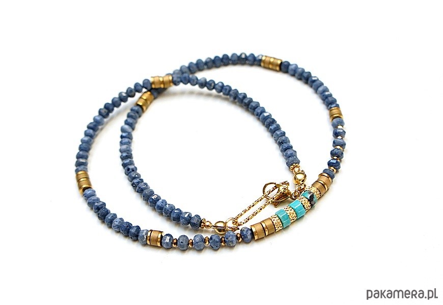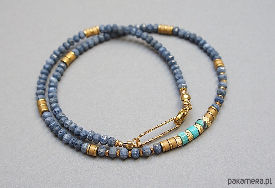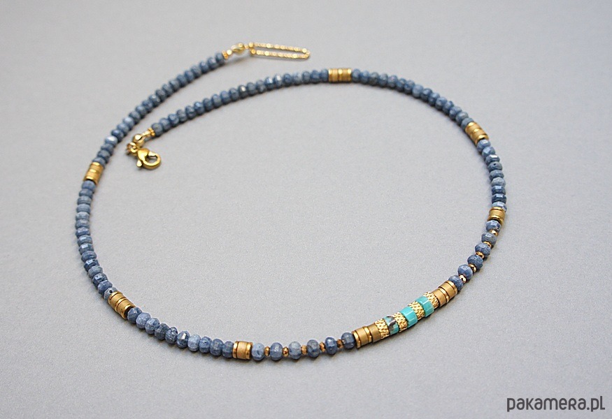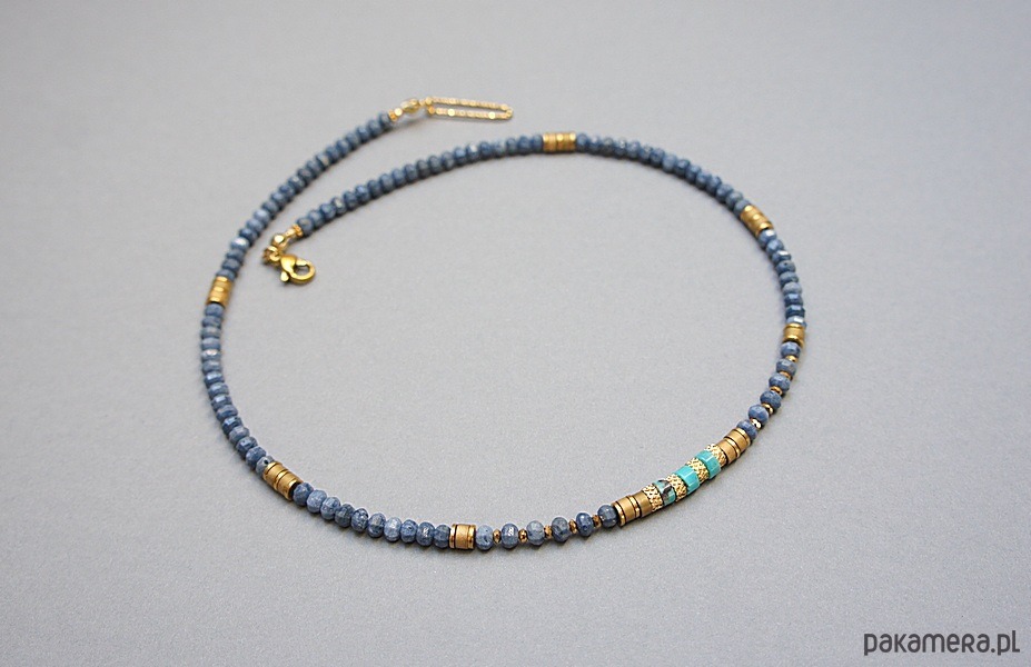 Krótki naszyjnik wykonany w całości z pozłacanej stali szlachetnej oraz naturalnych kamieni - fasetowane oponki niebieskiego korala [ok. 2,5 x 4mm], talarków turkusu [4 x 2mm], talarków hematytu matowego [4 x 2mm], przekładek z hematytu [1mm]. Naszyjnik o długości ok. 41cm.