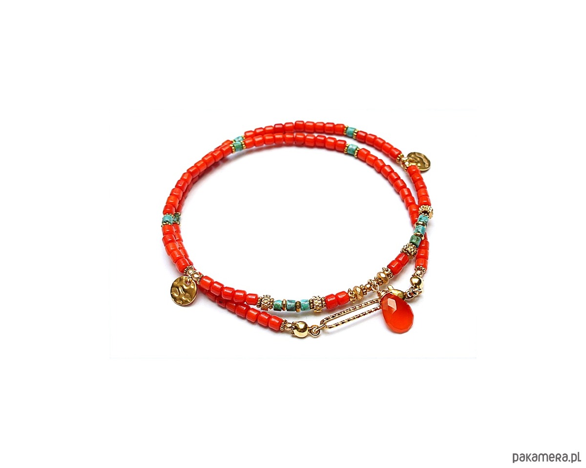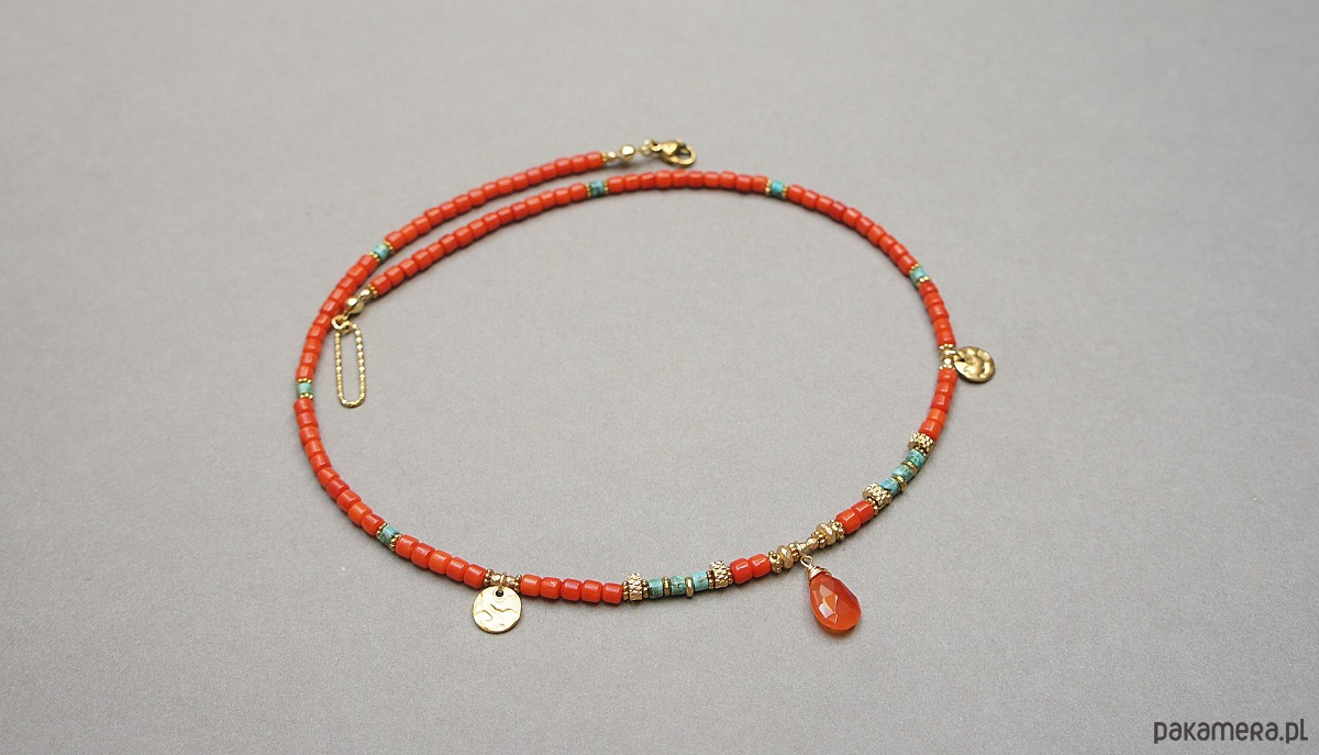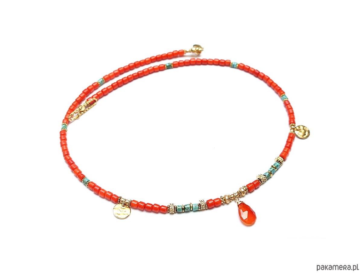 Krótki, delikatny naszyjnik wykonany w całości z pozłacanej stali szlachetnej, naturalnego pomarańczowego korala [ok. 4 x 4mm], talarków naturalnego turkusu [4 x 4mm], hematytu fasetowanego, platerowanego o matowej powłoce [4 x 2mm i 2mm], przekładek z hematytu [1mm] oraz zawieszki w kształcie łezki z karneolu. Naszyjnik o długości ok. 45,5cm. Biżuteria ozdobnie zapakowana.