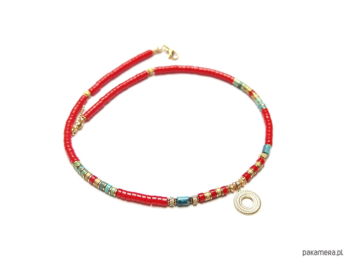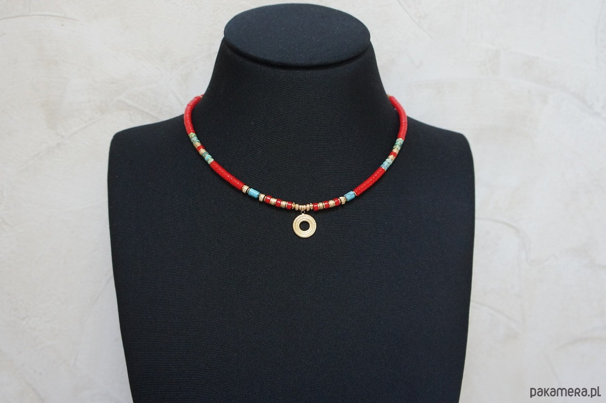 Krótki, delikatny naszyjnik wykonany w całości z pozłacanej stali szlachetnej oraz naturalnych kamieni - talarków korala [4 x 2mm], talarków matowego hematytu [4 x 2mm], wałeczków naturalnego turkusu [ok. 6 x 4mm], hematytu fasetowanego, platerowanego [4 x 2mm i 2mm]. Naszyjnik o długości ok. 42,5cm. Biżuteria ozdobnie zapakowana.