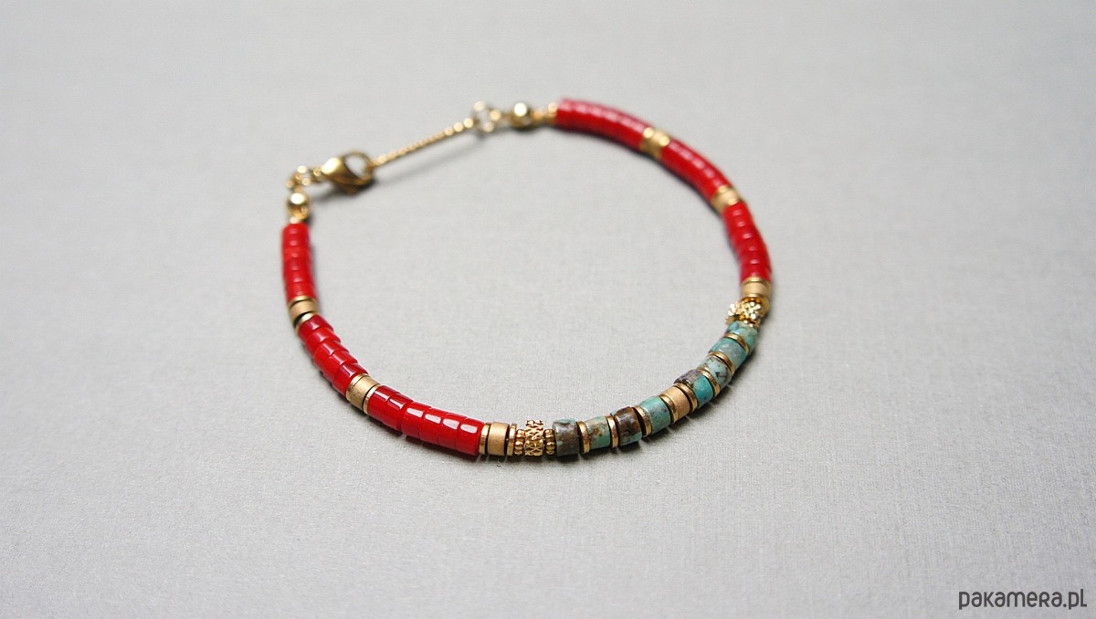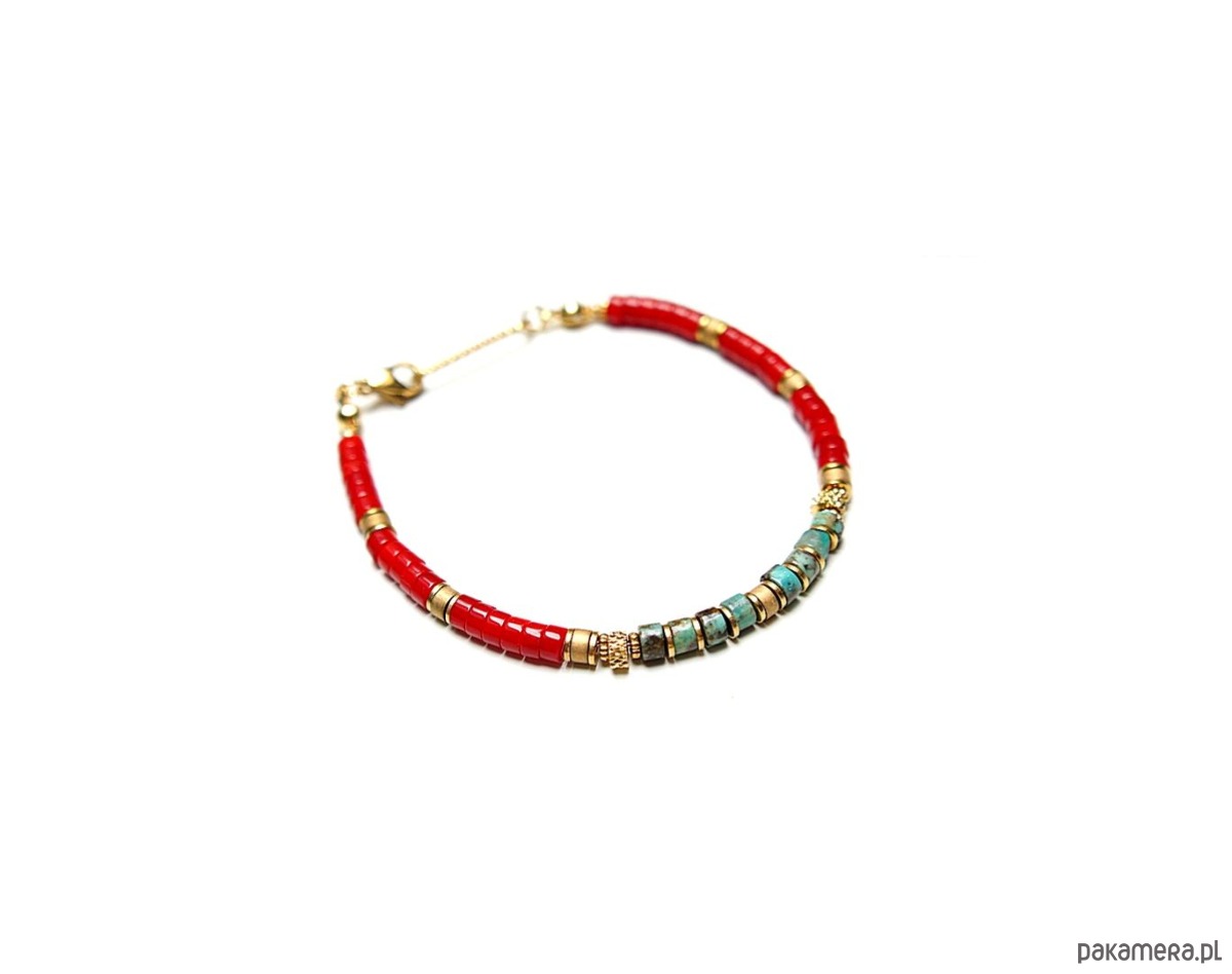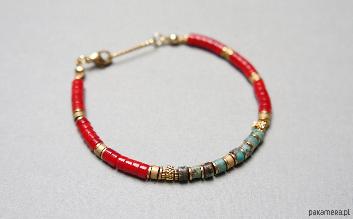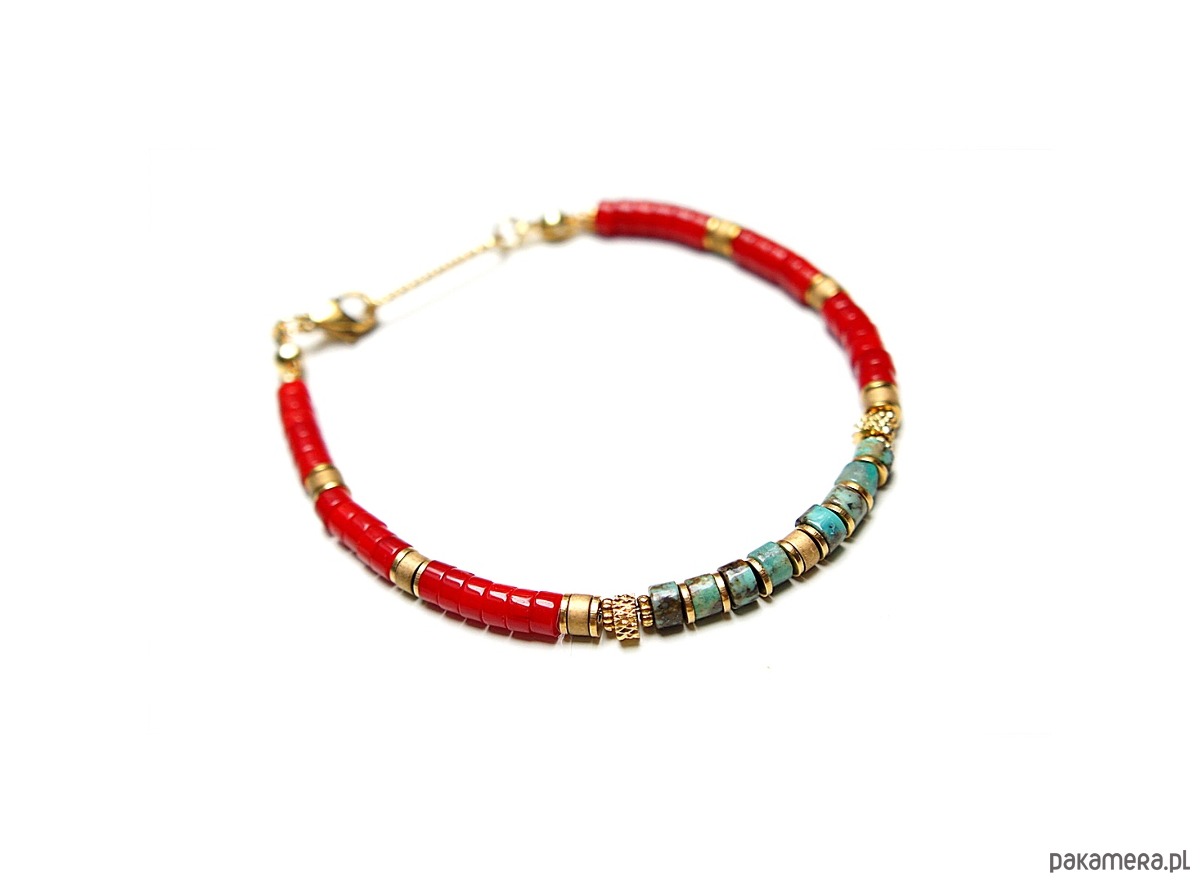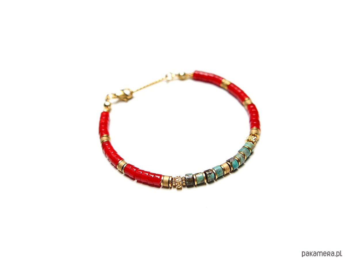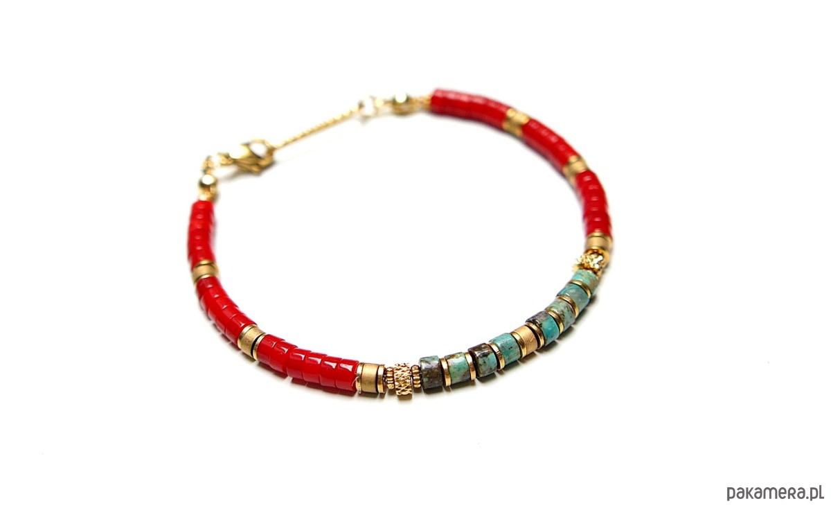 Bransoletka wykonana ze stali szlachetnej oraz naturalnych kamieni - talarków korala czerwonego [4 x 2mm], talarków matowego hematytu [4 x 2mm], talarków naturalnego turkusu [4 x 2mm]. Całkowita długość bransoletki: 20cm. Biżuteria ozdobnie zapakowana. Do kompletu można dokupić naszyjniki przedstawione na zdjęciu - dostępne w naszej galerii.