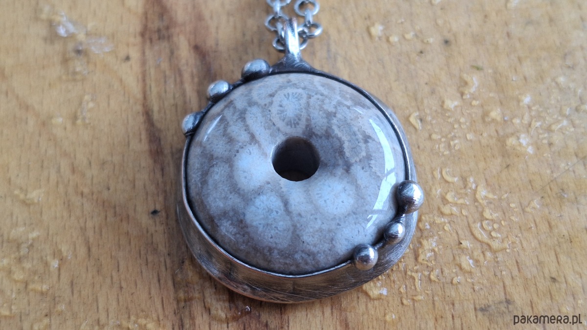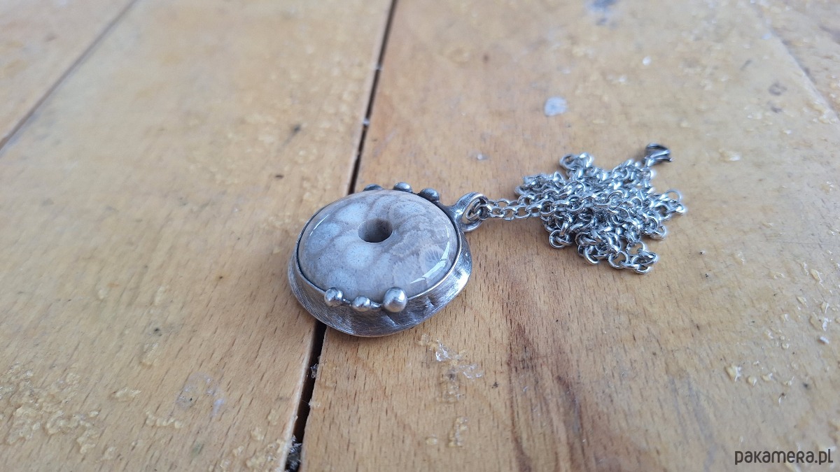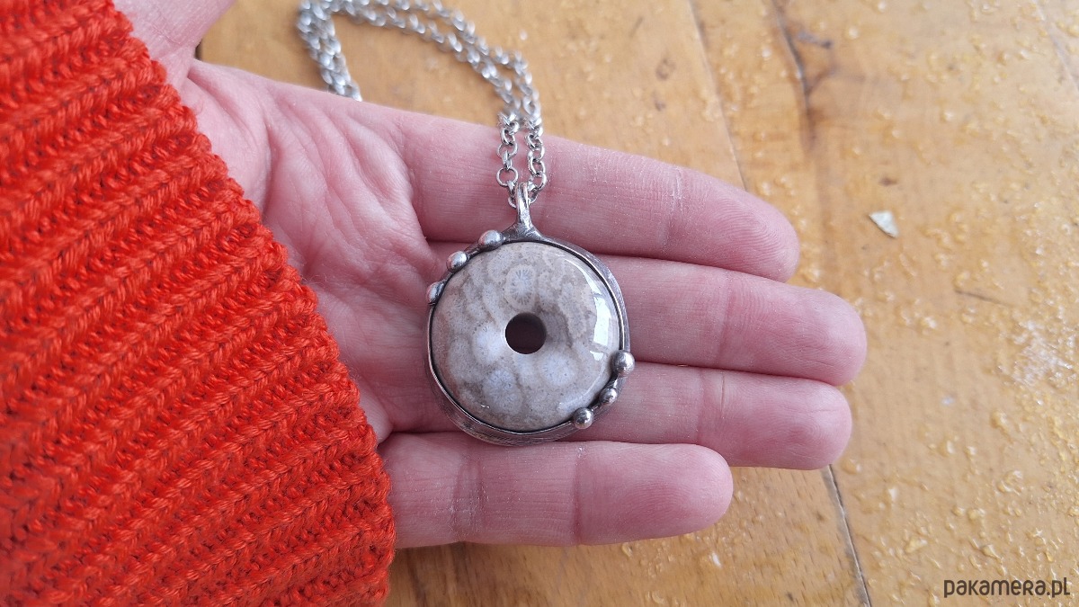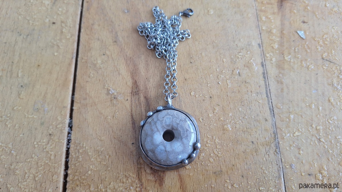Wisiorek wykonany z miedzi, cyny i koralowca. Wymiary ok. 3 na 3 cm. Zawieszony na łańcuszku o długości ok. 50 cm.