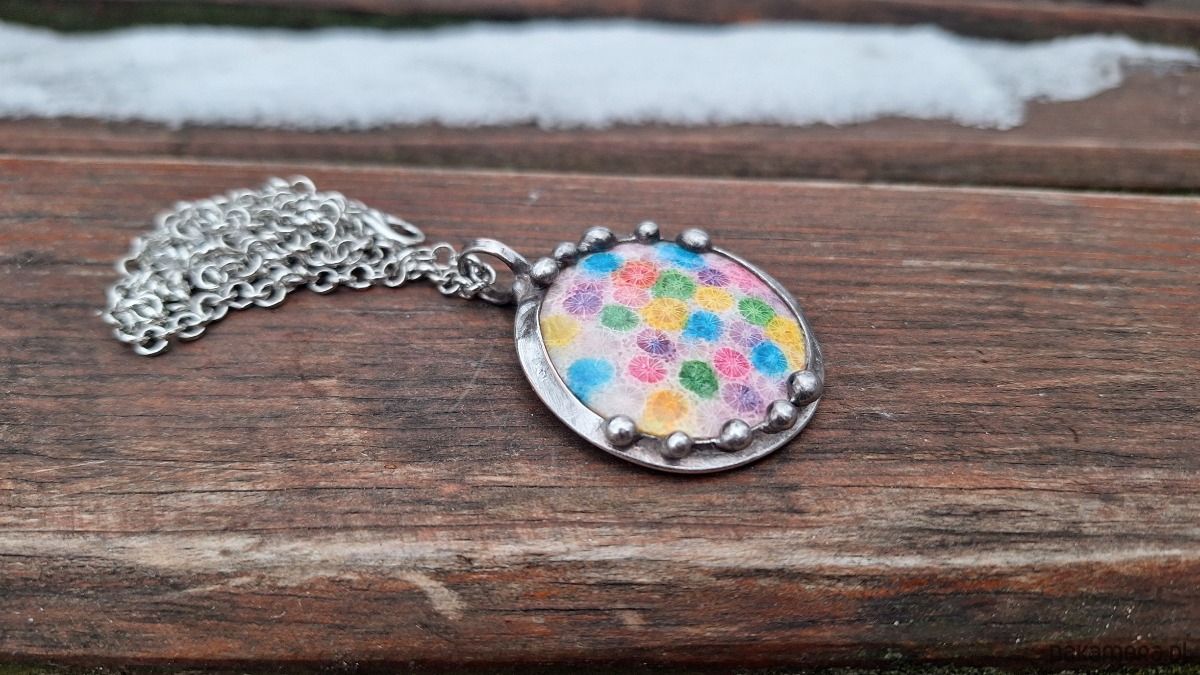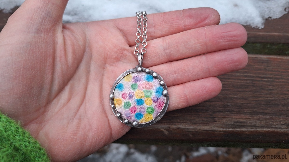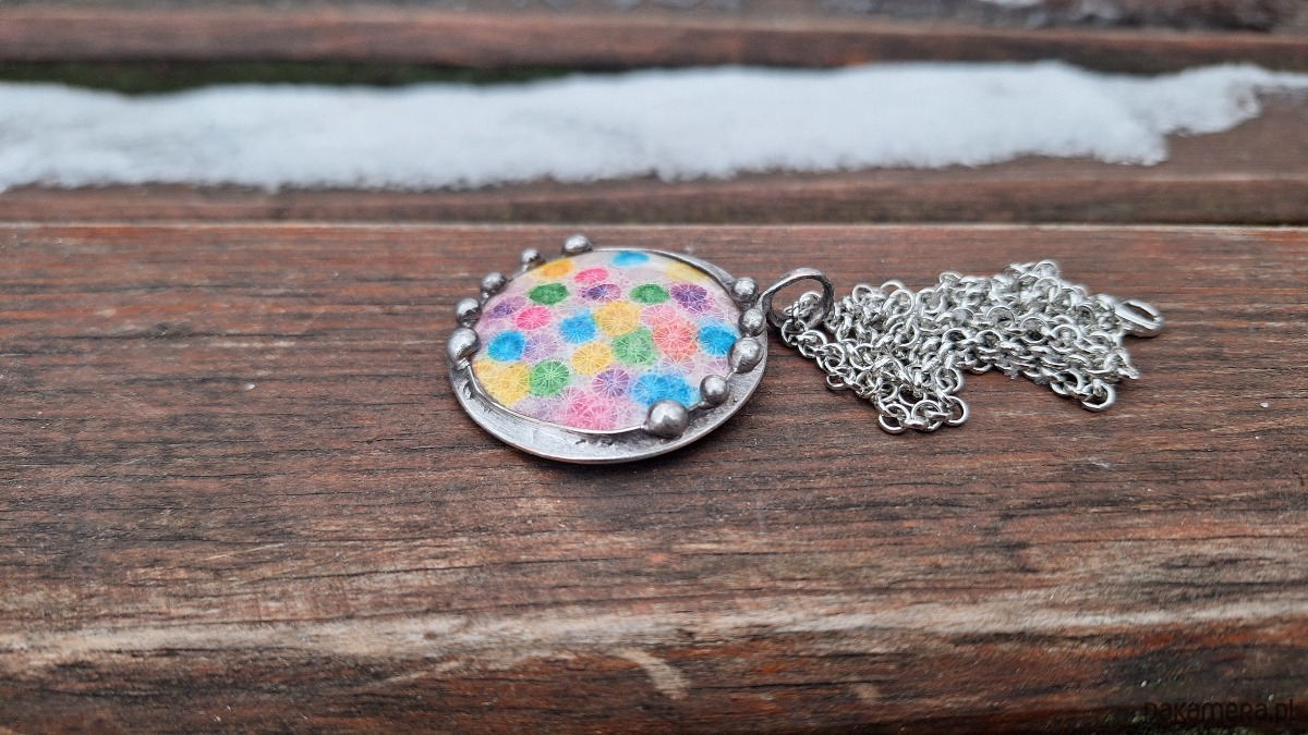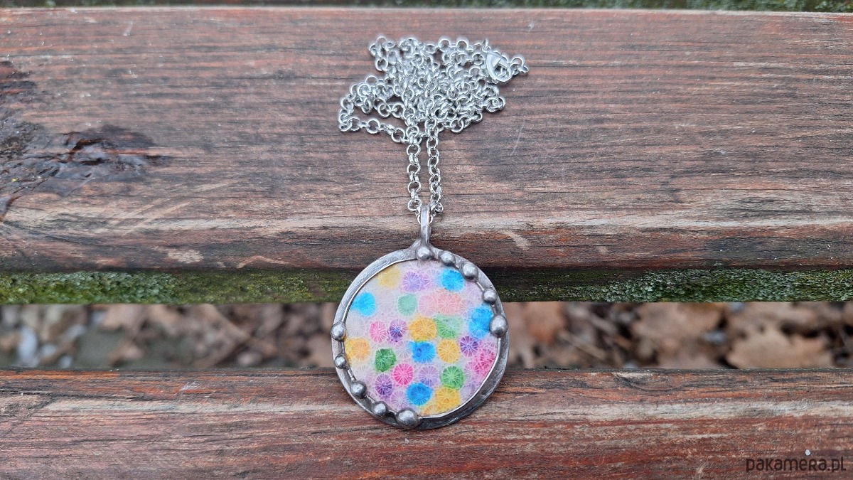 Wisiorek wykonany z miedzi, cyny i barwionego koralowca. Wymiary ok. 3.5 na 3.5 cm. Zawieszony na łańcuszku o długości ok. 50 cm.