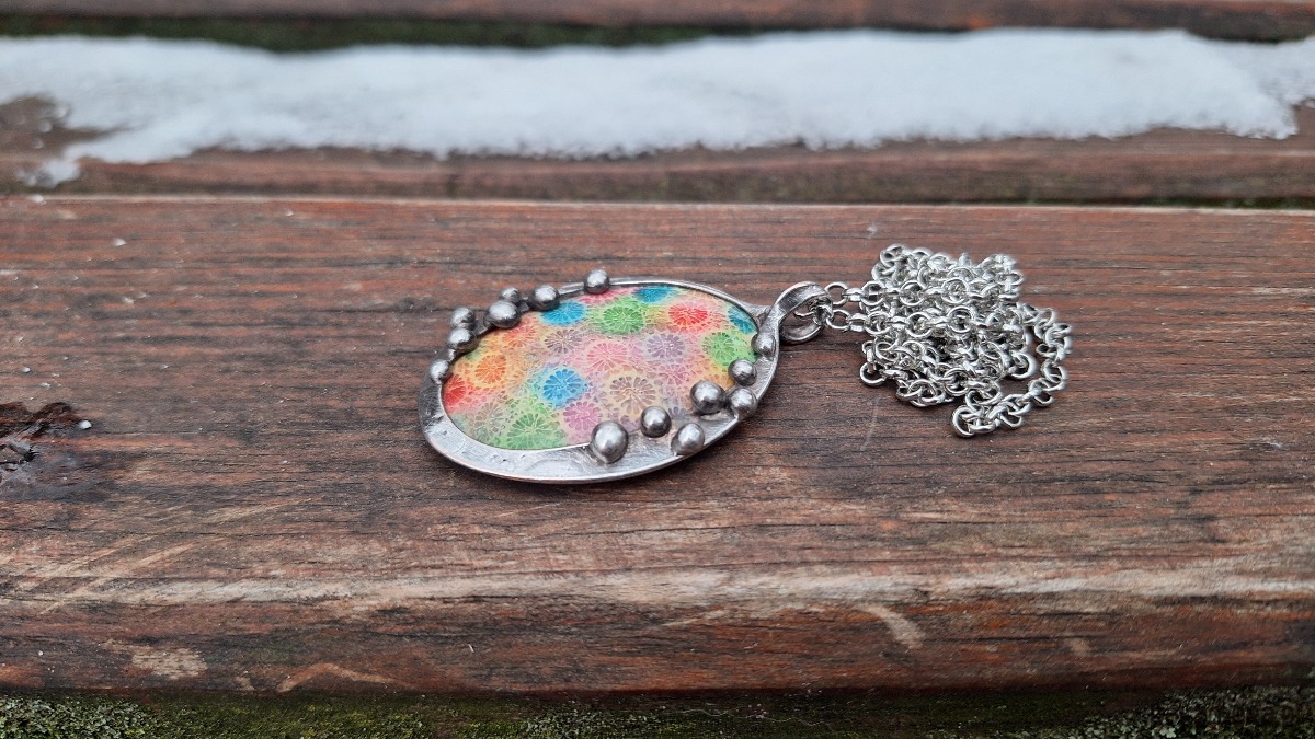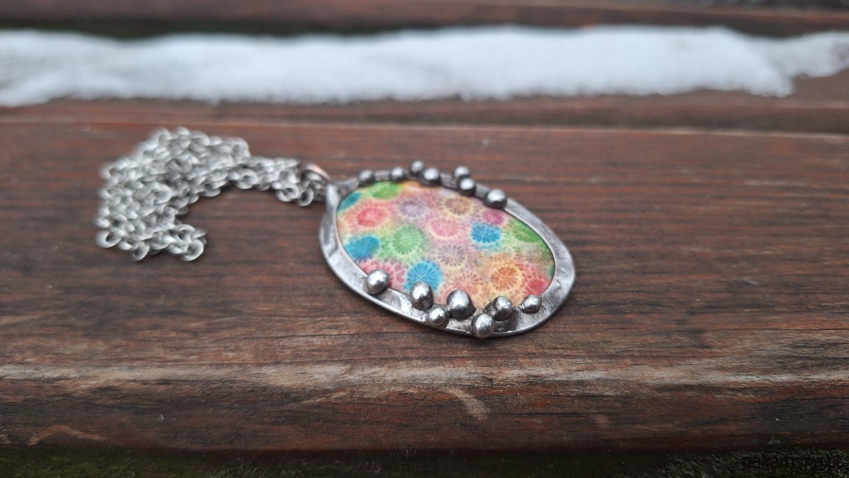 Wisiorek wykonany z miedzi, cyny i barwionego koralowca. Wymiary ok. 4.5 na 3.3 cm. Zawieszony na łańcuszku o długości ok. 50 cm.