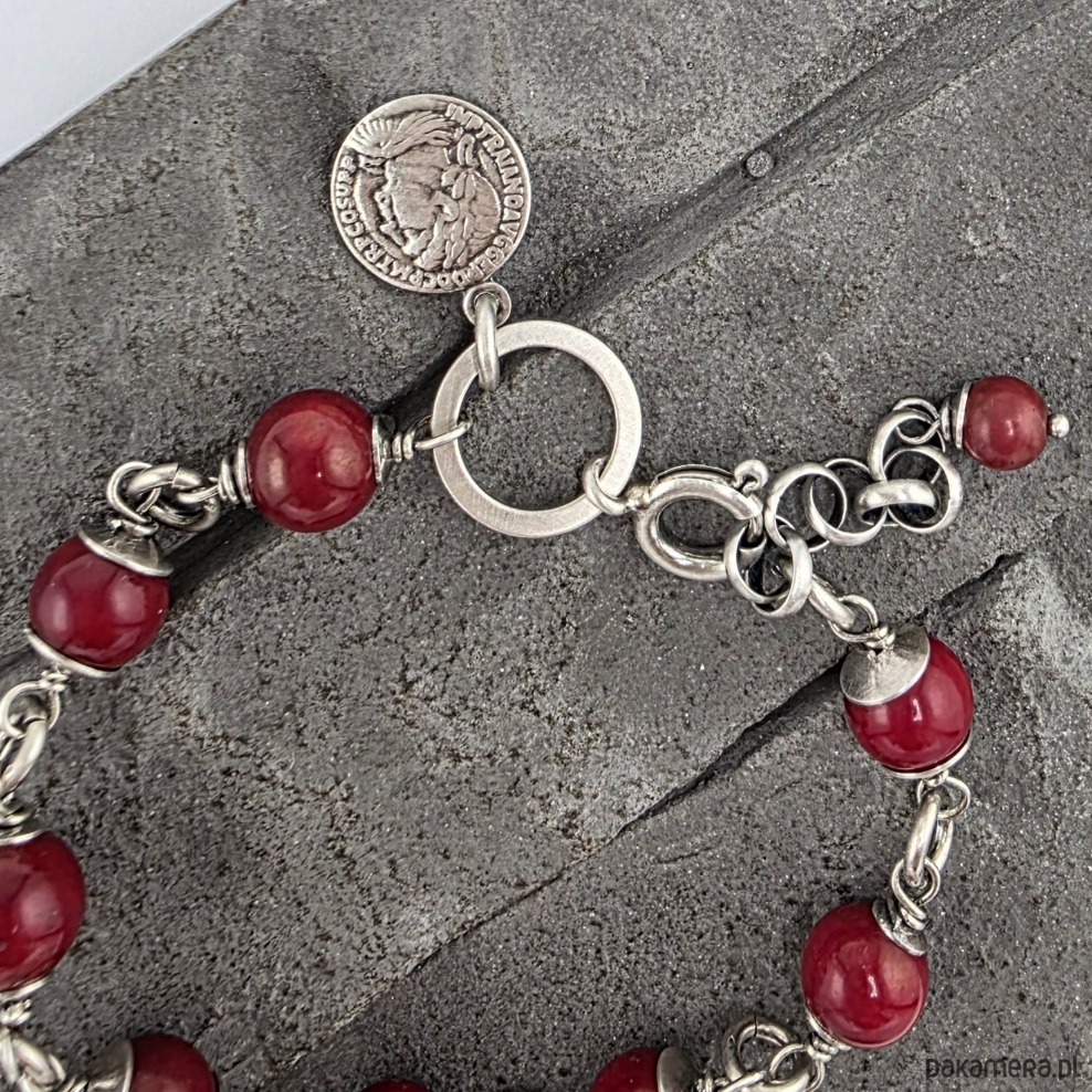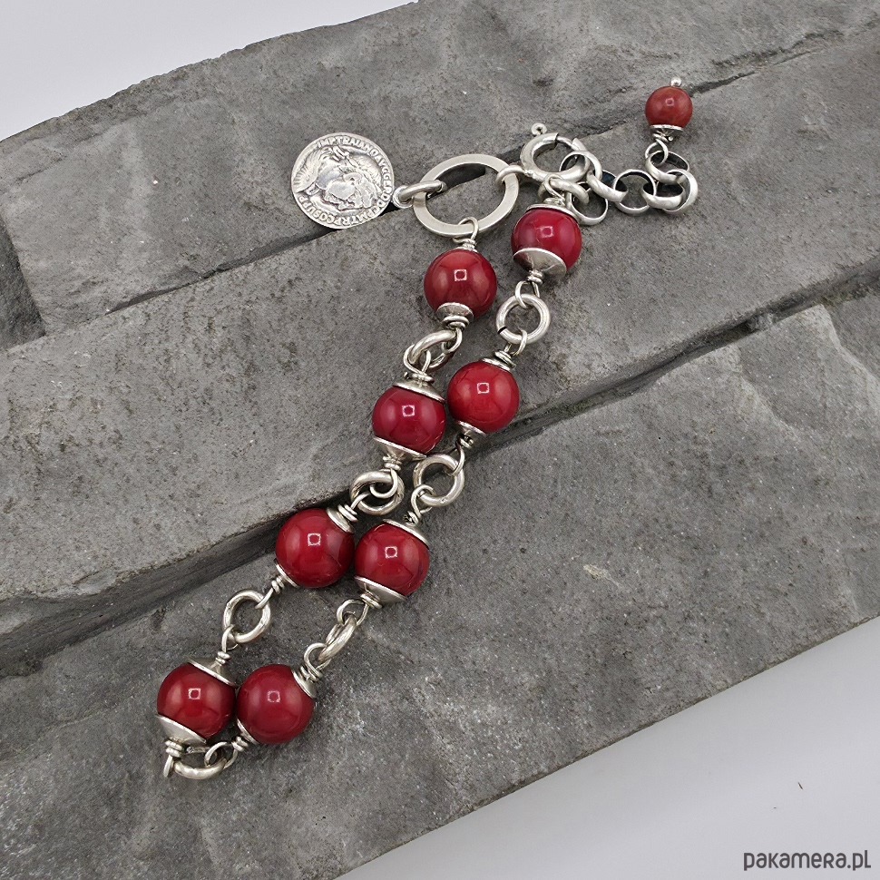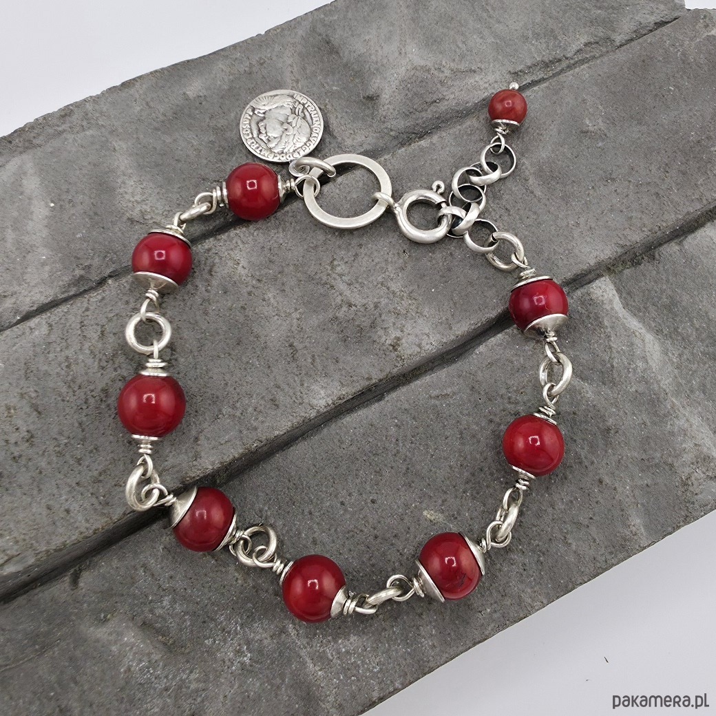 Kobieca i wyjątkowa bransoletka na co dzień i nie tylko. Wykonana w całości z oksydowanego srebra próby 925 oraz gladkich kulek czerwonego korala wielkości ok. 7,5-8 mm. Przy zapieciu zawieszka -srebrna moneta. Całkowita długość bransoletki regulowana od 17,5 cm do 20 cm. W mojej galerii kolczyki do kompletu. Na życzenie moge długość bransoletki zmienić lub wykonac z innymi kamieniami. Ozdobnie zapakowana.