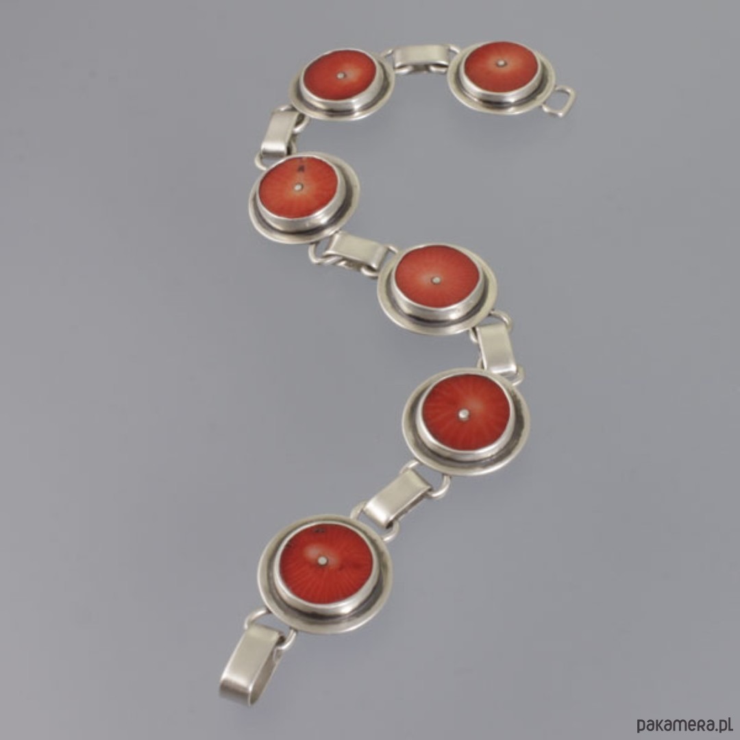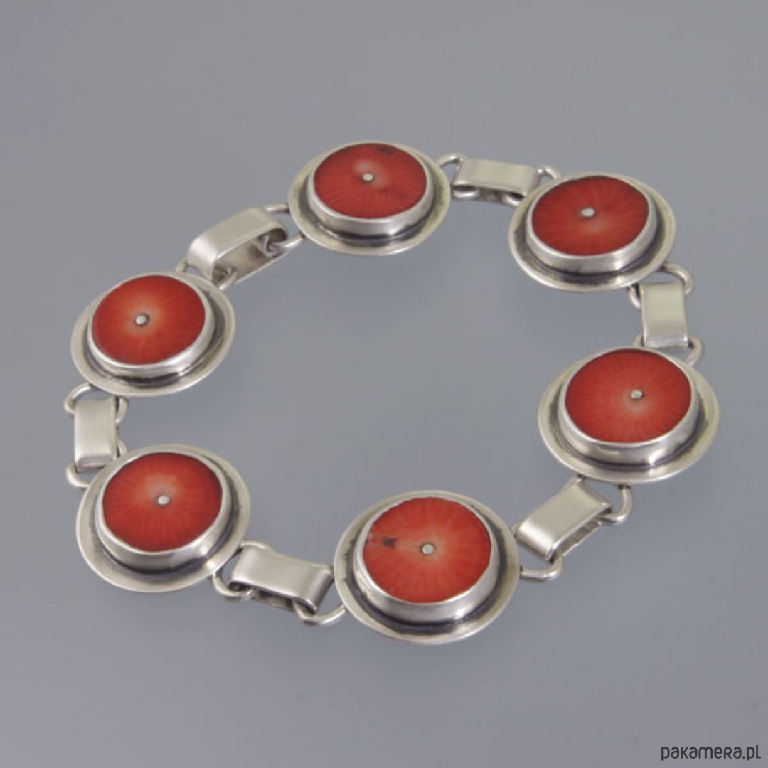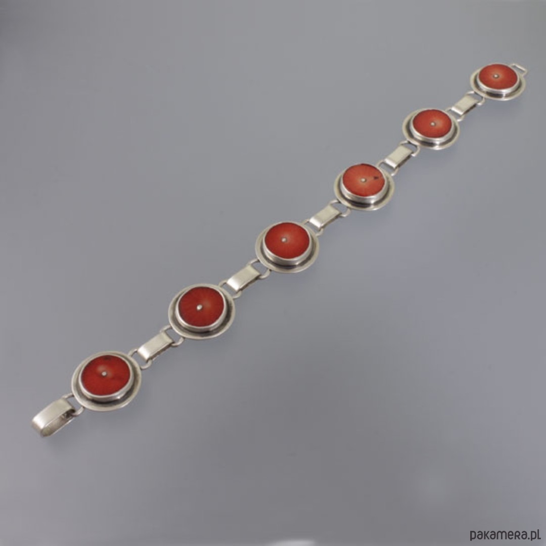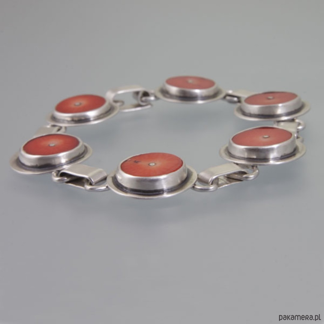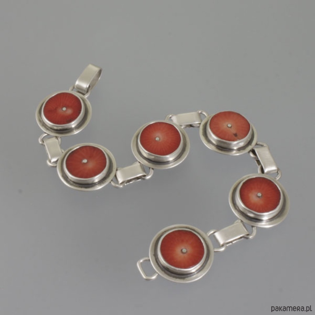 Ręcznie wykonana bransoletka z koralami. Srebro próby 925, próba wybita na spodzie. Średnica korala: 1,3 cm. Razem ze srebrnym elementem dookoła: 1,7 cm. Długość bransoletki: 18,4 cm. Waga: 19,2 g.