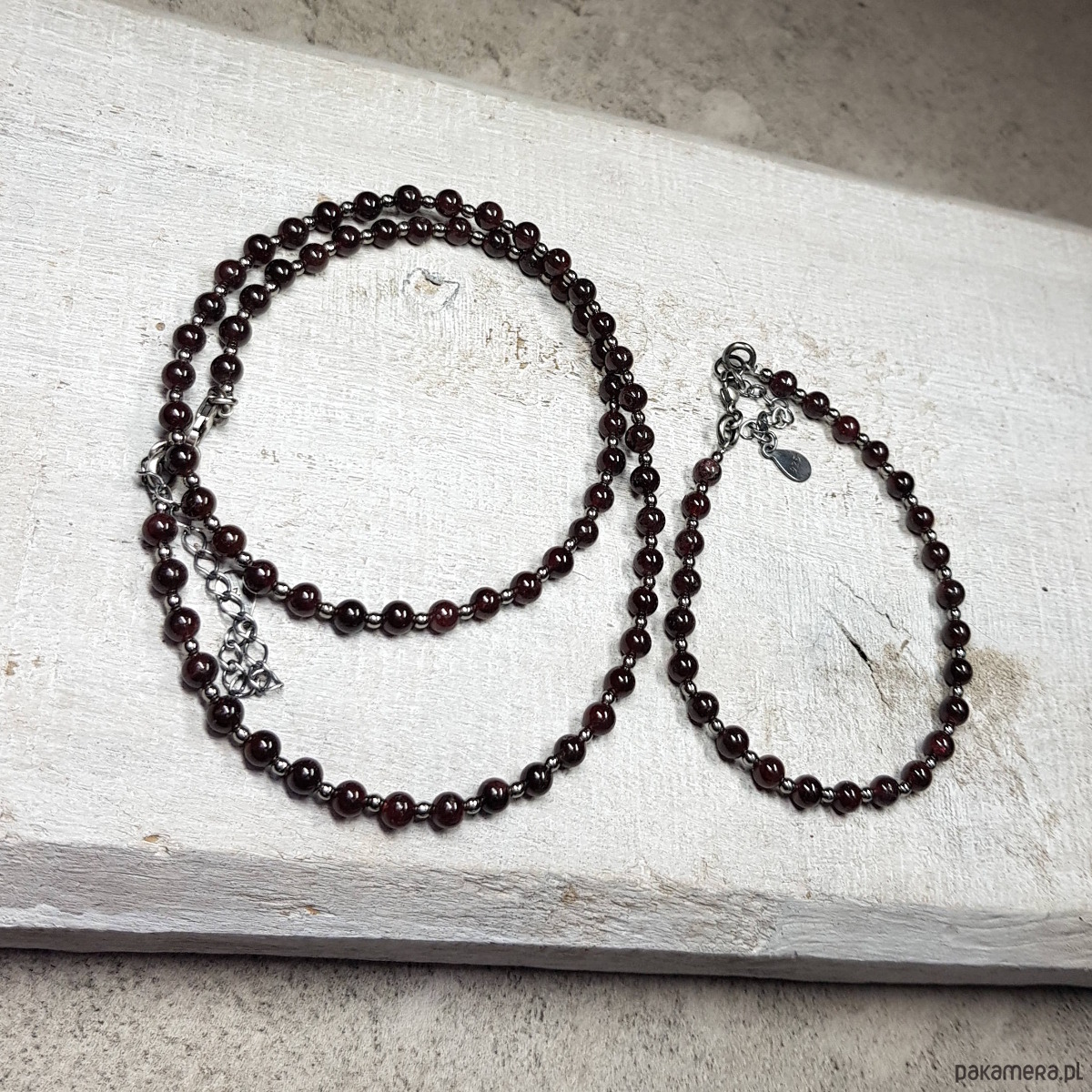Sznur korali wykonany z kulek 4mm naturalnego granatu w ciemno bordowym kolorze i malutkich 2mm przekładek hematytu. W komplecie bransoletka. Wykończenia i zapięcie wykonane w srebrze 925, oksydowanym i wypolerowanym. Długość korali wynosi 44cm plus przedłużka 5 cm. Bransoletka o długości 17cm plus przedłużka 3cm.