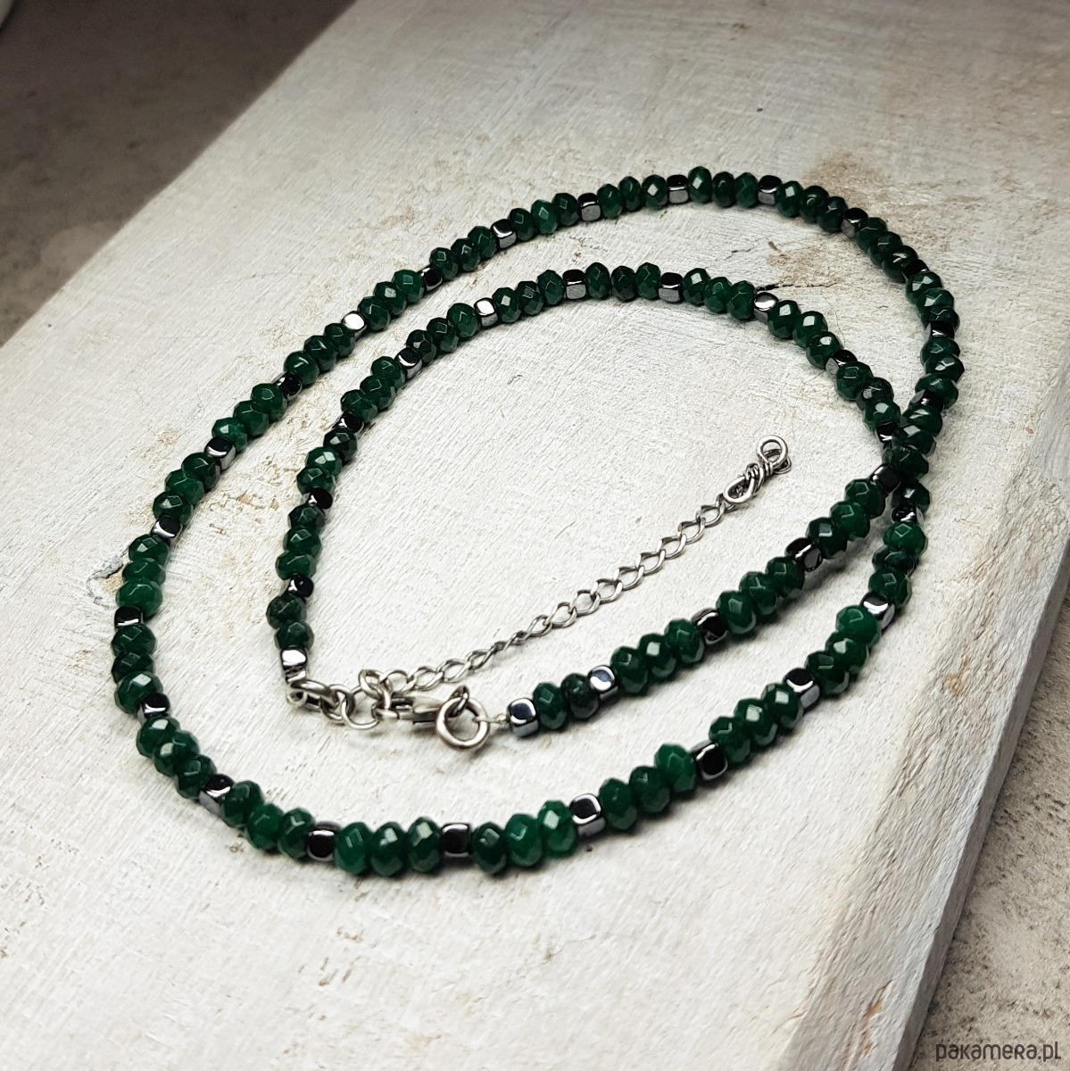 Sznur korali wykonany z fasetowanych kulek ciemno zielonego jadeitu około 4,5mm i przekładek hematytu. Wykończenia i zapięcie wykonane w srebrze 925, oksydowanym i wypolerowanym. Długość korali wynosi 47cm plus przedłużka 4 cm.