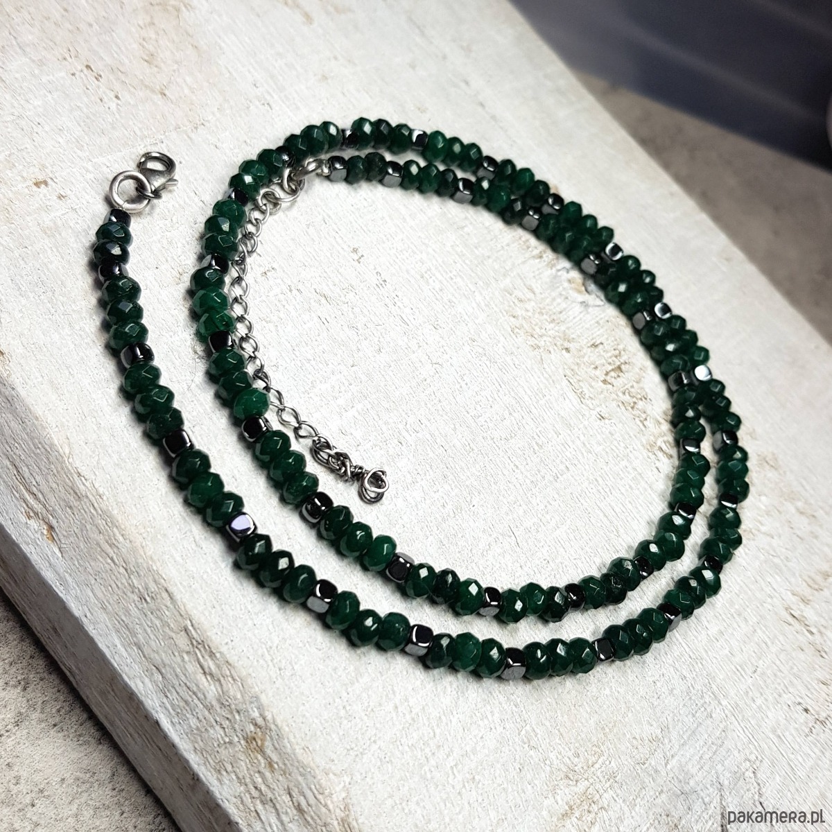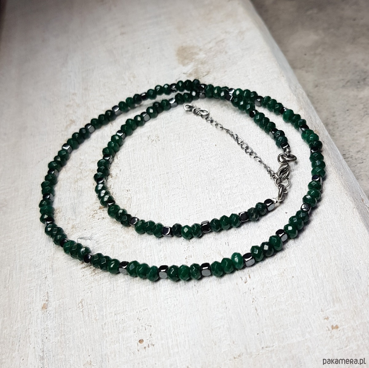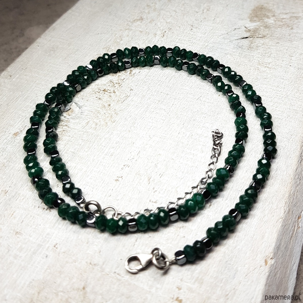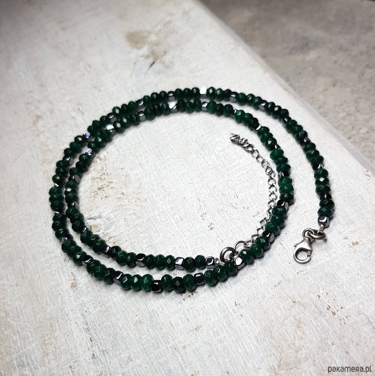 Sznur korali wykonany z fasetowanych kulek ciemno zielonego jadeitu około 4,5mm i przekładek hematytu. Wykończenia i zapięcie wykonane w srebrze 925, oksydowanym i wypolerowanym. Długość korali wynosi 47cm plus przedłużka 4 cm.