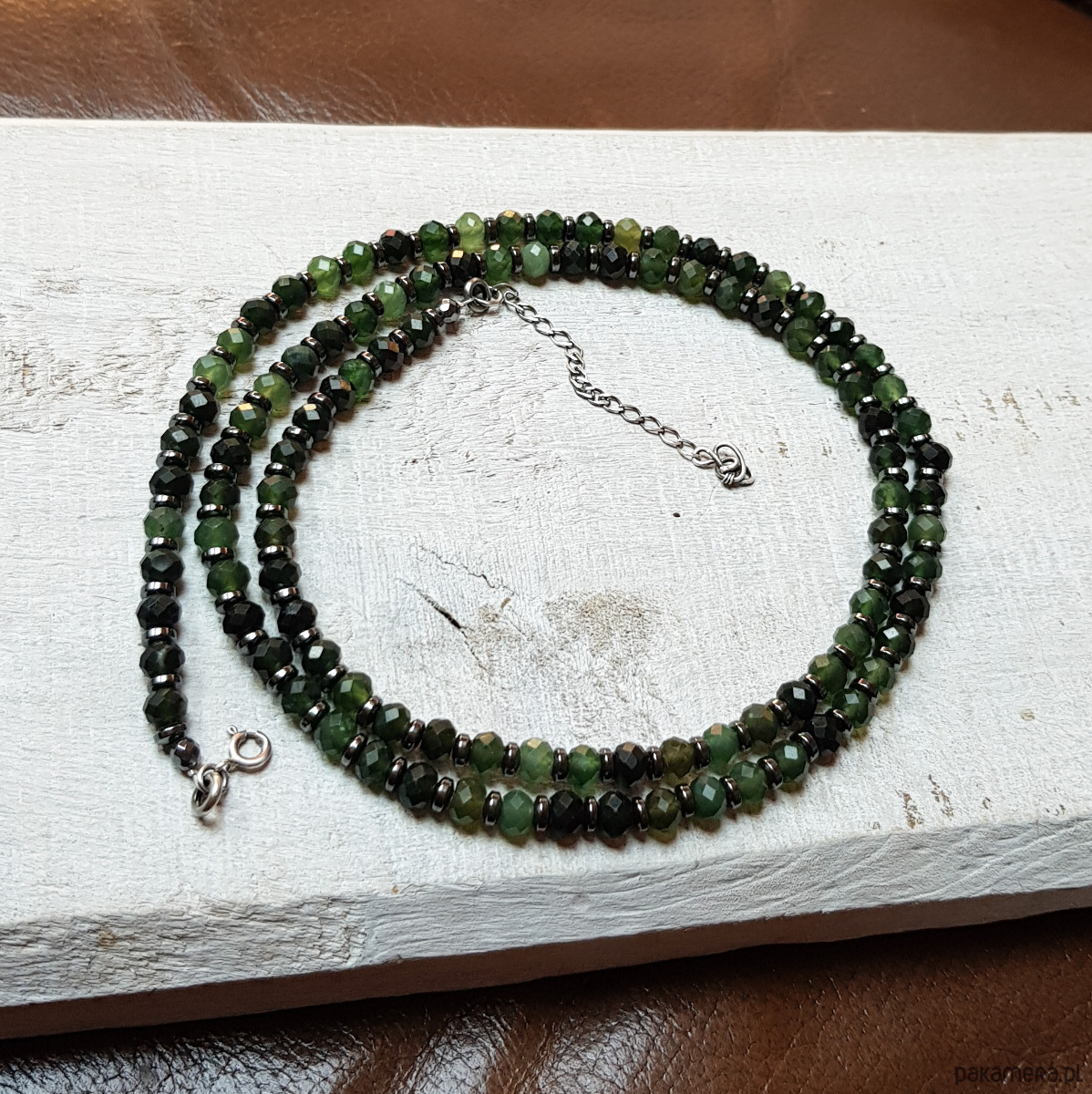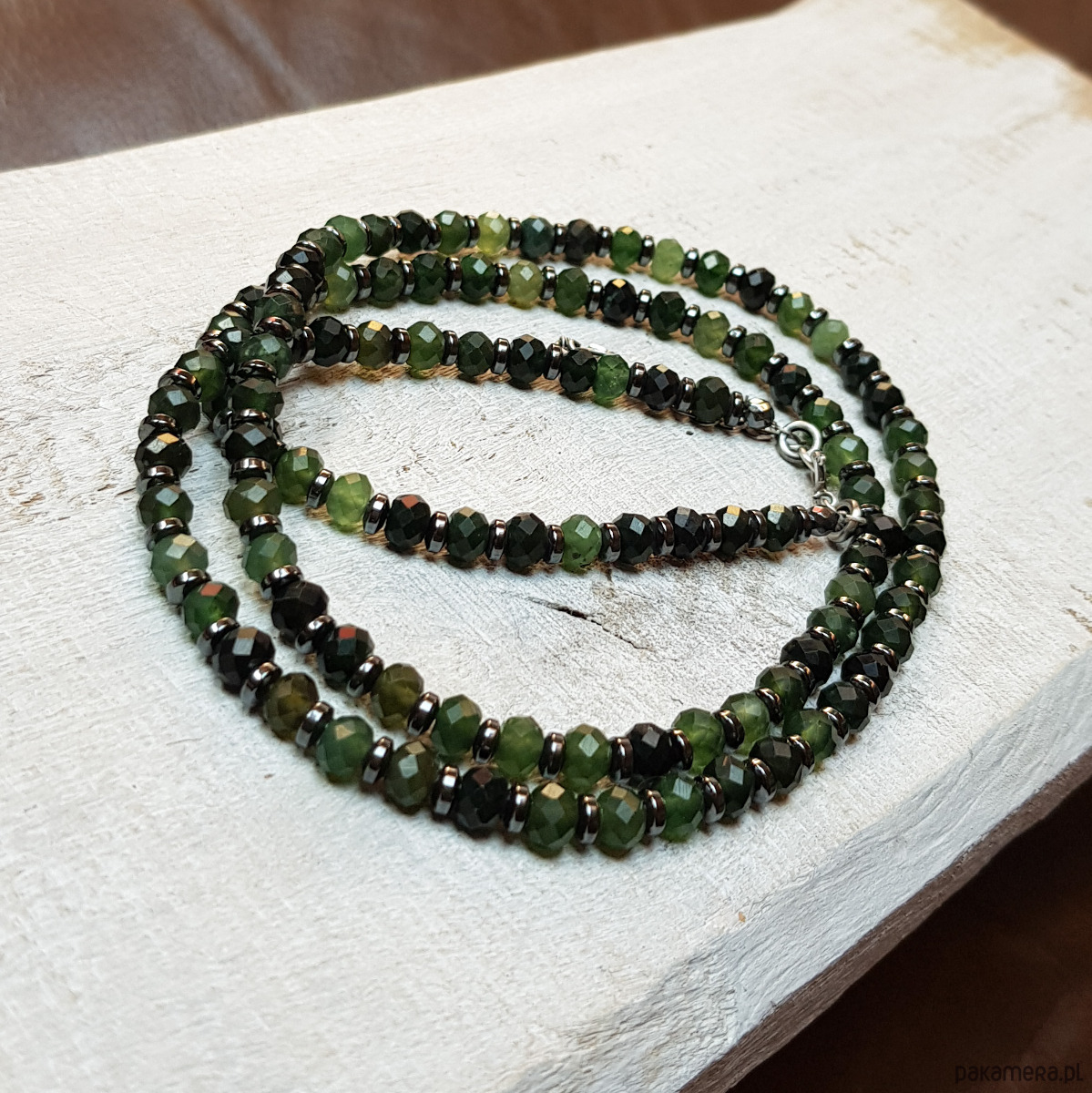 Sznur korali wykonany z ciemno zielonego jadeitu kanadyjskiego w kształcie fasetowanych oponek o wymiarach 5,5x4mm i przekładek hematytu. Wykończenia i zapięcie wykonane w srebrze 925, oksydowanym i wypolerowanym. Długość korali wynosi 68,5cm plus przedłużka 5 cm.