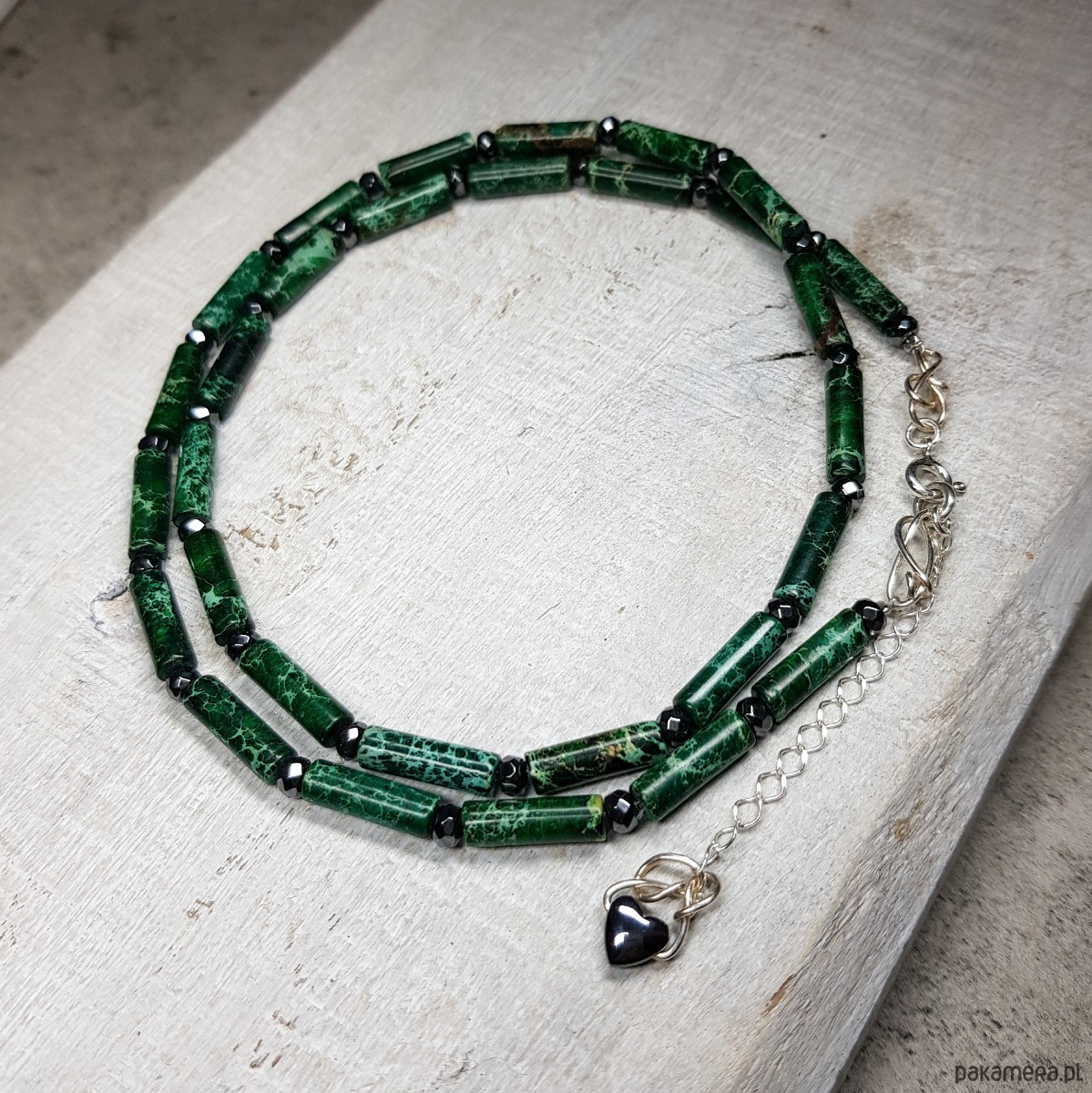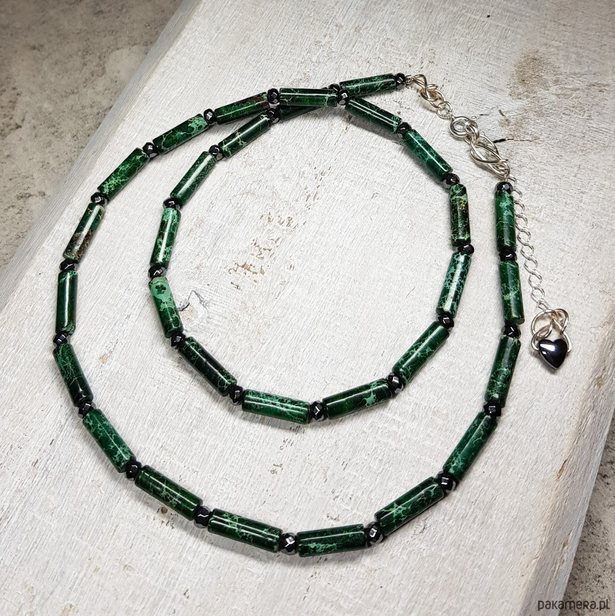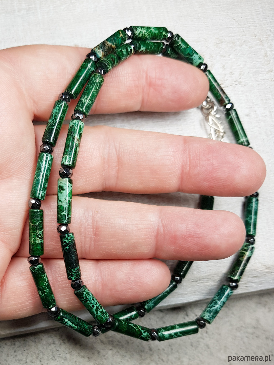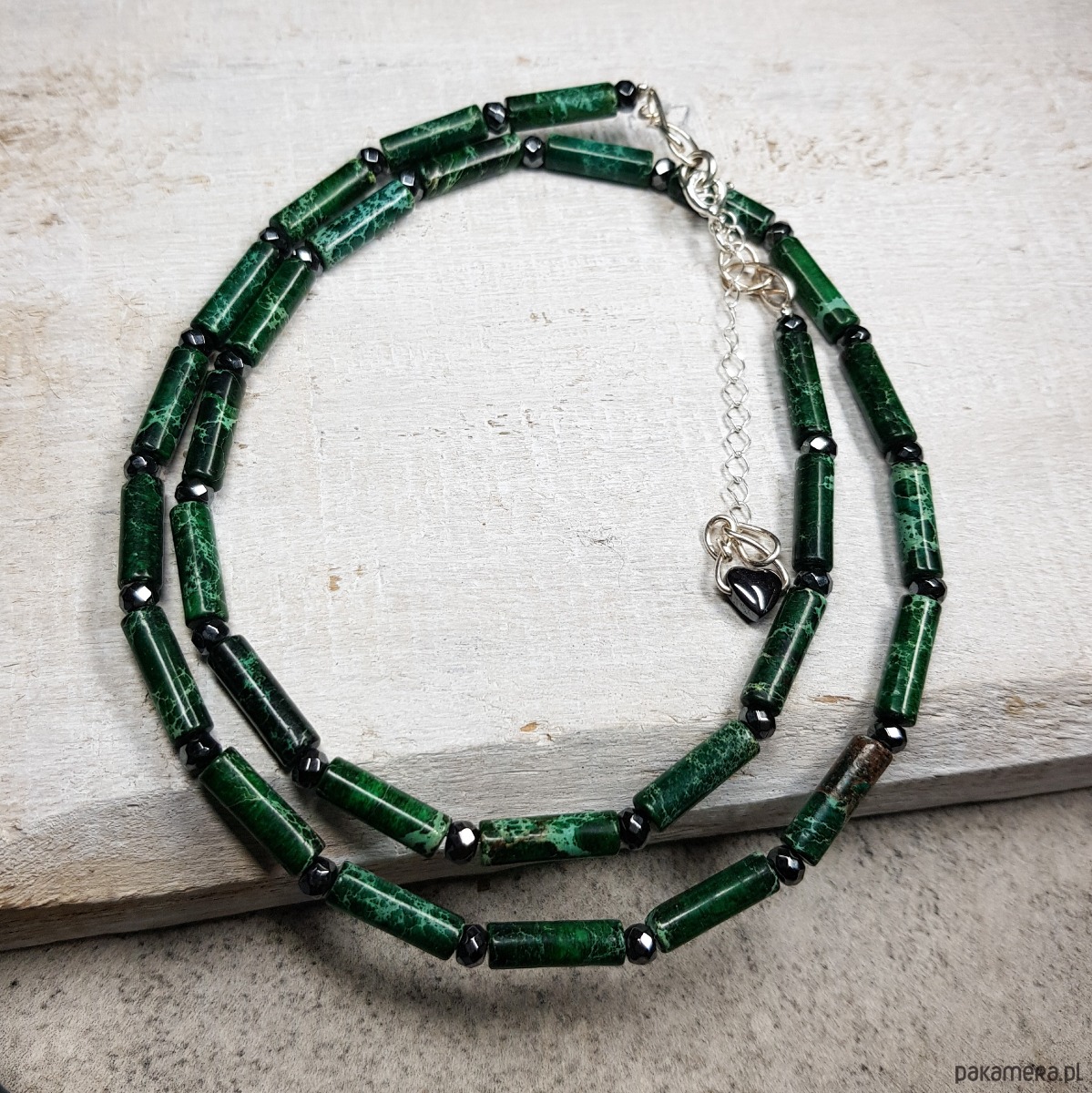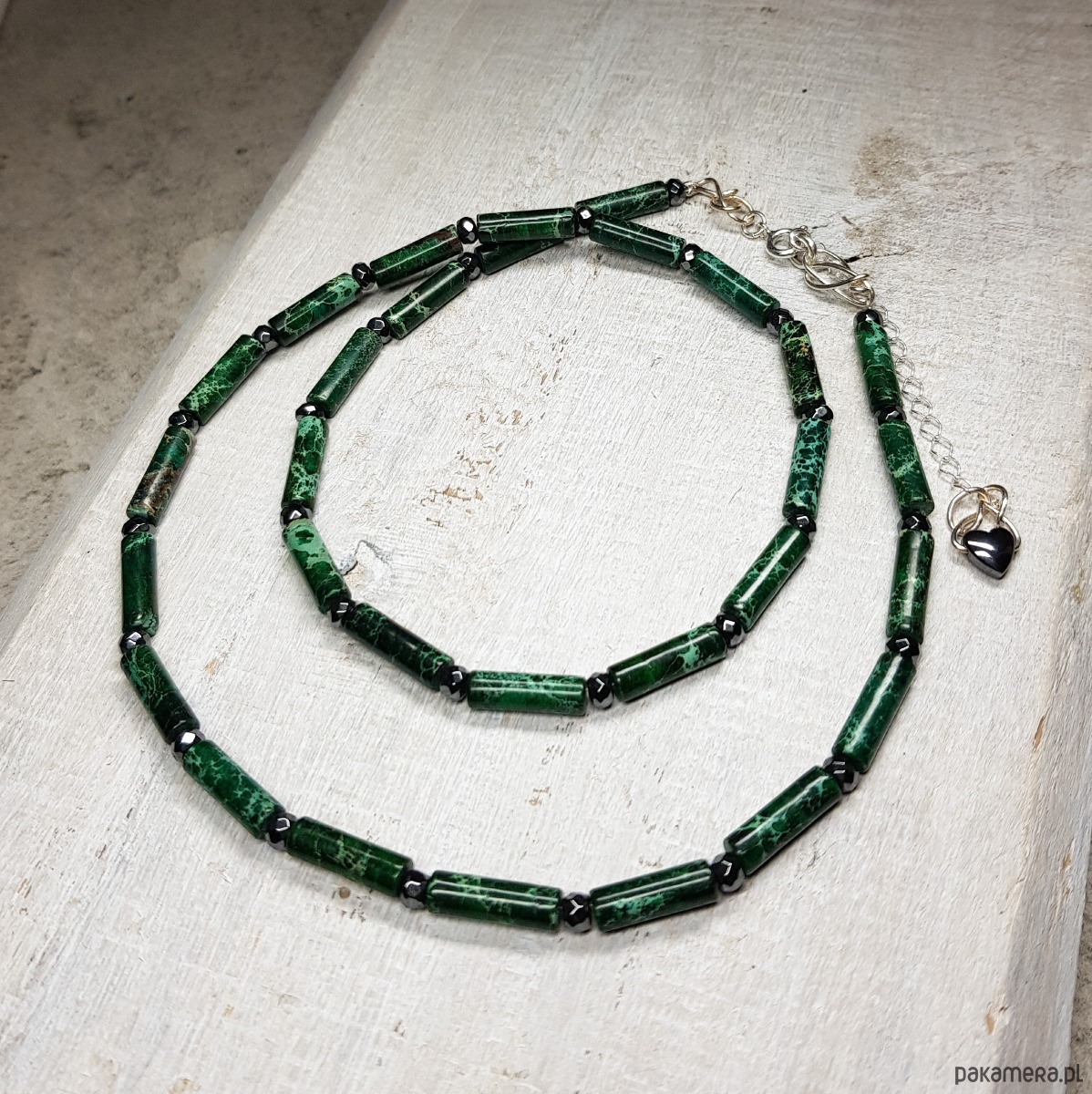 Sznur korali wykonany z walców 13x4mm ciemno zielonego jjaspisu cesarskiego i przekładek hematytu. Wykończenia i zapięcie wykonane w srebrze 925. Długość korali wynosi 47,5cm plus przedłużka 4,5 cm.