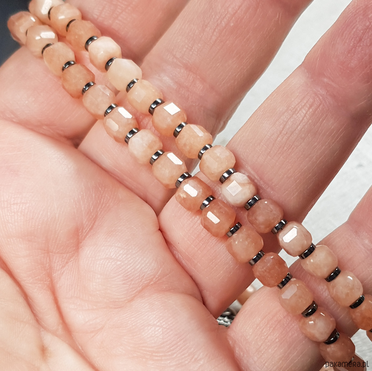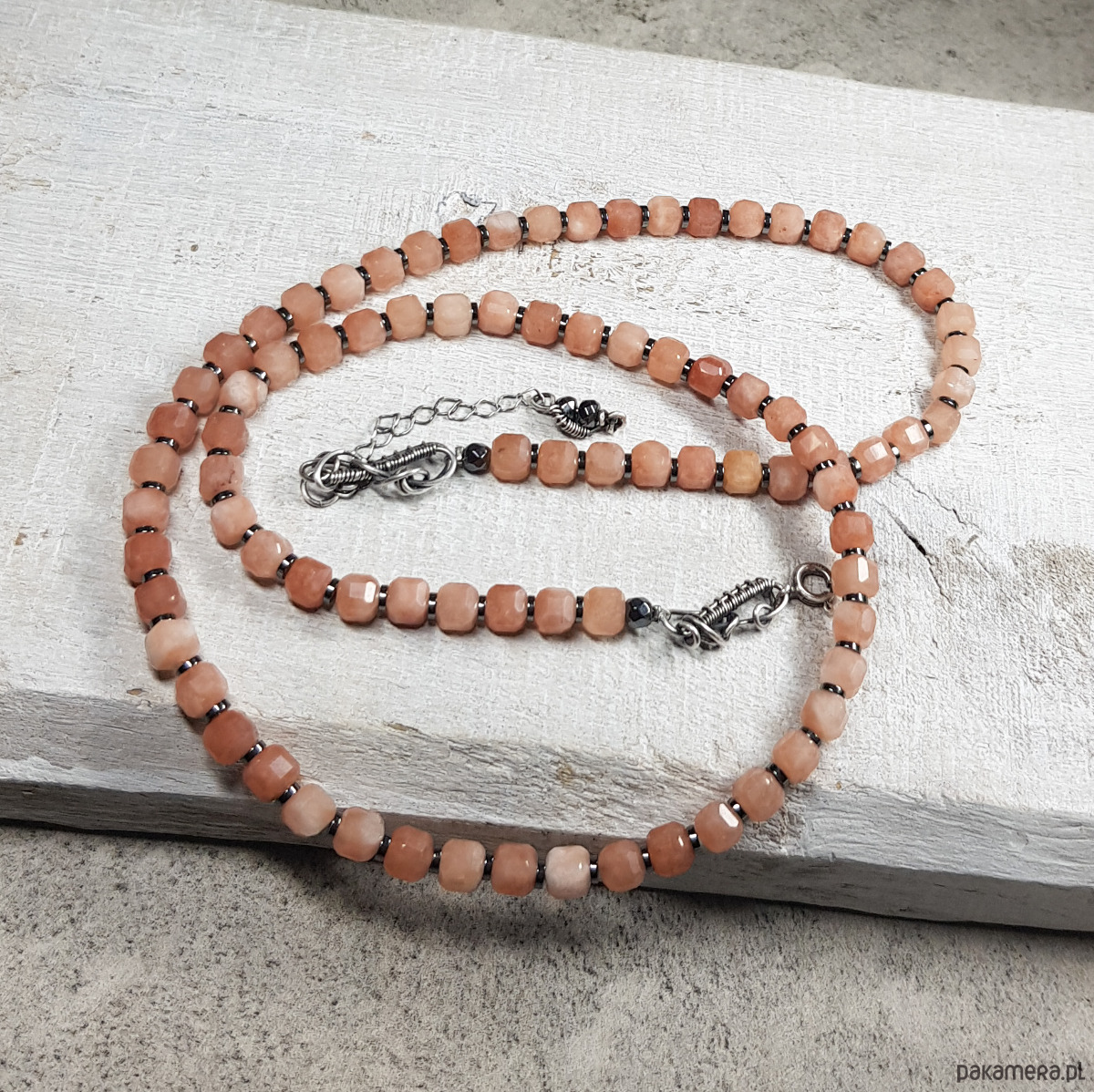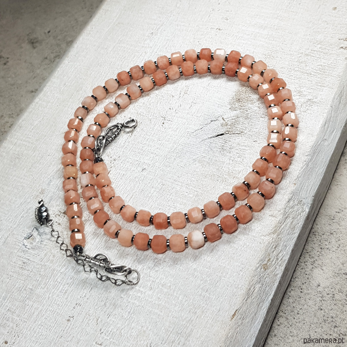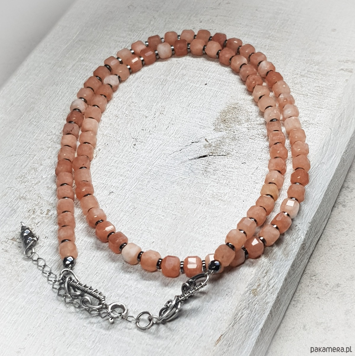Sznur korali wykonany ręcznie z naturalnych fasetowanych kwadratów 5-6mm kamienia słonecznego i z przekładek hematytu. Użyte kostki kamienia słonecznego są bardzo wysokiej jakości, pięknie wypolerowane, o dużym połysku. Wykończenia i zapięcie wykonane w srebrze 925, oksydowanym i wypolerowanym. Długość korali wynosi ok. 59cm plus przedłużka 4,5cm.