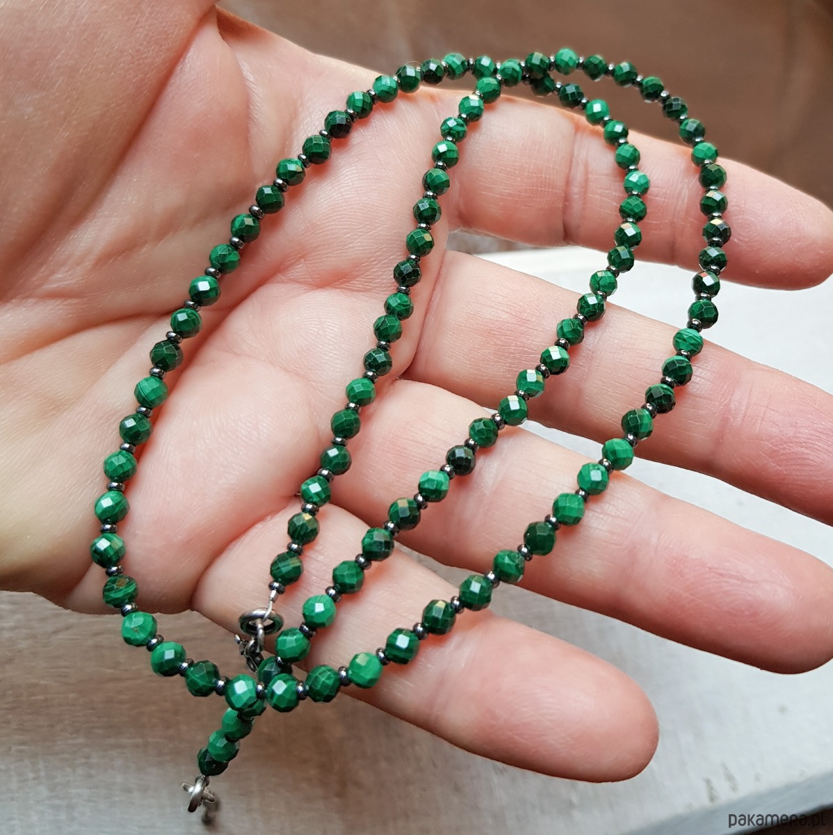 Sznur korali wykonany ręcznie z naturalnych fasetowanych kulek 4mm pięknie szlifowanego naturalnego malachitu i malutkich 1mm przekładek hematytu. Użyte koraliki malachitu są bardzo wysokiej jakości, pięknie wypolerowane, o dużym połysku. Wykończenia i zapięcie wykonane w srebrze 925, oksydowanym i wypolerowanym. Długość korali wynosi ok. 51,5cm plus przedłużka 5cm.