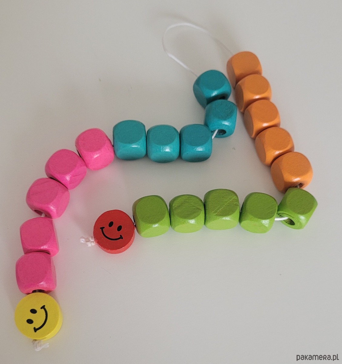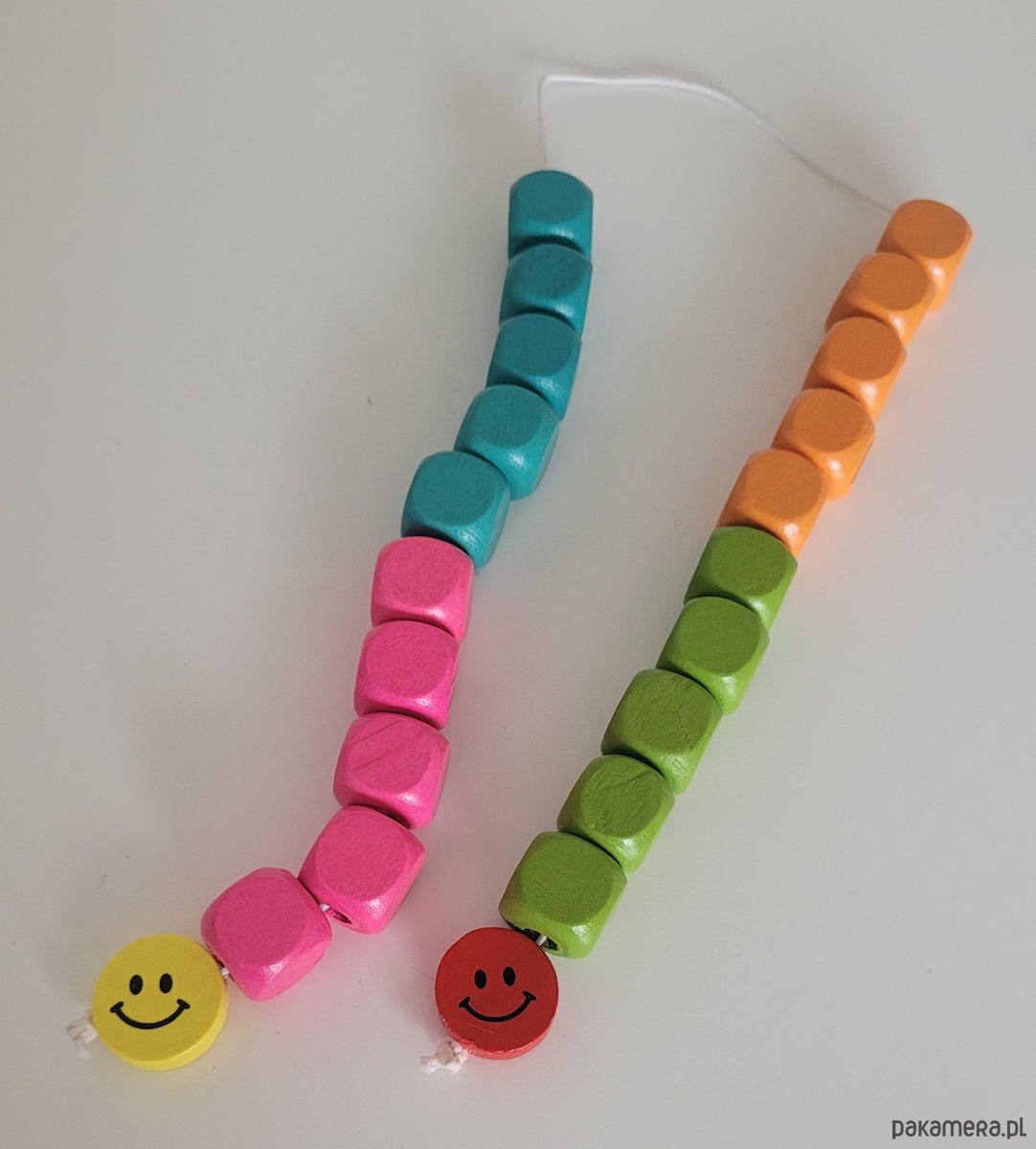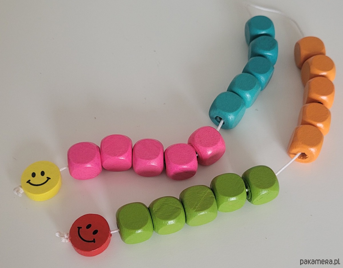 Sznur kolorowych,drewnianych korali do nauki liczenia do dwudziestu przeznaczone dla dzieci powyżej 5-go roku życia.